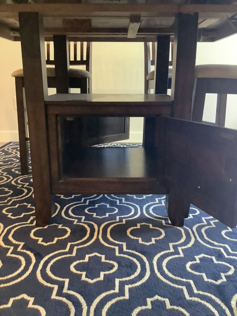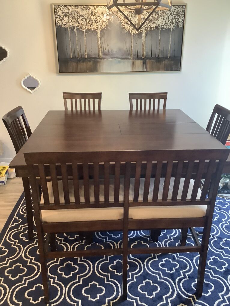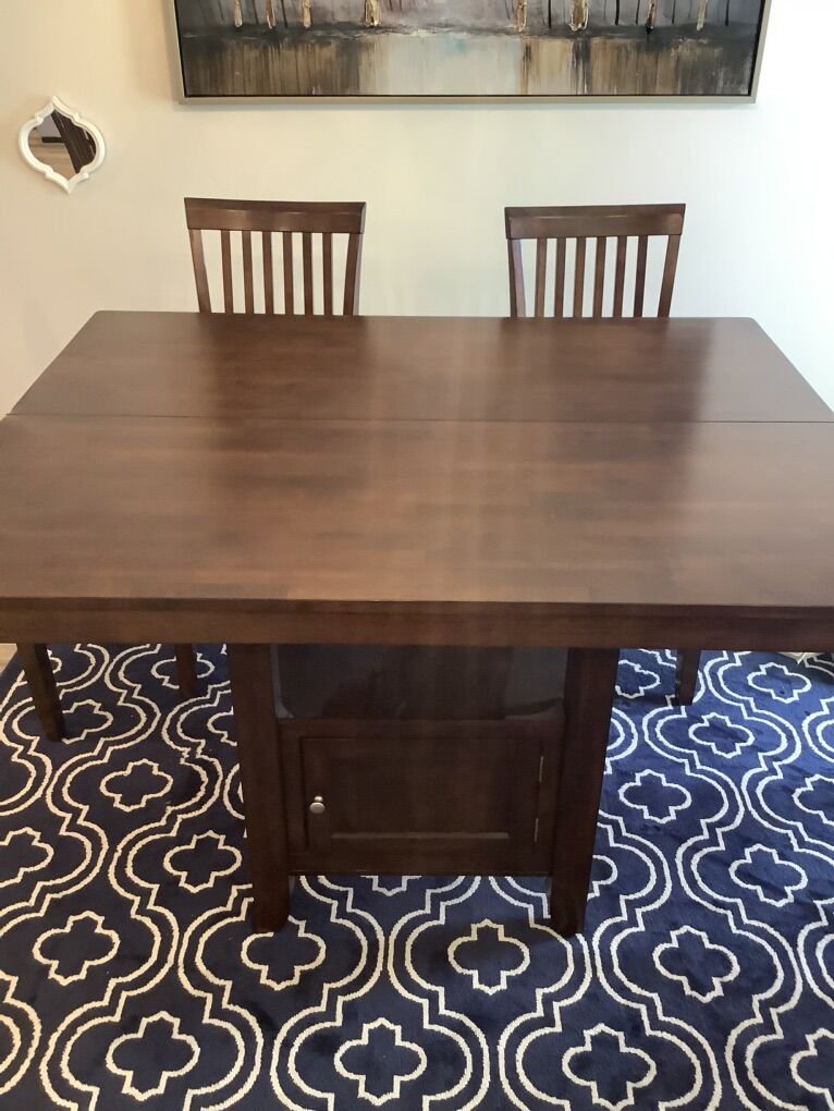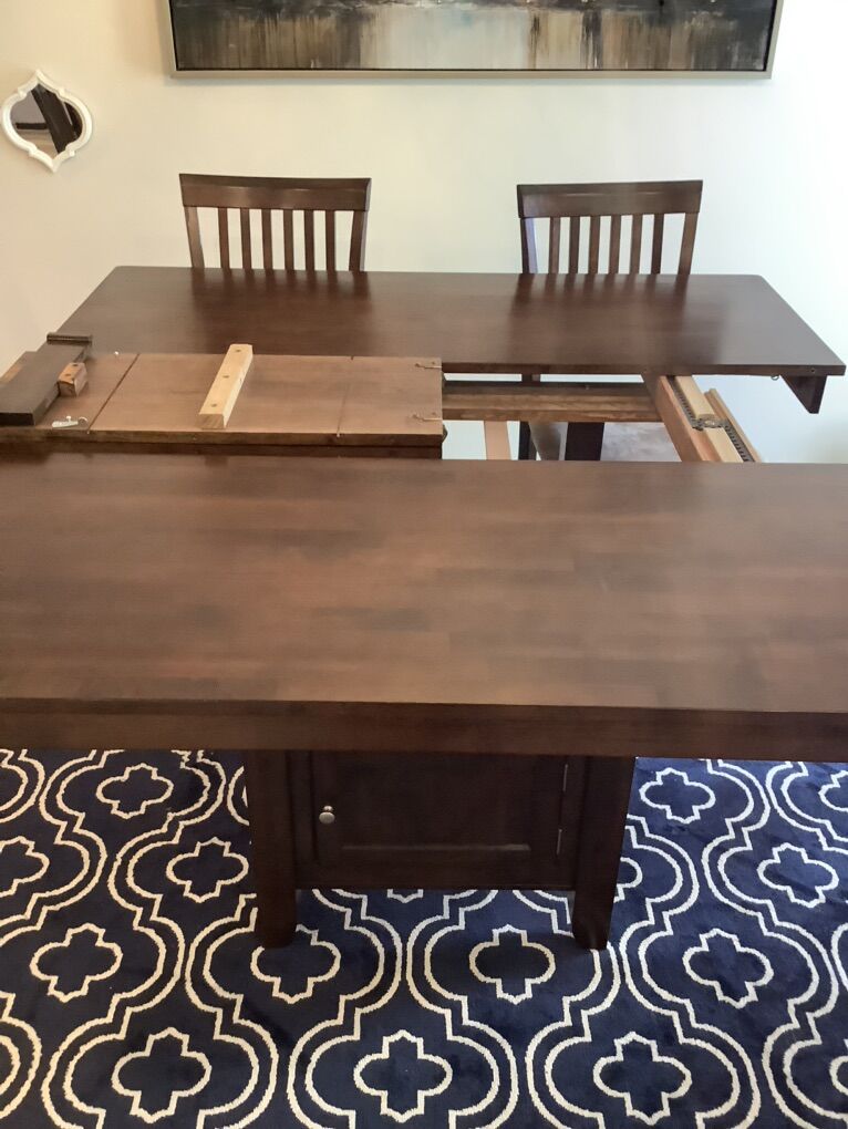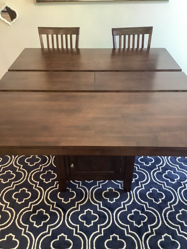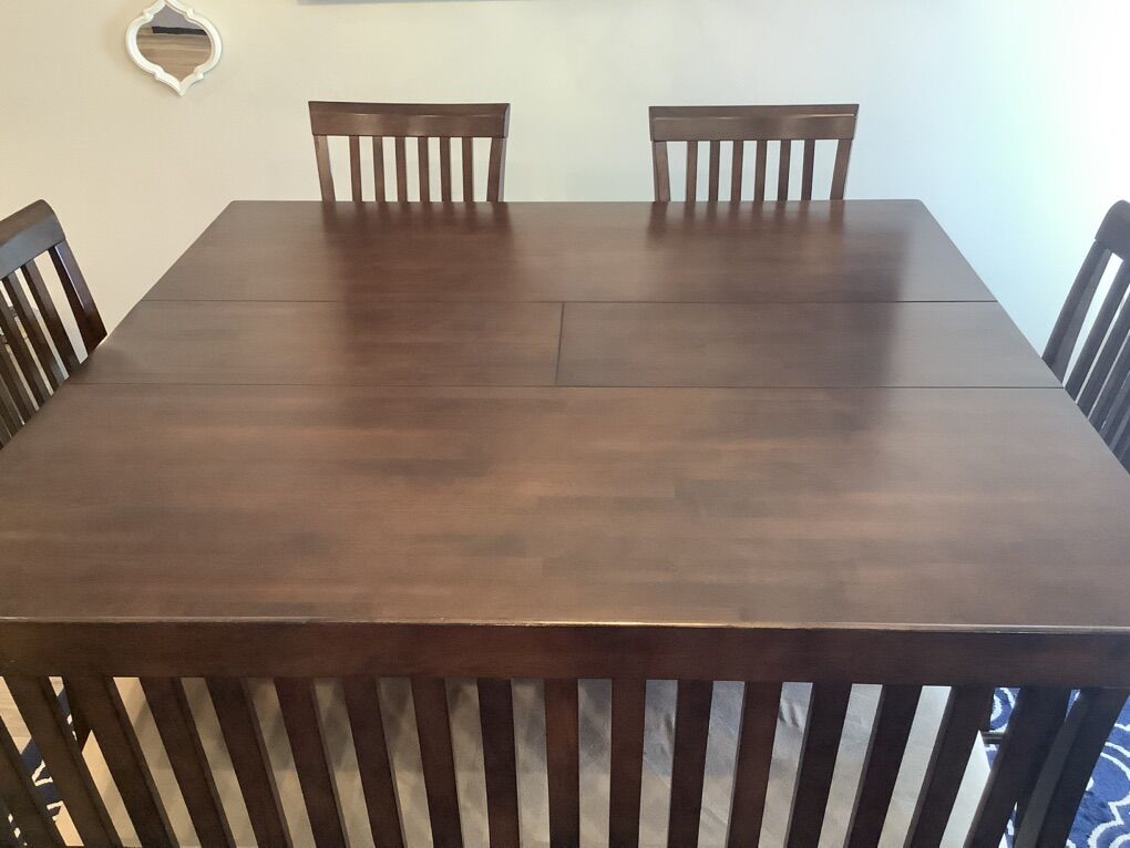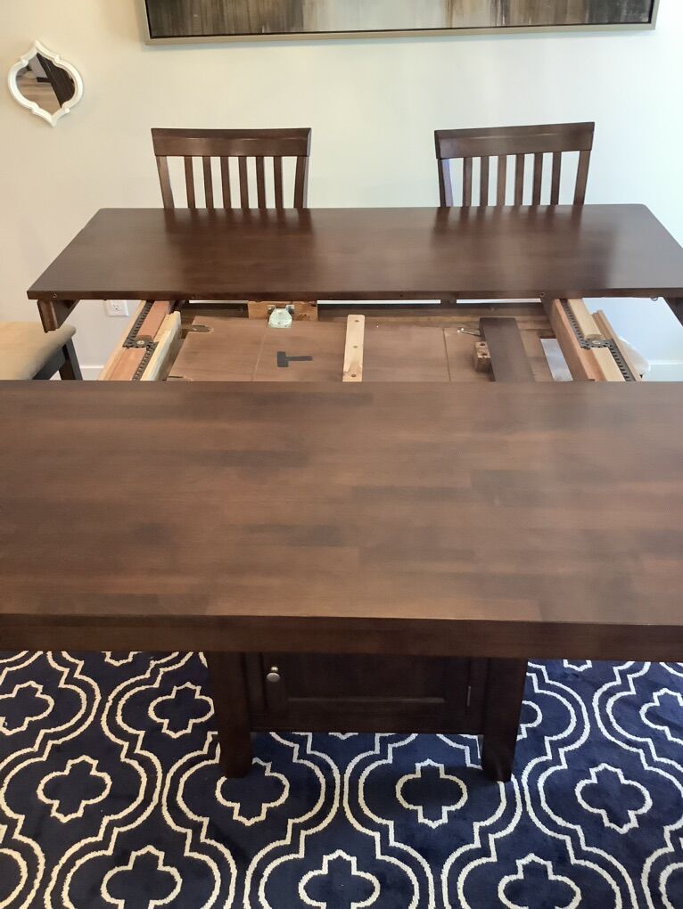 This beautiful dining room table has been hardly used and is in like-new condition. The sleek, modern design features an easy-to-use removable leaf, allowing you to adjust the size effortlessly to fit your space or gathering.