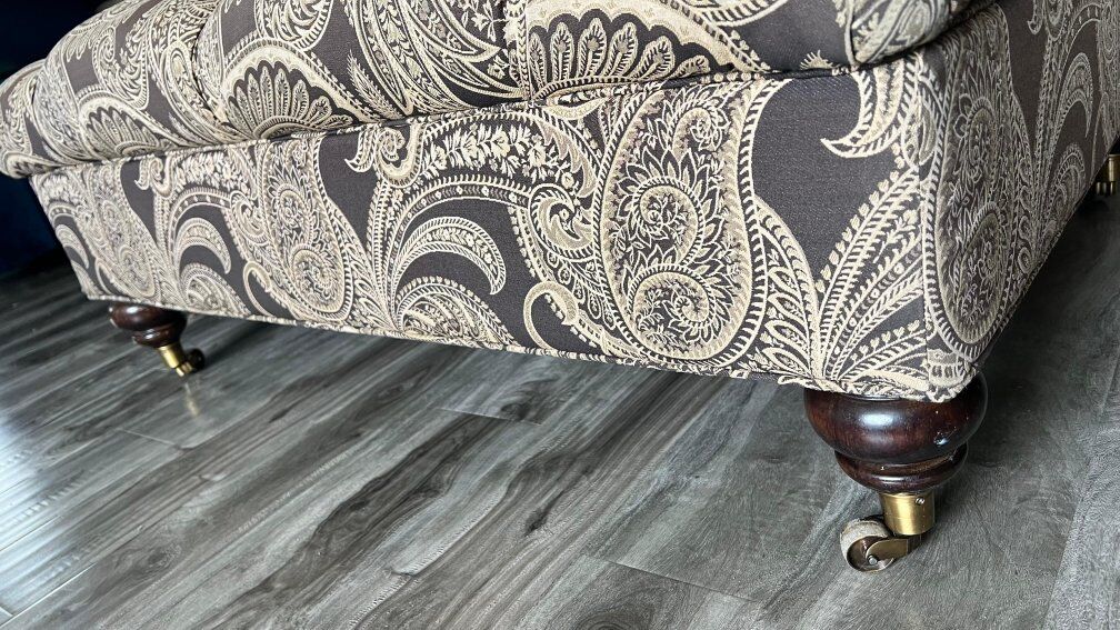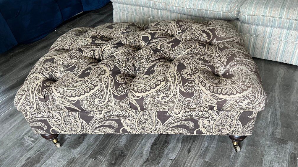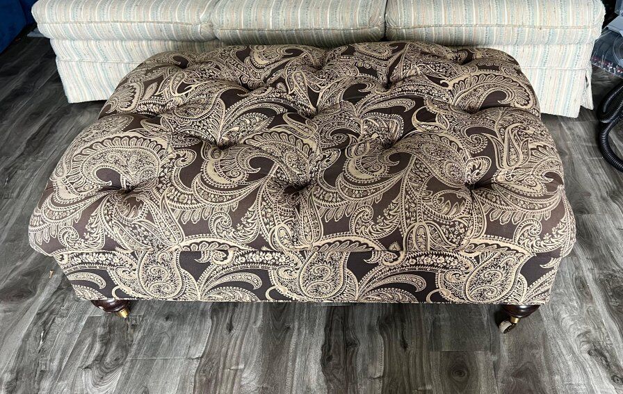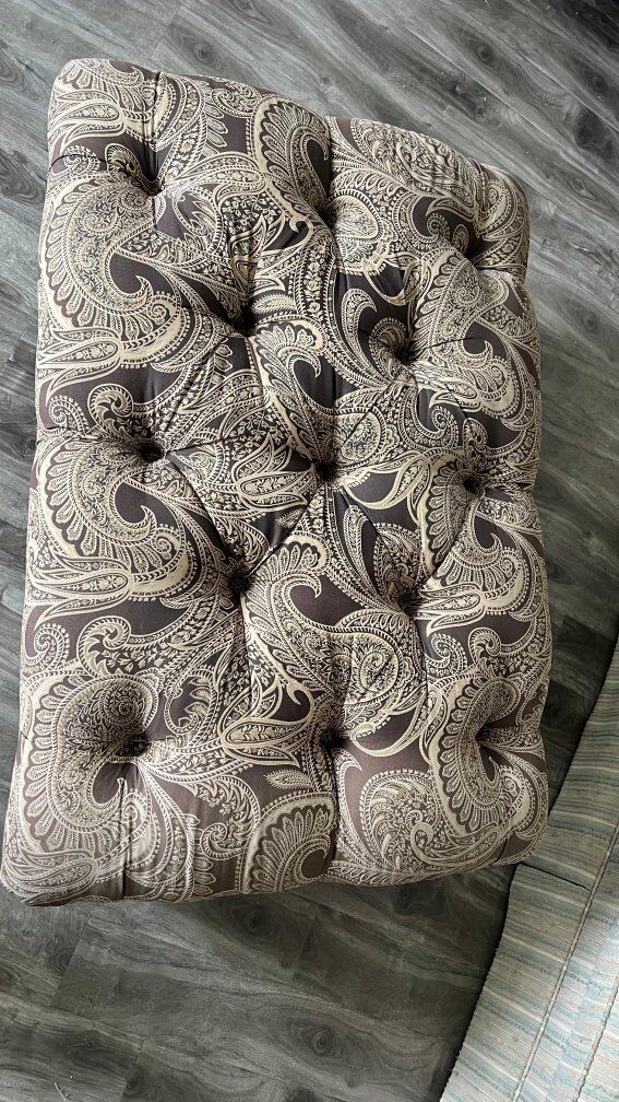 ZelleThis ottoman is absolutely gorgeous and in brand new condition. The cushion is full and plump with zero signs of use. No stains, rips or tears. Legs are on wheels. Dimensions: 44" wide, 30" deep, and 16" tall. $70 obo. Check it out and make me an offer!