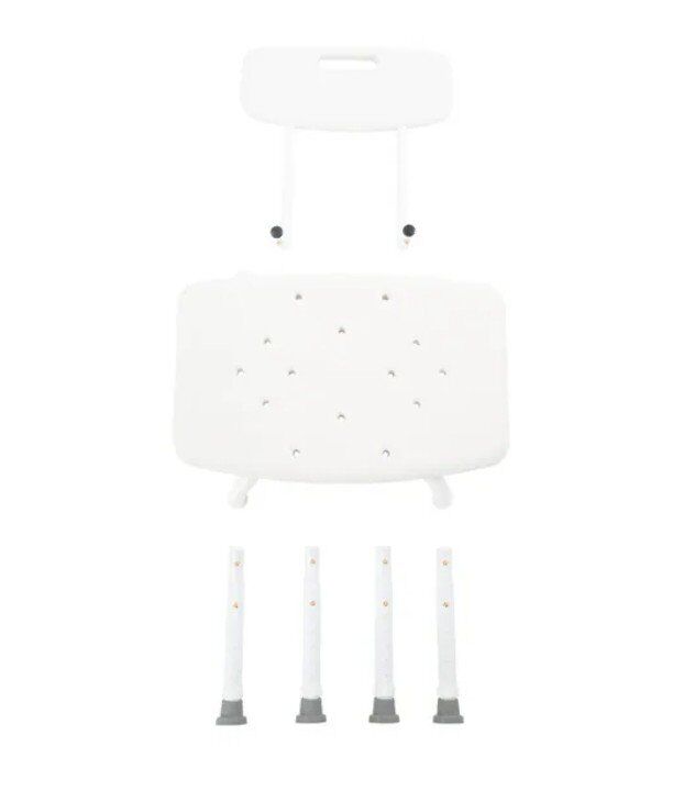 Features/Benefits: Quick and Easy Assembly Tool-Free Assembly: Put together your shower chair without the hassle of searching for tools. Built to Last Powder-Coated Aluminum Frame: Designed to withstand the test of time and resist corrosion. Made from Non-Recycled Materials: Ensures long-lasting durability and quality. Comfort & Adaptability Ample Seat Size: Provides comfortable seating with enough space. Adjustable Back and Legs: Customize your sitting experience to suit your needs. Practical Design Fits Inside Most Tubs: Versatile and efficient use of bathroom space. Easy Storage and Transport Easy-To-Carry Handle: Makes it convenient for moving around.