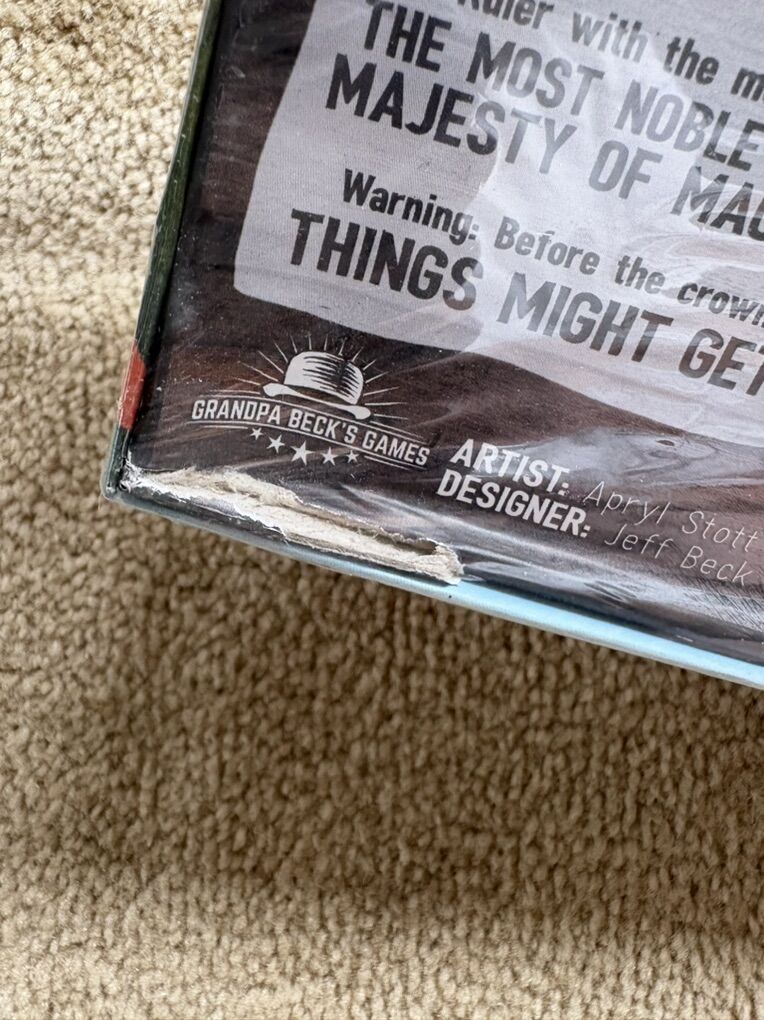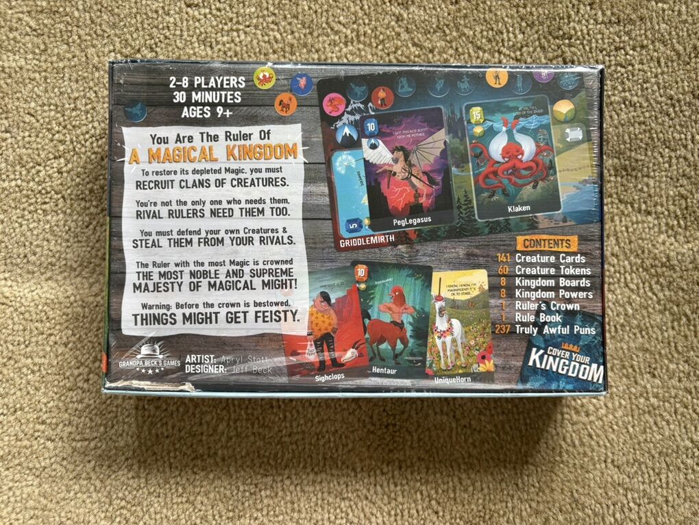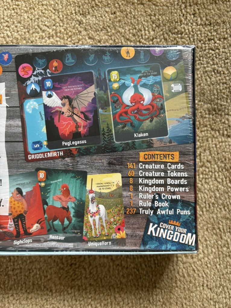 NEW (sealed in plastic) Cover Your Kingdom Game: Conspire to acquire punderful creatures! An absurdly ruthless spin-off of Cover Your Assets, by Grandpa Beck’s Games, 2020. 2-8 players, age 9+. New, unplayed condition. Back of box damaged on one corner (see photos). Text only. Cash or Venmo.