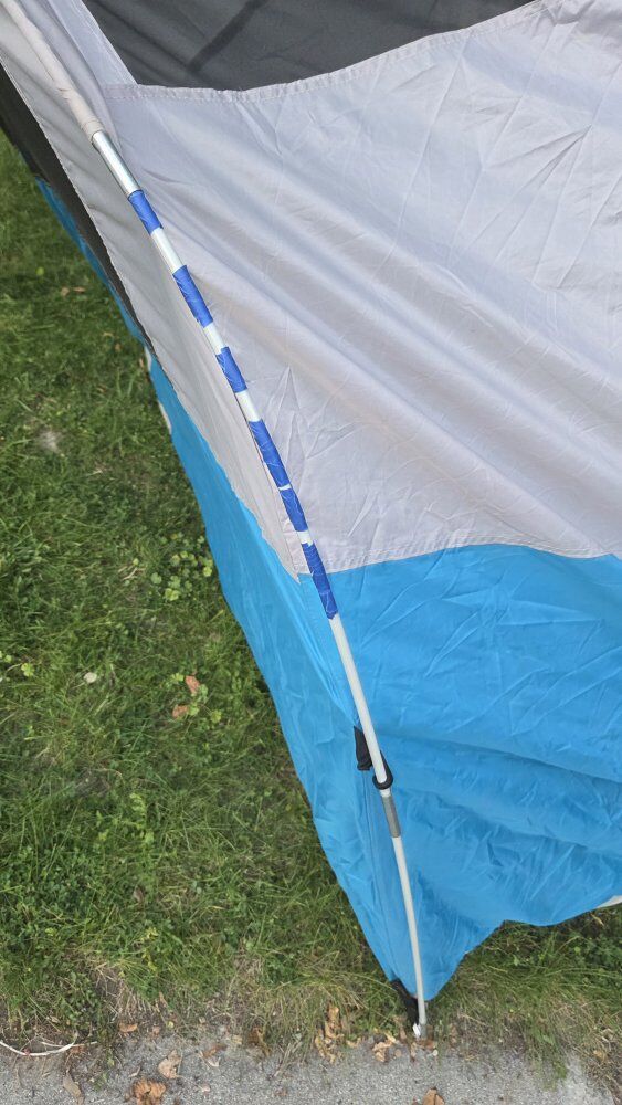 I have this 8 person tent for sale. Only been used a couple of times and is in good condition. The picture doesnt show the top cover it comes with that too. It only has 4 stakes and one of the poles has two sections that has cracked and has been taped back together as seen in the pictures. Normally sells for $250, see link for brand new.
