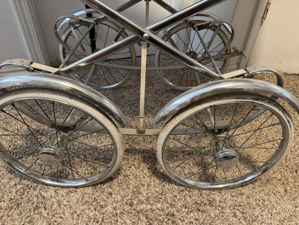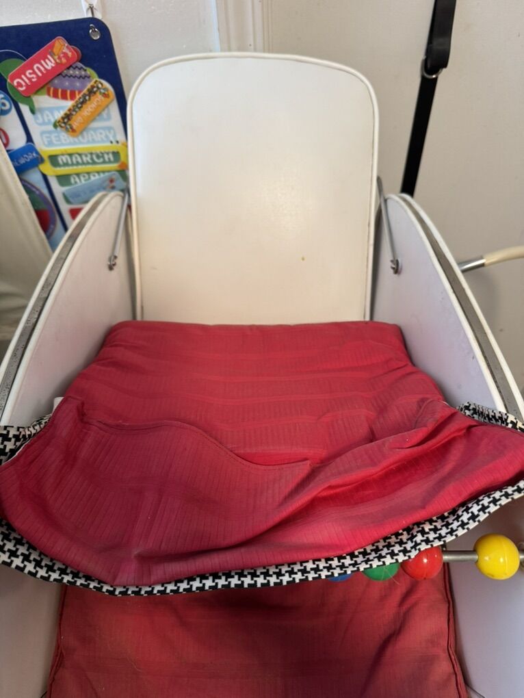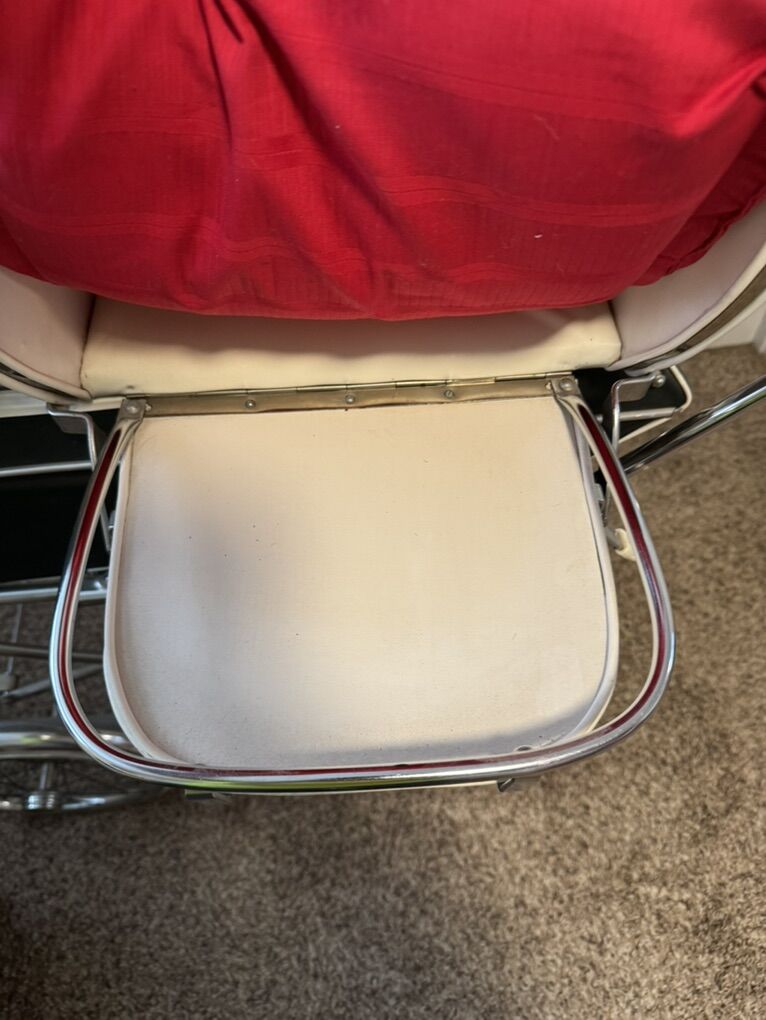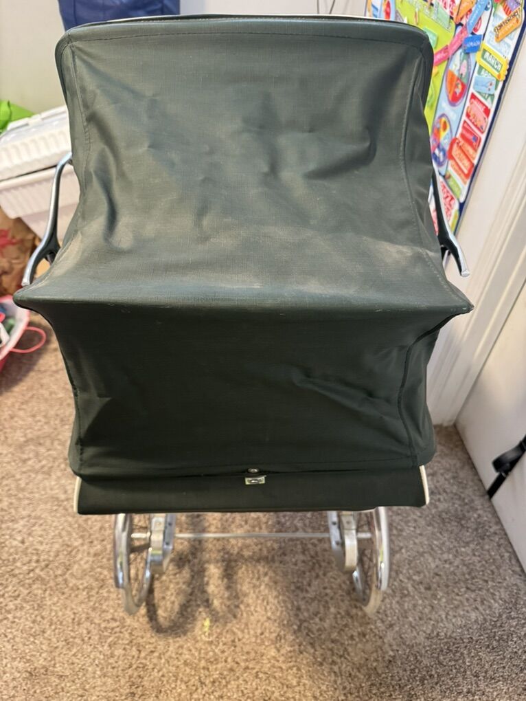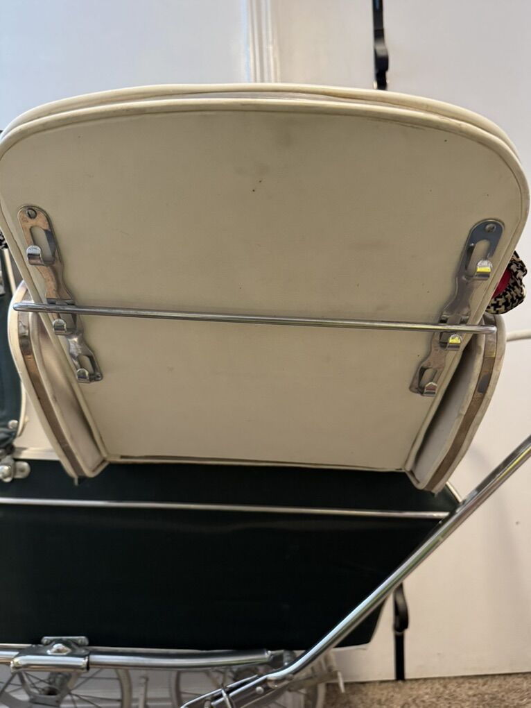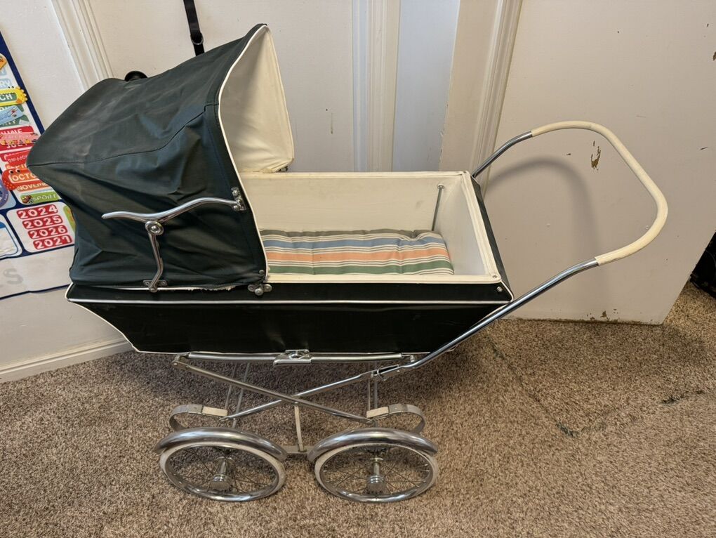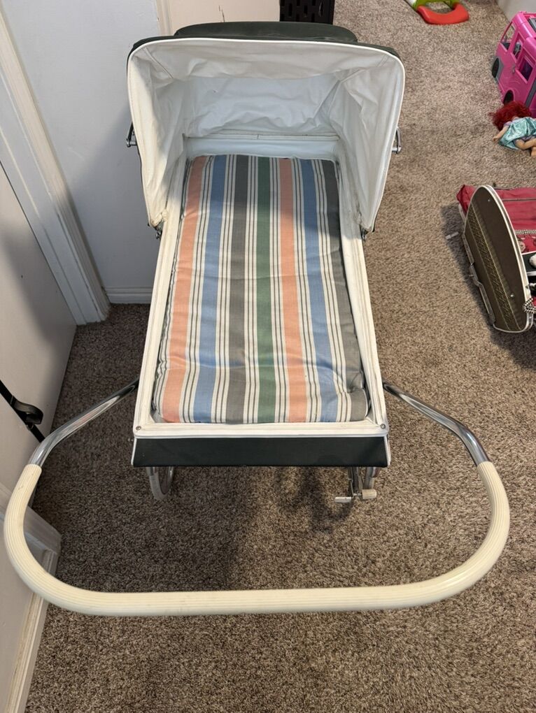 PRAM style infant/toddler carriage from the 1950s-1960s. It’s in mint condition and was covered its entire life up until 5 months ago in the basement of an elderly woman that bought it new in the 50s-60s. Why buy a brand new PRAM style carriage when you can buy the original and vintage that’s in brand new condition. Everything works and even comes with the infant attachment with carriage cover and umbrella. From what I know it’s all original, I can’t find any makers mark or brand but it’s obvious what it is. For being 60 sum odd years old in this condition with all the attachments and amenities it’s something you don’t and won’t see again anytime soon.