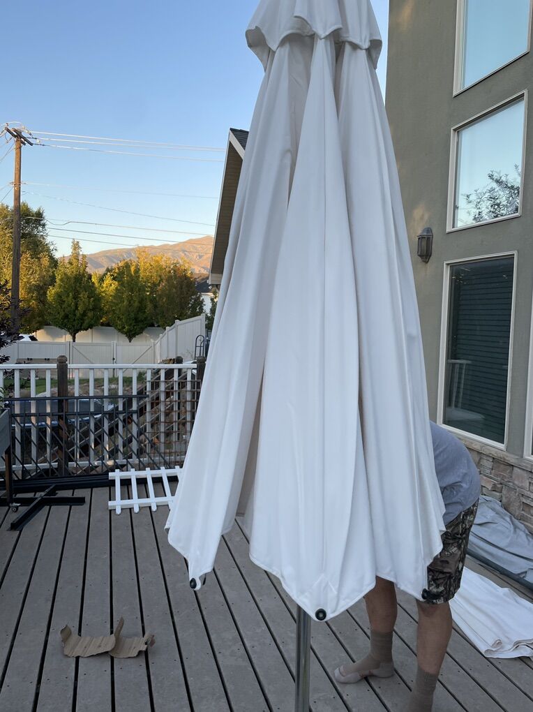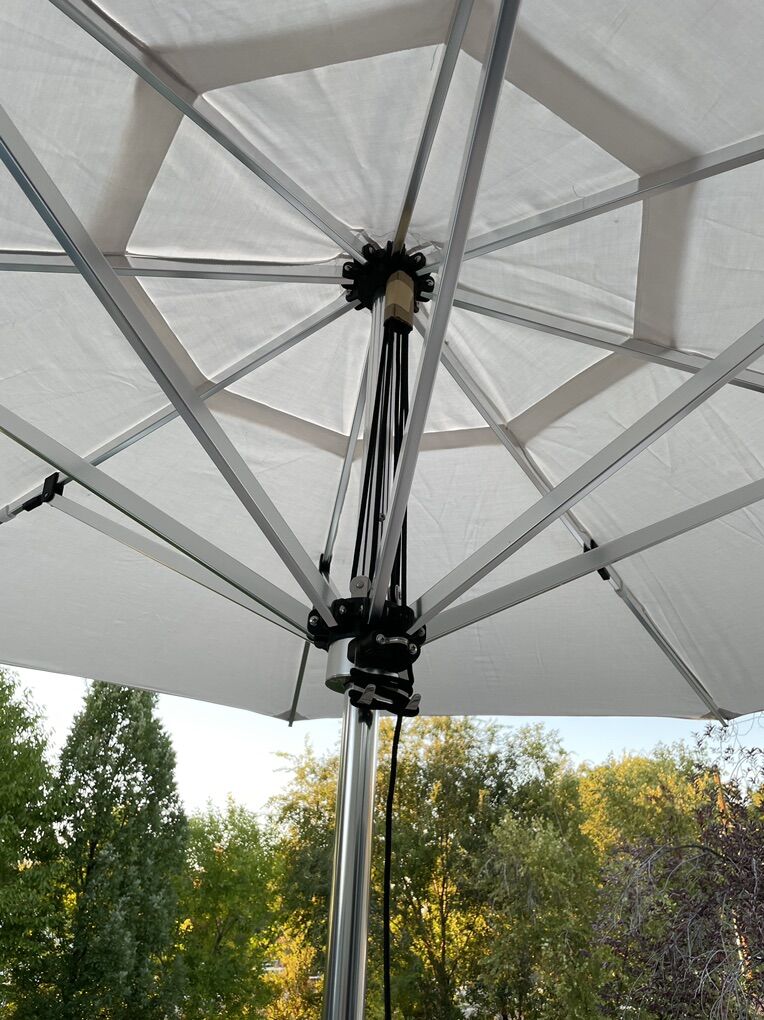 New SunVilla 11' Modern Flat Commercial Patio Umbrella Fabric that Resists Fading, Mildew, and Dirt Rust Resistant Anodized Aluminum Pole Yacht Cleat-Style Pulley Lift System Umbrella Base Not Included and some slightly dirty spots from storage.