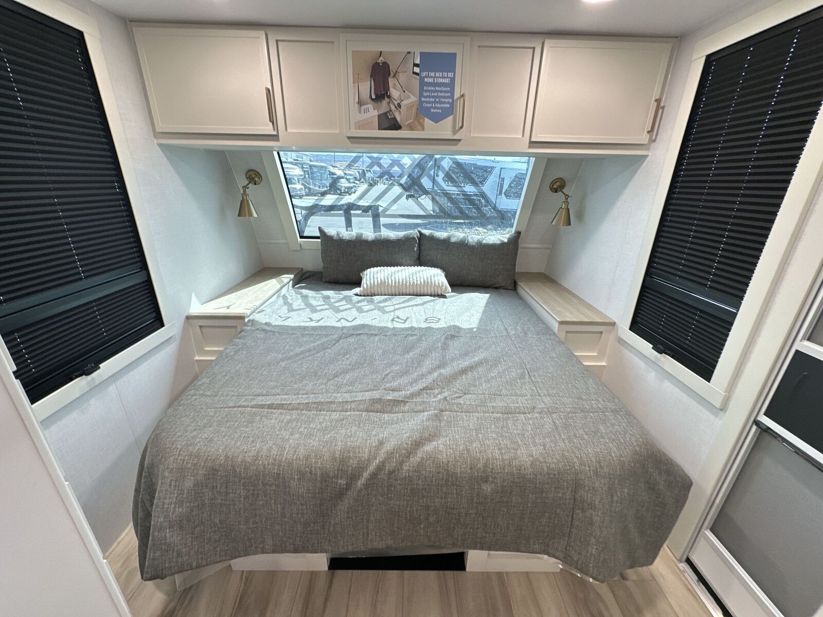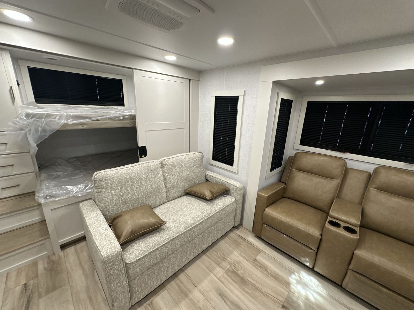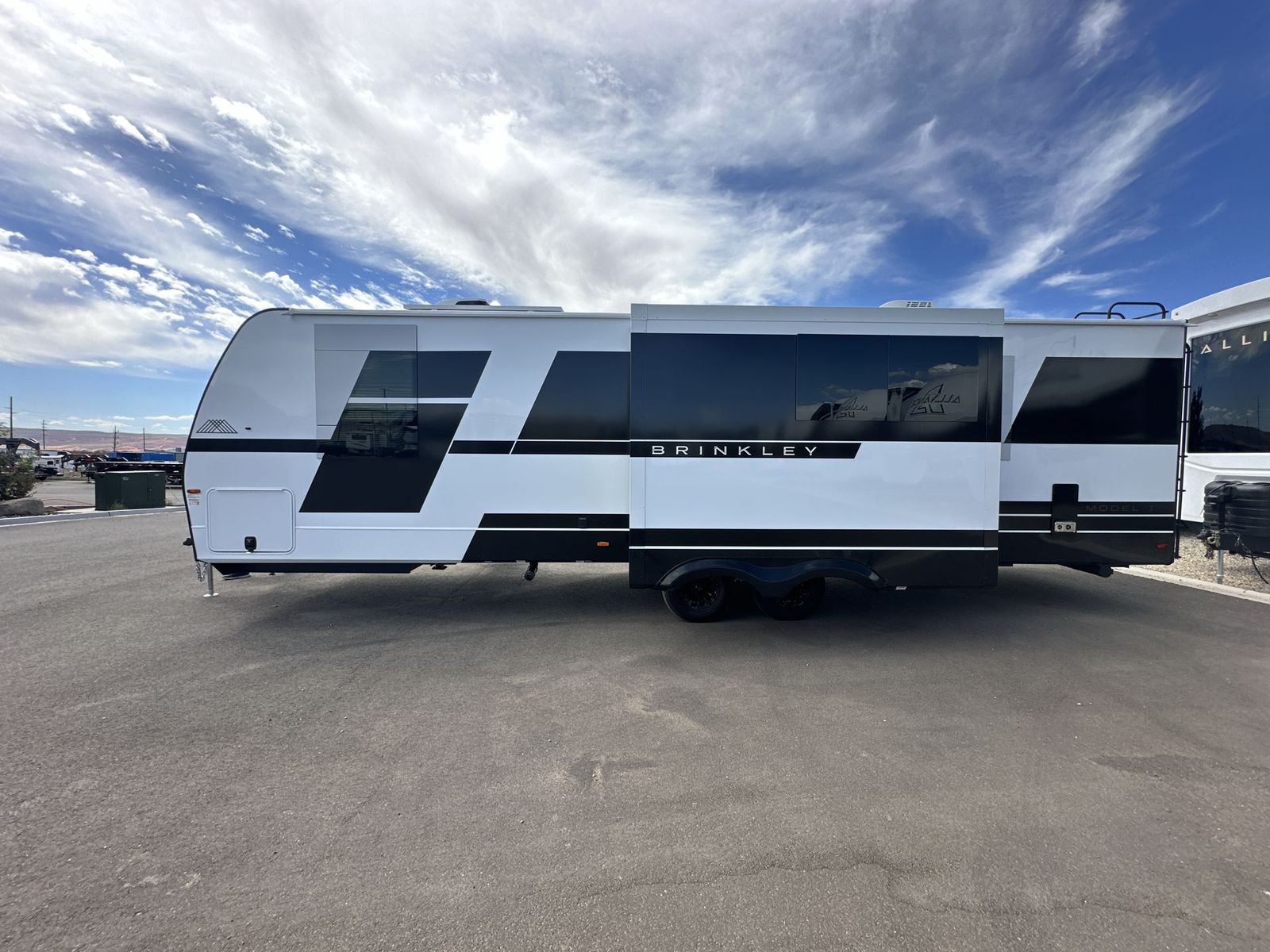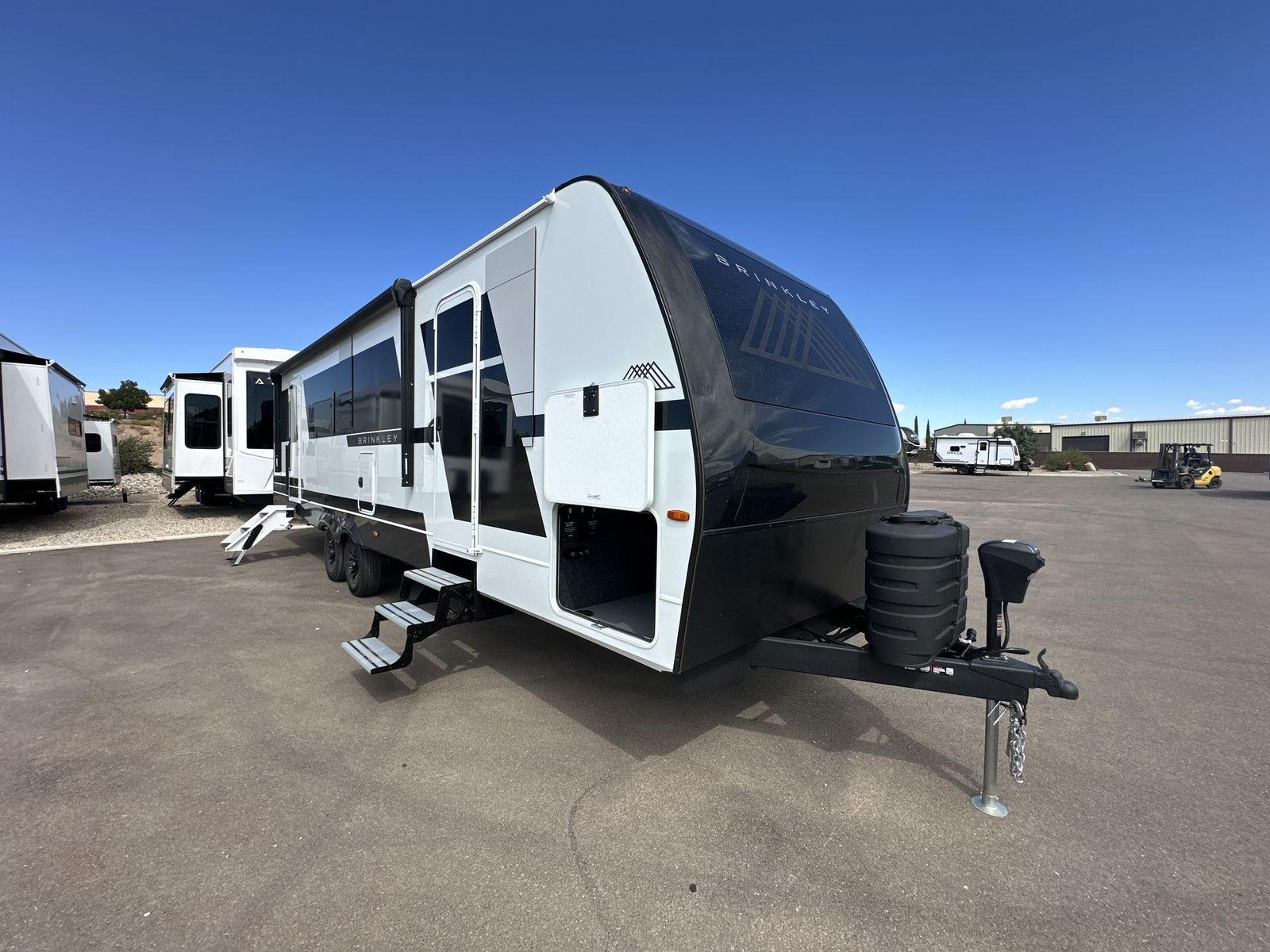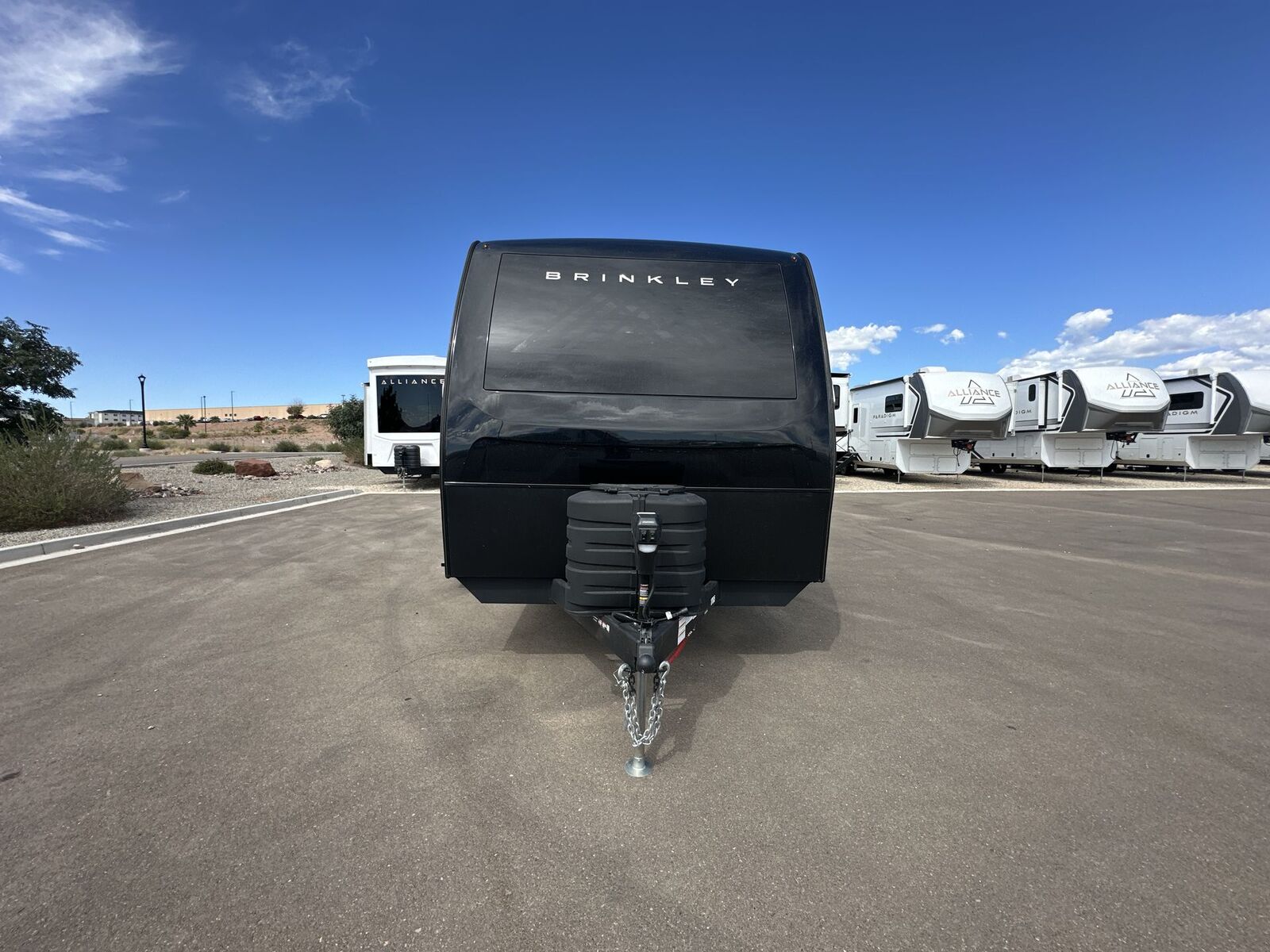Brinkley Model I travel trailer 294 highlights: Rear Bunkhouse Dual Entry Doors King Bed Pull-Out Dining Table with Drawer Grab the whole gang and head to the campground in this bunkhouse travel trailer! The 48" x 74" bunks can sleep two to four, and there is a floor to ceiling storage cabinet with drawers, a top bunk window, outlets and USB ports, plus double space-saving pocket doors. Up front you'll find the master bedroom with a 66" x 80" king bed and a MaxSpace Split-Level Wardrobe, TV prep, your own exterior entry door, plus quick access to the walk-thru bath. Everyone can meet in the combined kitchen and living room to relax on the theater seating or tri-fold sofa, and there is pull-out dining table with a drawer and a window above for great outdoor views. The outside is just as accommodating as the inside with its exterior speakers, LED chassis lighting, rear storage compartment with dual access doors, and exterior 12V refrigerator for cold drinks! The lightweight Model I travel trailer by Brinkley is the perfect choice for those looking for an easy tow and at-home comforts! There is a drop-frame chassis, high-performance Road Armor suspension equalizer system, and Demco EZ Latch trailer coupler that automatically latches when dropped onto a hitch ball without the need of a safety pin. Additional exterior features include square Euro frameless windows, automotive-grade paint, full-width LED strip lighting in the pass-thru, and a pet & property security campside tie-down to keep your gear and furry friends safe. Inside, you'll be wowed by Brinkley's CraftSense wood trim construction, residential solid surface kitchen countertops, dimmable bedroom lights, and marine-grade neon LED shower lighting to name a few stand-out features!