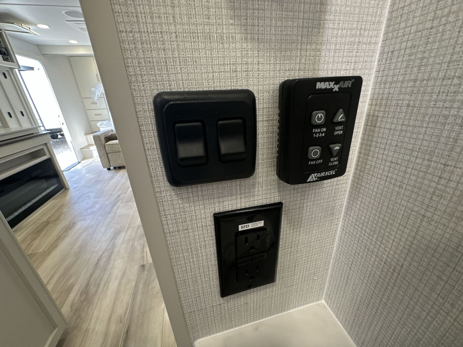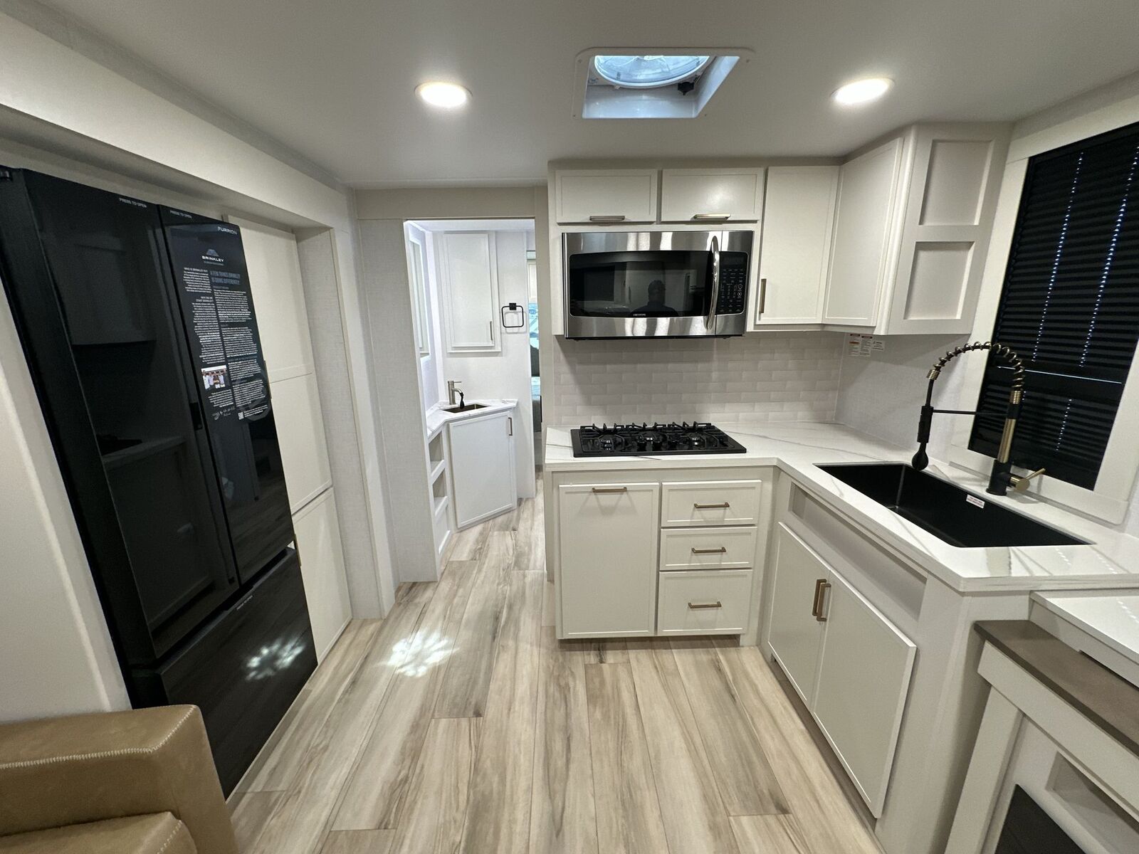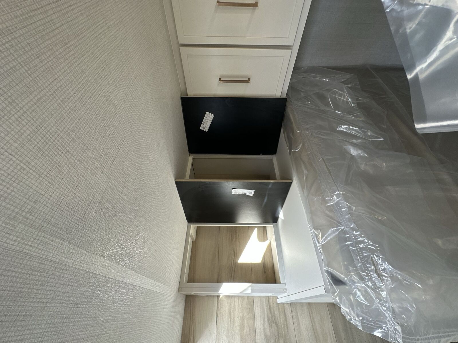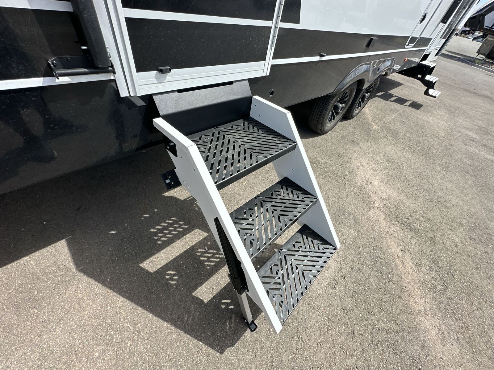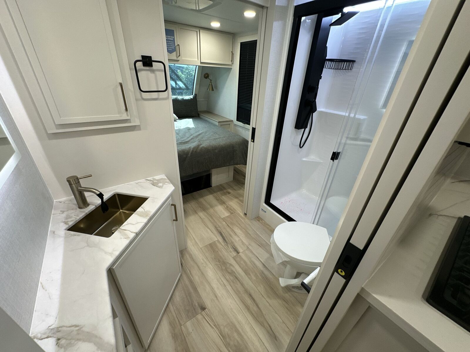 Brinkley Model I travel trailer 294 highlights: Rear Bunkhouse Dual Entry Doors King Bed Pull-Out Dining Table with Drawer Grab the whole gang and head to the campground in this bunkhouse travel trailer! The 48" x 74" bunks can sleep two to four, and there is a floor to ceiling storage cabinet with drawers, a top bunk window, outlets and USB ports, plus double space-saving pocket doors. Up front you'll find the master bedroom with a 66" x 80" king bed and a MaxSpace Split-Level Wardrobe, TV prep, your own exterior entry door, plus quick access to the walk-thru bath. Everyone can meet in the combined kitchen and living room to relax on the theater seating or tri-fold sofa, and there is pull-out dining table with a drawer and a window above for great outdoor views. The outside is just as accommodating as the inside with its exterior speakers, LED chassis lighting, rear storage compartment with dual access doors, and exterior 12V refrigerator for cold drinks! The lightweight Model I travel trailer by Brinkley is the perfect choice for those looking for an easy tow and at-home comforts! There is a drop-frame chassis, high-performance Road Armor suspension equalizer system, and Demco EZ Latch trailer coupler that automatically latches when dropped onto a hitch ball without the need of a safety pin. Additional exterior features include square Euro frameless windows, automotive-grade paint, full-width LED strip lighting in the pass-thru, and a pet & property security campside tie-down to keep your gear and furry friends safe. Inside, you'll be wowed by Brinkley's CraftSense wood trim construction, residential solid surface kitchen countertops, dimmable bedroom lights, and marine-grade neon LED shower lighting to name a few stand-out features!