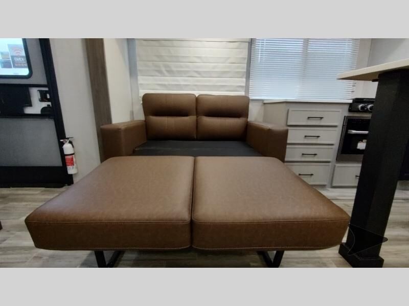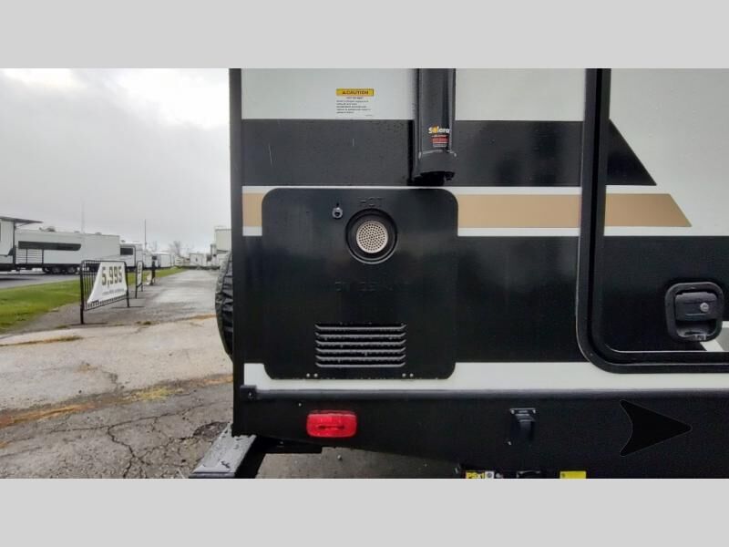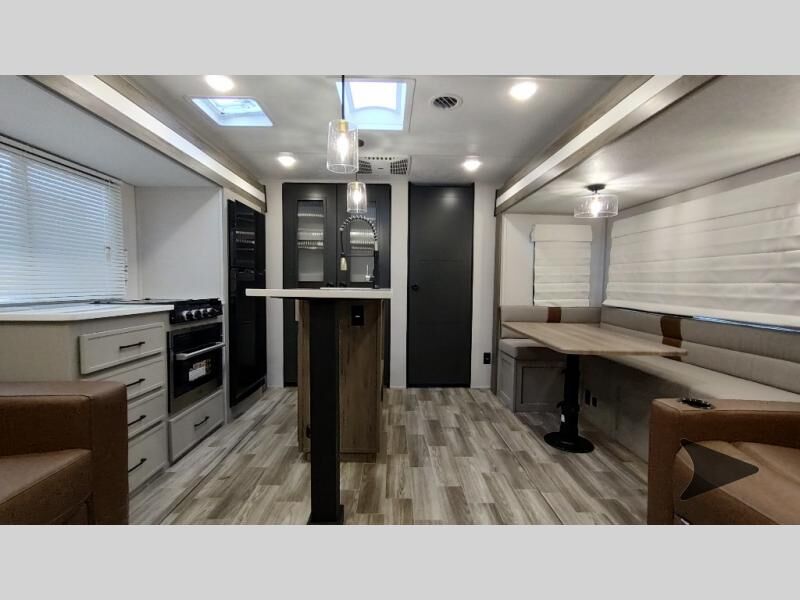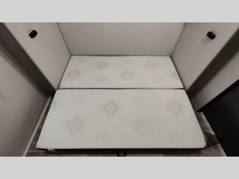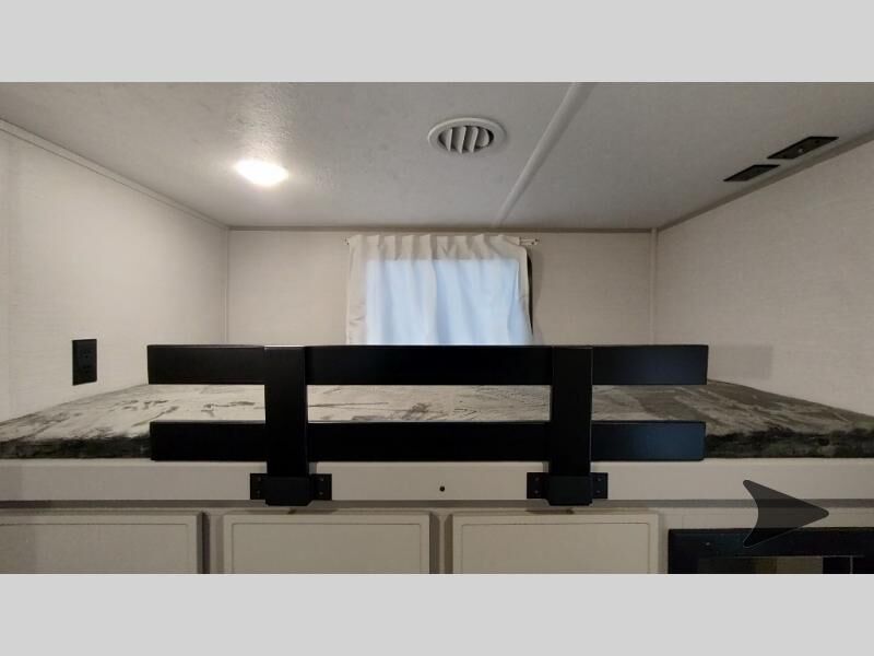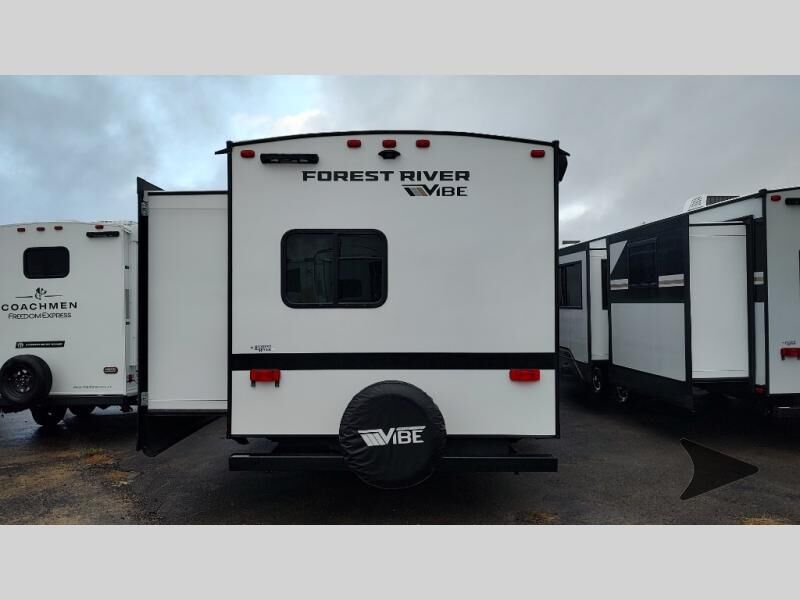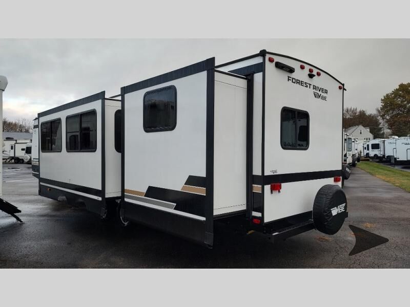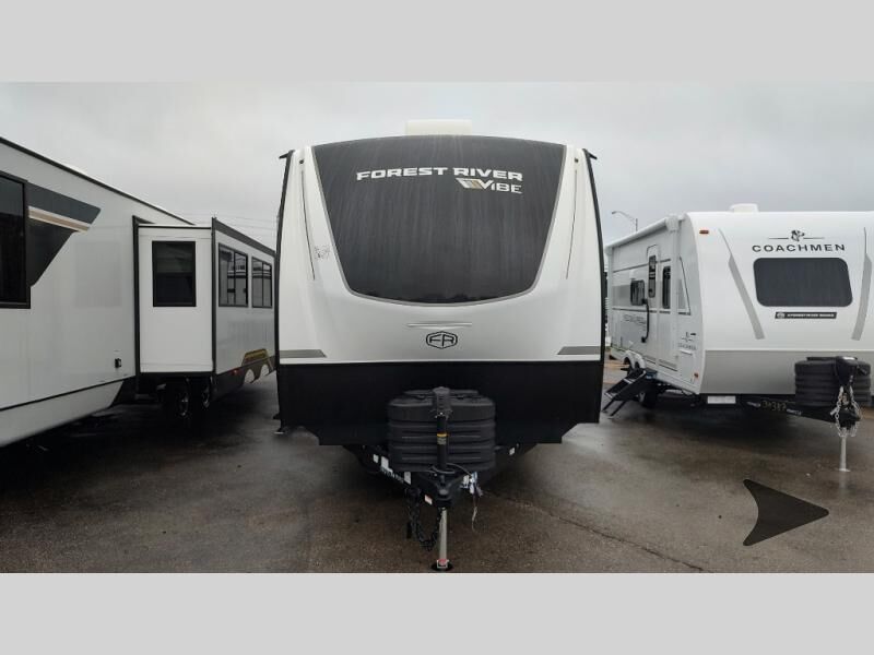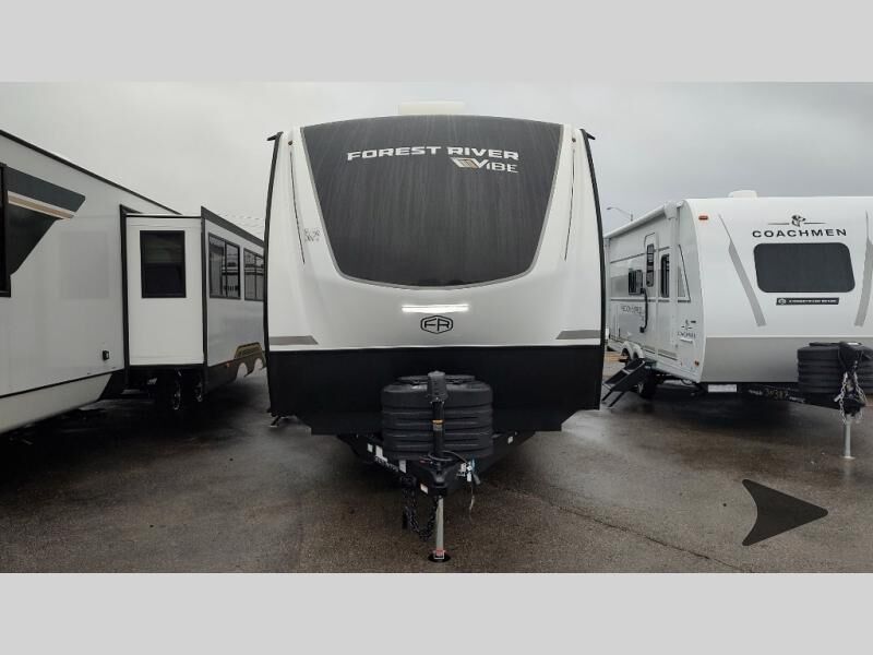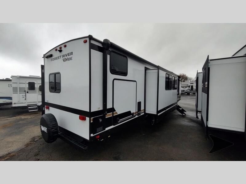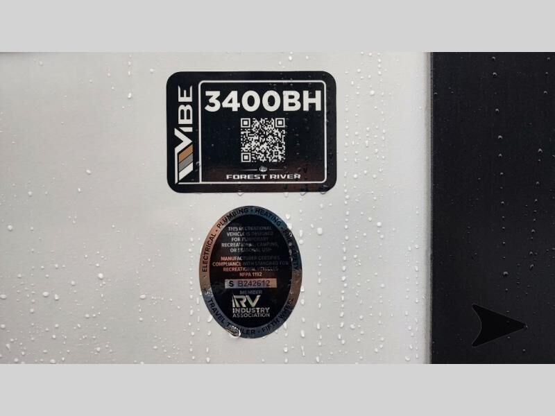 Forest River Vibe travel trailer 3400BHhighlights: Oversized Panoramic Windows Kitchen Skylight Tri-Fold Sofa Spacious Full Bath Front Private Bedroom 5-Person Dinette Whether you enjoy spending time outdoors or indoors, there is something for everyone in this travel trailer. The large pass-through storage can store your fishing poles, and the 20' electric awning with LED lights will create an outdoor living space. There is even an outdoor refrigerator with an outside storage cabinet and 32" TV! You will love all the interior space thanks to the dual opposing slides in the main living area, which will give the chef space to work around the kitchen island. Your crew can visit on the tri-fold sofa, theater seating and 5-person dinette while the fireplace is going, but you'll probably find the kids spending most of their time in the private bunkhouse! What more could you want in a travel trailer?! With any Vibe travel trailer by Forest River, you will enjoy comfort at every turn! There is a Norco huck-bolted steel frame, an enclosed underbelly with 12V heating pads, and a PVC roof membrane for added durability. You will also find a universal docking station outside, along with slam latch doors, European style square windows, and an automotive painted front cap. Head inside to enjoy the premium residential-style furniture, decorative window treatments, privacy shades in the living room and bedroom, and many more comforts!