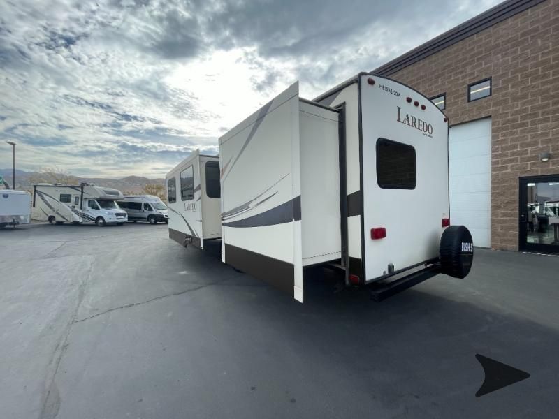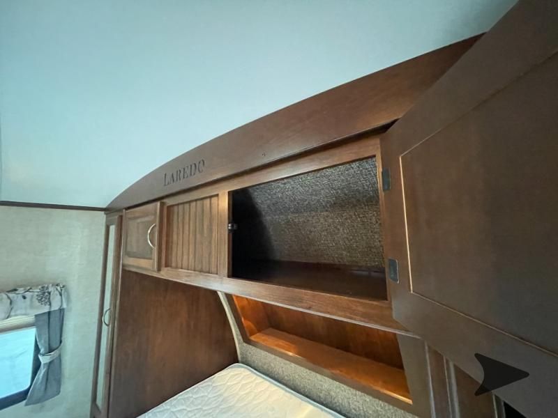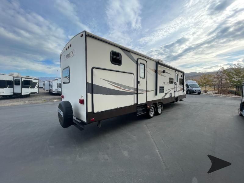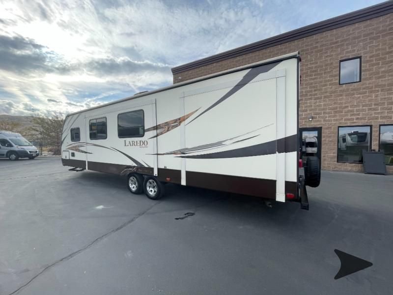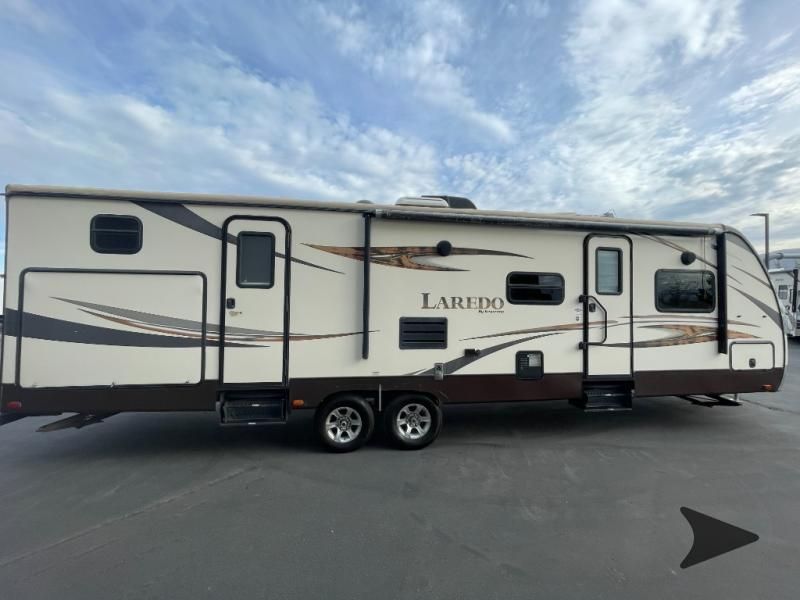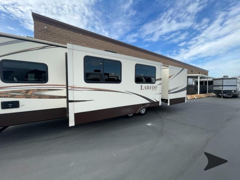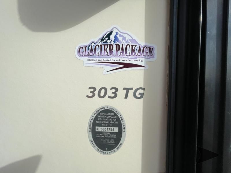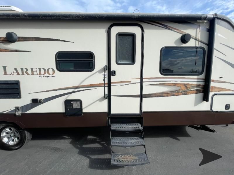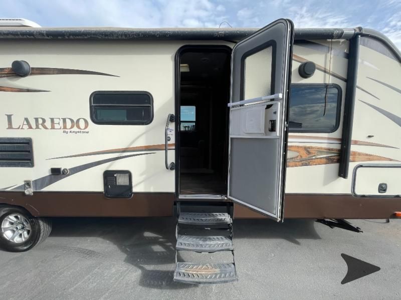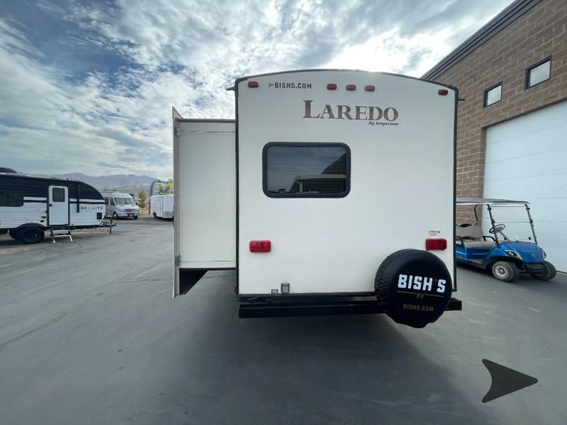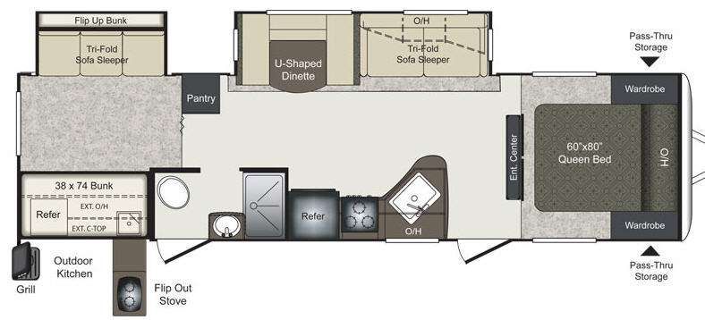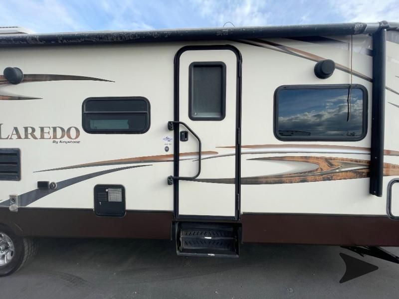 This Keystone Laredo travel trailer 303TG is very similar to model 291TG. The main difference is in the bunkhouse with the added slide, the bathroom features a private entry door, and it is about 2'5" longer in length.Step inside and notice the front bedroom with queen size bed. There are bedside wardrobes on both sides and overhead cabinets for storage. There are dual sliding doors on either side of an entertainment center that can be closed for more privacy at night in the bedroom.In the main living space you will love the added foot traffic space that is added with the large u-shaped dinette and tri-fold sofa sleeper slide. They provide plenty of space to dine comfortably, enjoy watching TV, or just hanging out, and they both can be made into more sleeping space if needed at night.The kitchen features all the amenities needed to prepare and feed your hungry crew. There is a refrigerator, three burner range, and double kitchen sink, plus storage above for dishes and things. You will also find drawer space and cabinets below the counter. There is a pantry off the u-shaped dinette for dry goods and more.The bunkhouse features a set of 28" x 74" bunks on the right and a third 38" x 74" bunk on the left above storage below. There is also a wardrobe in between the two, and an exterior kitchen is located beneath the third bunk also. Step outside and see how convenient the outdoor kitchen is with a flip-out two burner stove, refrigerator, single sink, exterior counter-top, and grill. There is also a front pass-through storage compartment for all of your outdoor camping gear, and so much more!