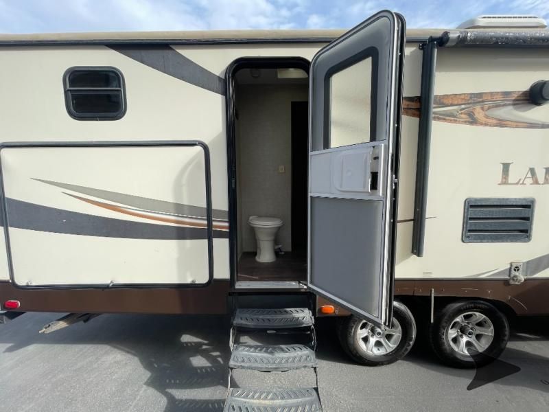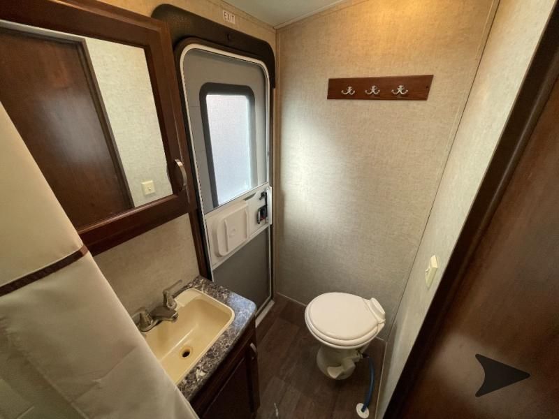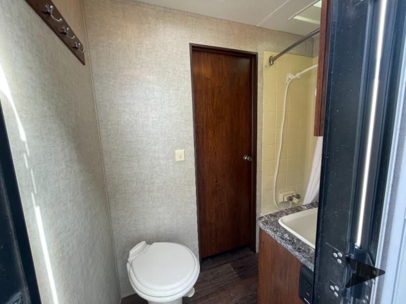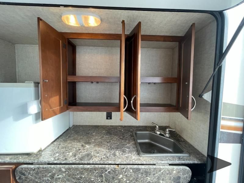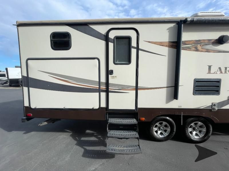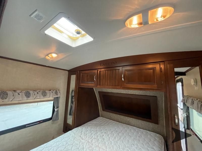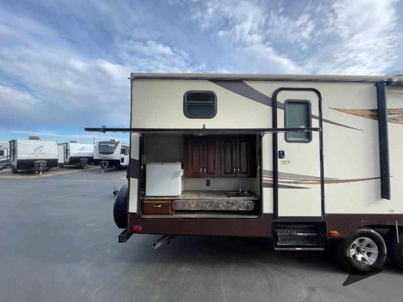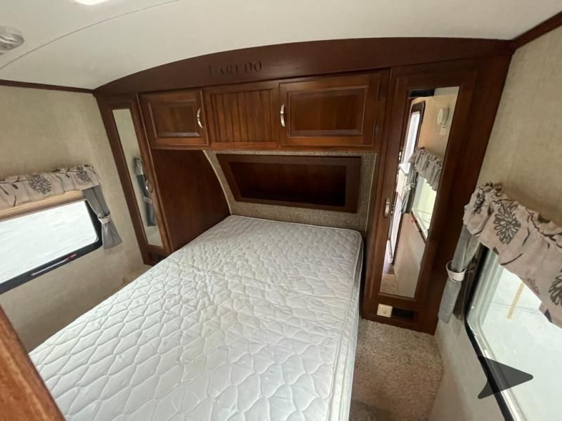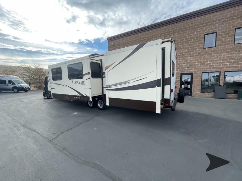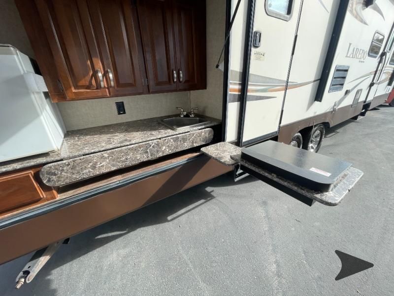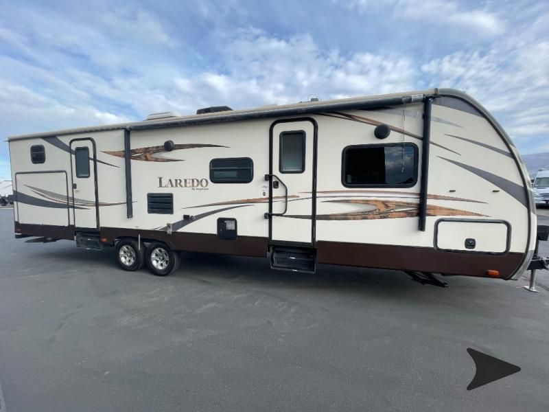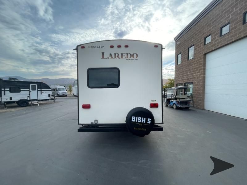 This Keystone Laredo travel trailer 303TG is very similar to model 291TG. The main difference is in the bunkhouse with the added slide, the bathroom features a private entry door, and it is about 2'5" longer in length.Step inside and notice the front bedroom with queen size bed. There are bedside wardrobes on both sides and overhead cabinets for storage. There are dual sliding doors on either side of an entertainment center that can be closed for more privacy at night in the bedroom.In the main living space you will love the added foot traffic space that is added with the large u-shaped dinette and tri-fold sofa sleeper slide. They provide plenty of space to dine comfortably, enjoy watching TV, or just hanging out, and they both can be made into more sleeping space if needed at night.The kitchen features all the amenities needed to prepare and feed your hungry crew. There is a refrigerator, three burner range, and double kitchen sink, plus storage above for dishes and things. You will also find drawer space and cabinets below the counter. There is a pantry off the u-shaped dinette for dry goods and more.The bunkhouse features a set of 28" x 74" bunks on the right and a third 38" x 74" bunk on the left above storage below. There is also a wardrobe in between the two, and an exterior kitchen is located beneath the third bunk also. Step outside and see how convenient the outdoor kitchen is with a flip-out two burner stove, refrigerator, single sink, exterior counter-top, and grill. There is also a front pass-through storage compartment for all of your outdoor camping gear, and so much more!