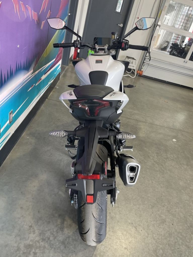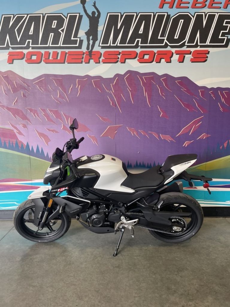 2025 CFMOTO 450NK This machine paves your riding ambition with 449cc of meticulously engineered engine, boasting a 270° crankshaft, and 50 horses that don’t just run—they dance. It’s about a ride guided by a 37mm upside-down fork and multi-link rear suspension that reads the road. It’s technology where it counts: Bluetooth keeps you connected. Dual-channel ABS keeps you safe. LED lighting cuts through the dark with precision. And J.Juan brakes ensure every riding moment is greeted with confidence. The 450NK. Simple on the outside. Sophisticated where it counts. Features may include: 449cc DOHC Engine with Bosch® EFI The 449cc parallel twin featuring Bosch® EFI makes 50 hp at 9500 rpm and 28.8 lb-ft of torque, providing an unbeatable power-to-weight ratio. The all-new design is characterized by a 270° crankshaft angle. Precision-engineered balance shafts effectively counteract vibrations, ensuring smooth operation across the rev band. A slipper clutch adds to the engine’s refinement. 5” TFT Display Thin Film Transistor Technology (TFT) is a feature you expect on a high-price motorcycle. In this case, what you see so clearly is what you get—a vibrant 5” TFT multi-function display featuring Bluetooth and CFMOTO RideSync™ connectivity. Over-the-air (OTA) functionality means your motorcycle’s features and software can receive updates wirelessly. What’s more, you’ve got Type C and Type A ports to charge your devices. Design The muscular allure of naked bike styling appeals to a wide range of riders. The exposed engine connects the rider to the raw mechanics of the machine. The sharp lines and contemporary design embody cutting-edge aesthetics while putting CFMOTO quality on full display. LED Headlights, Taillights, and Signal Lights Superior LED lighting sets the standard for visibility and safety. Powerful LED headlights provide a crisp and focused beam, illuminating even the darkest corners. LED taillights not only enhance aesthetics, but also ensure you’re visible to vehicles behind you. LED turn signals provide a crisp and distinct indication of your turns and lane changes, making your presence and intentions unmistakably clear.