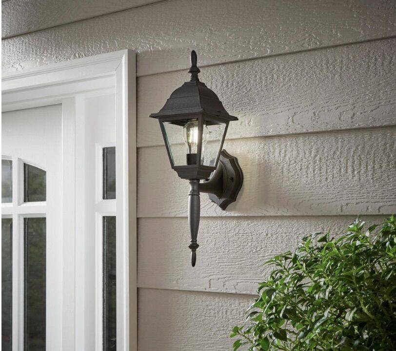 VenmoThe Hampton Bay Wall-Mount 1-Light Outdoor Lamp has a traditional coach-lantern design in a tapered, square housing. The classic black finish resembles iron and complements the clear, beveled glass panels for a handsome appearance that will enhance a variety of exterior styles. Uses 1 medium-base bulb, 60-Watt maximum (not included). • Cast aluminum and steel housing is made for outdoor installation • Clear, beveled glass panels complement the housing and maximize light output • Traditional coach-lantern design with a black finish • Standard wall-mount installation • Weather resistant materials for added durability • Uses 1 medium-base bulb, 60-Watt maximum