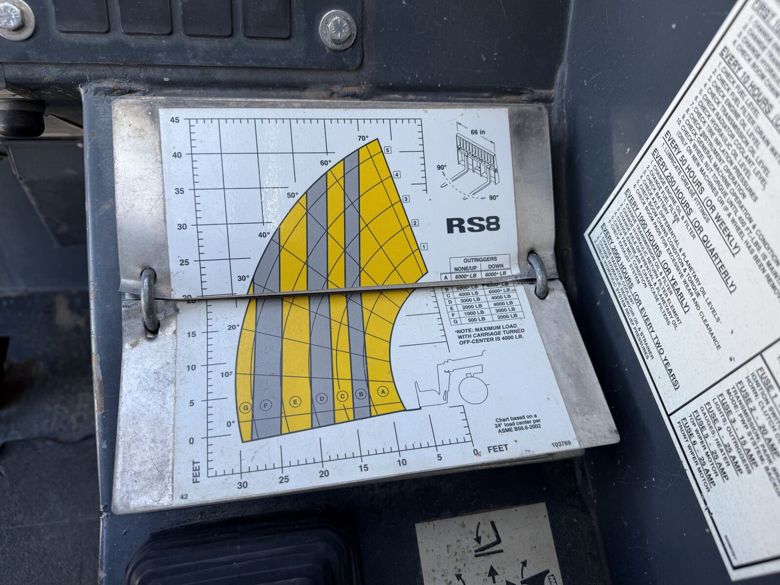 DIMENSIONS W: 98” x H: 8’ x L: 20’ 2” plus forks Forks: 48” x 4” Carriage Width: 70.5” Bar Diameter: 2” Fork Drop: 24” Offset: 1” Weight: 25,815 LB