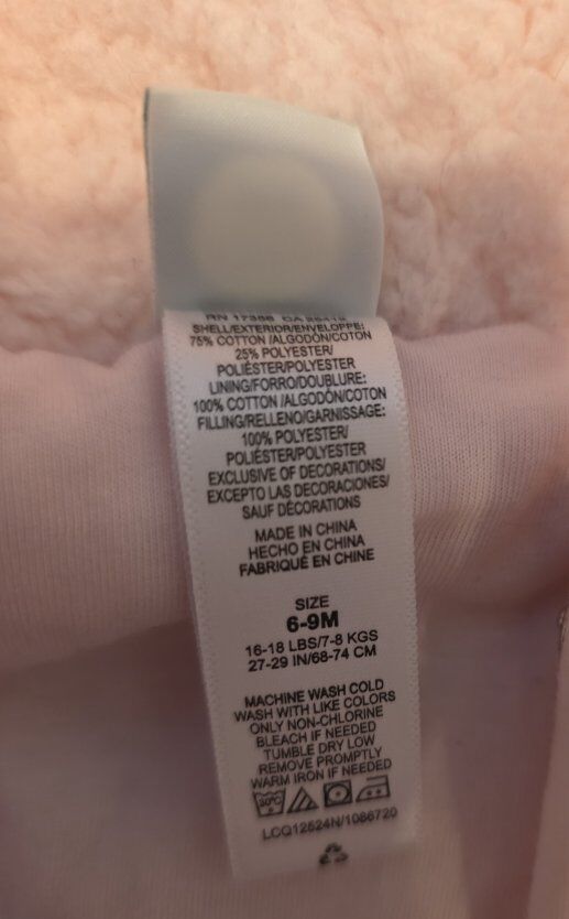 Flame-retardant free Imported Machine washable cold and tumble dry low Zipper Closure 6-9 month retail $59 , asking $15