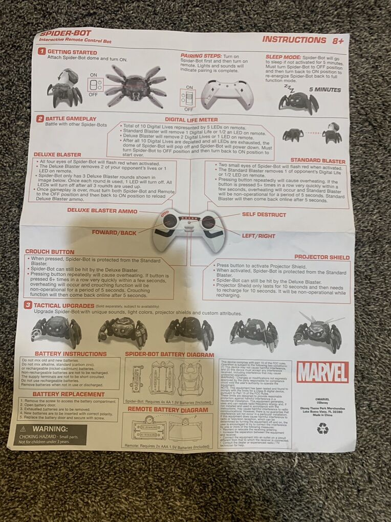 ApplePaySpider bot for $80 at Disneyland. Comes with original instructions. Only used a few times. Small scratches on paint. Small crack in one leg, does not affect use.