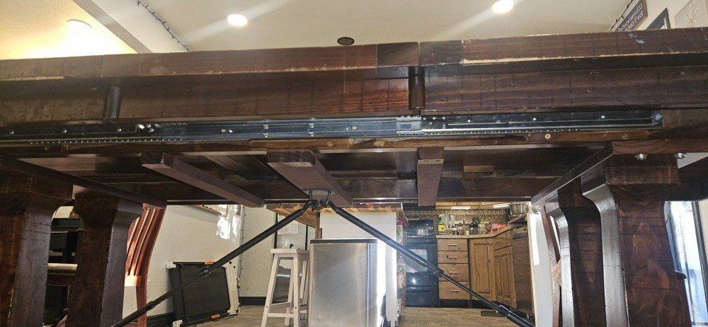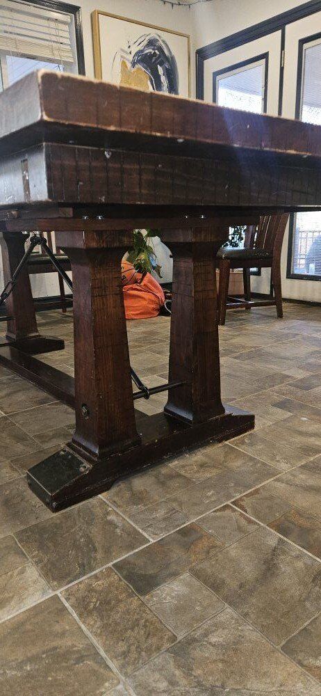 VenmoTable will require disassembly. I can help with that. 80" long w/o leaf, 100" long with leaf. 42" wide, 30" high. 6 chairs. Some of the chairs are worn or broken. The table looks like the border pieces are solid wood and the inside pieces are laminate, which is warping. This table is ready for the inside pieces to get pulled out and filled with epoxy! The table is 10+ years old. It is heavy.