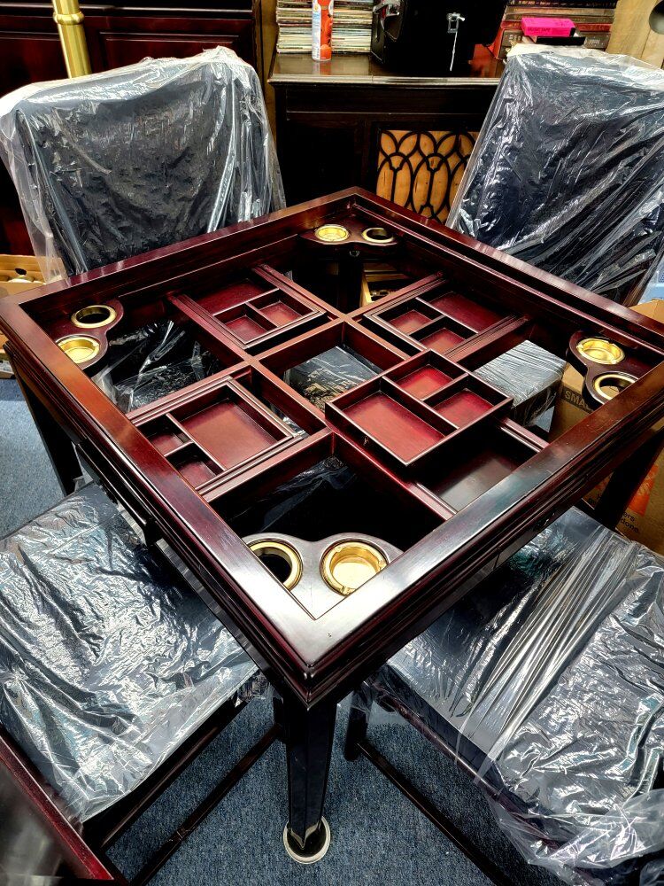 Venmo$800.00 Beautiful, like new. 4 silk clad chairs. With the longevity design. Table has a small drawer on each side and a corner pull out on each corner. The top come off and with a corner turn can leave a lip or another quarter turn makes it flat with no lip.