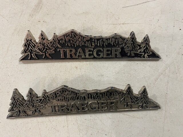 Two Vintage Traeger Emblems. Hard to find. One needs included stud reattached with JB Weld.