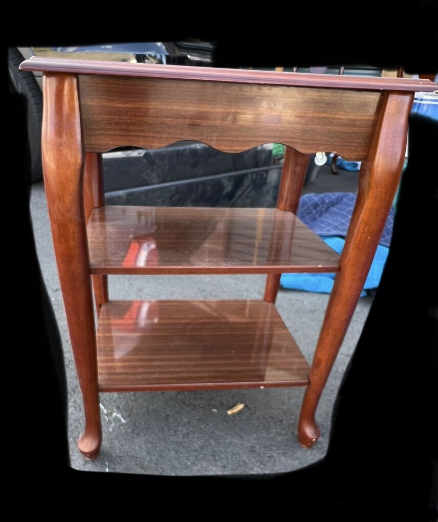 VenmoTraditional-style, two-tiered wooden side or end table, likely with a mahogany or cherry finish. The table features a square or rectangular top with a distinctive scalloped or wavy edge, and it stands on four elegantly curved (cabriole-style) legs. A lower shelf mirrors the shape of the top, offering additional display or storage space.