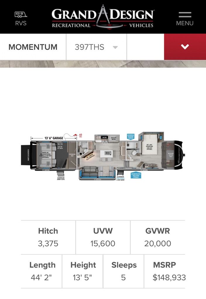 The Grand Design Momentum 397TH is a toy hauler fifth wheel with a garage, a main living area with a kitchen, and a front bedroom. Key features include a rear garage, large windows in the living area, theater seating, a king-sized bed in the front, and a hidden washer/dryer space in the bedroom. The design also often includes a ramp door patio system and space for up to nine guests. Key Features and Layout Toy Hauler Design: It features a rear garage with a ramp door, providing space for outdoor toys or a second living/office area. Living Area: A center living area offers comfortable seating, a kitchen with appliances, and large windows for natural light and views. Sleeping Quarters: The main bedroom is located in the front and typically has a king-sized bed. The garage area also has an optional queen bed or Happi-Jac lift bed. Conveniences: A hidden compartment for a washer/dryer is located in the bedroom, and the floor plan often includes a central vacuum system. Exterior Features Triple Awnings: Many models come with three powered awnings, creating ample covered patio space. Ramp Door Patio: A system that allows the rear ramp door to convert into a patio is a common feature. Generator & Fuel Station: A built-in generator and a fuel station for fueling outdoor toys are standard