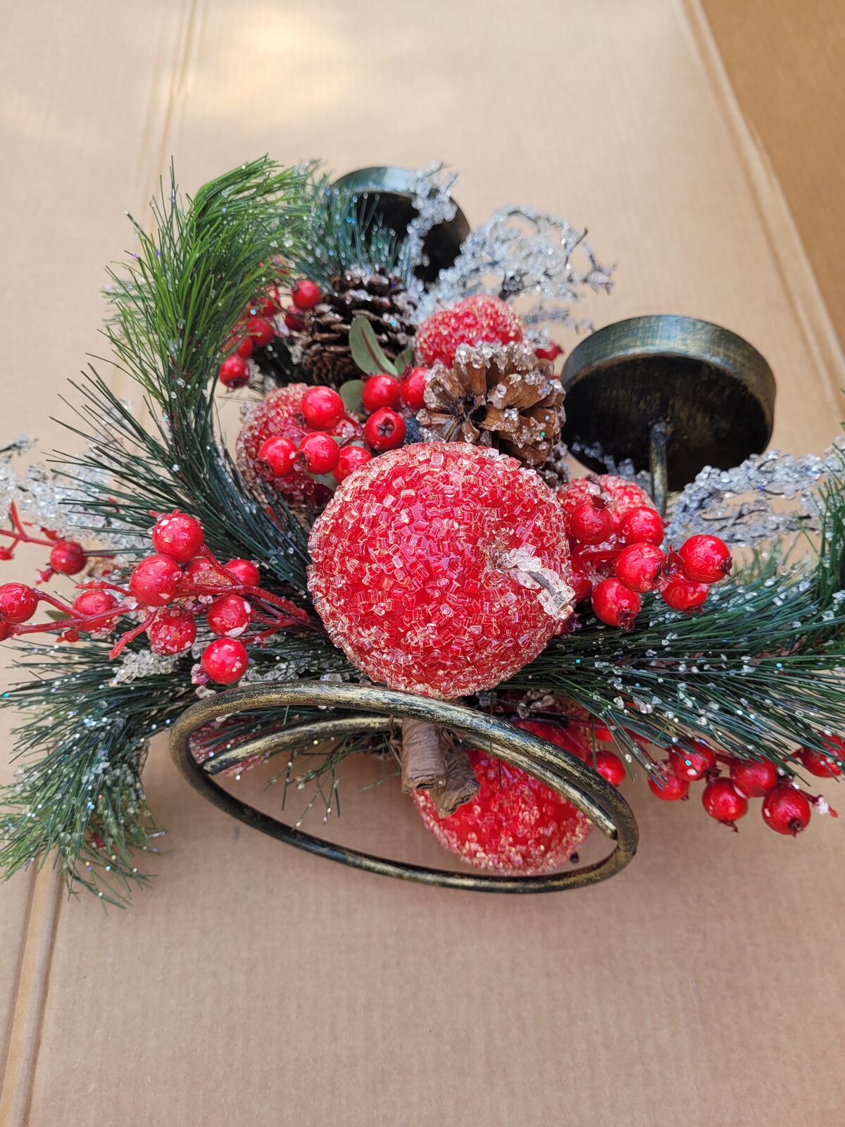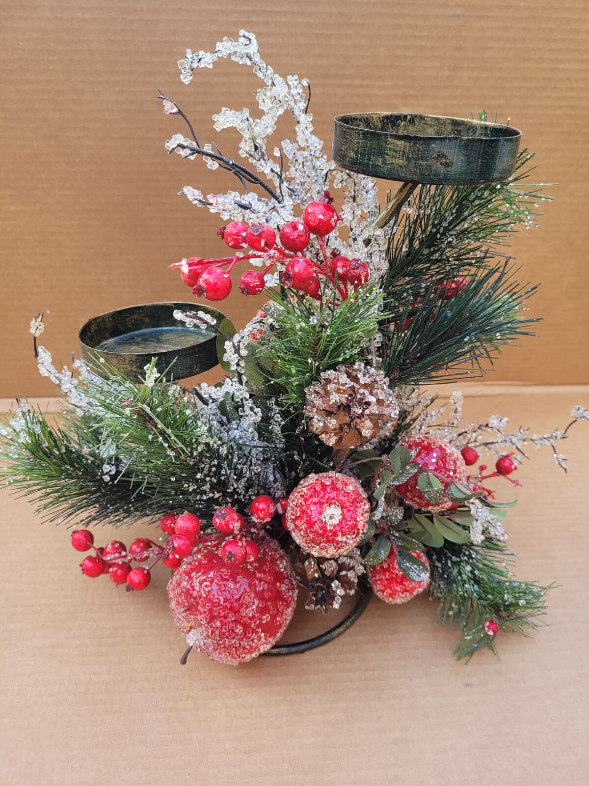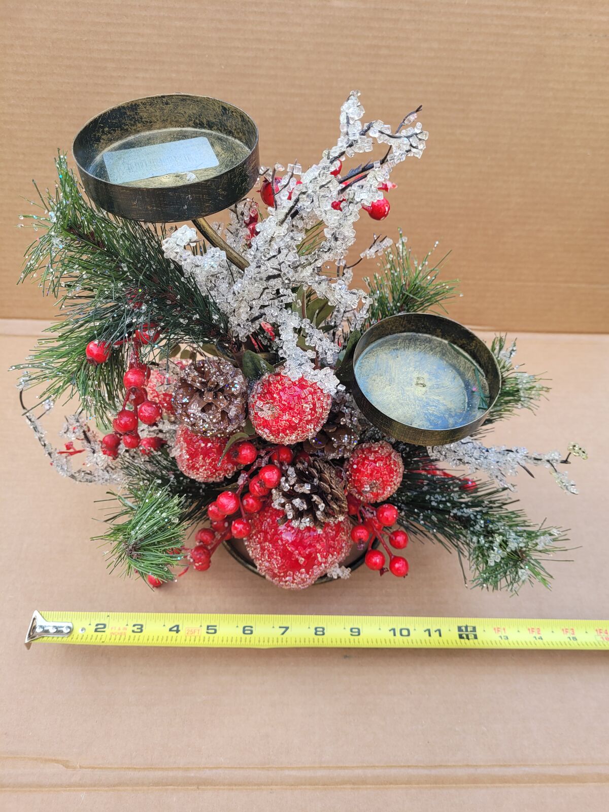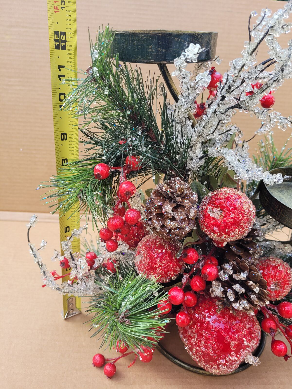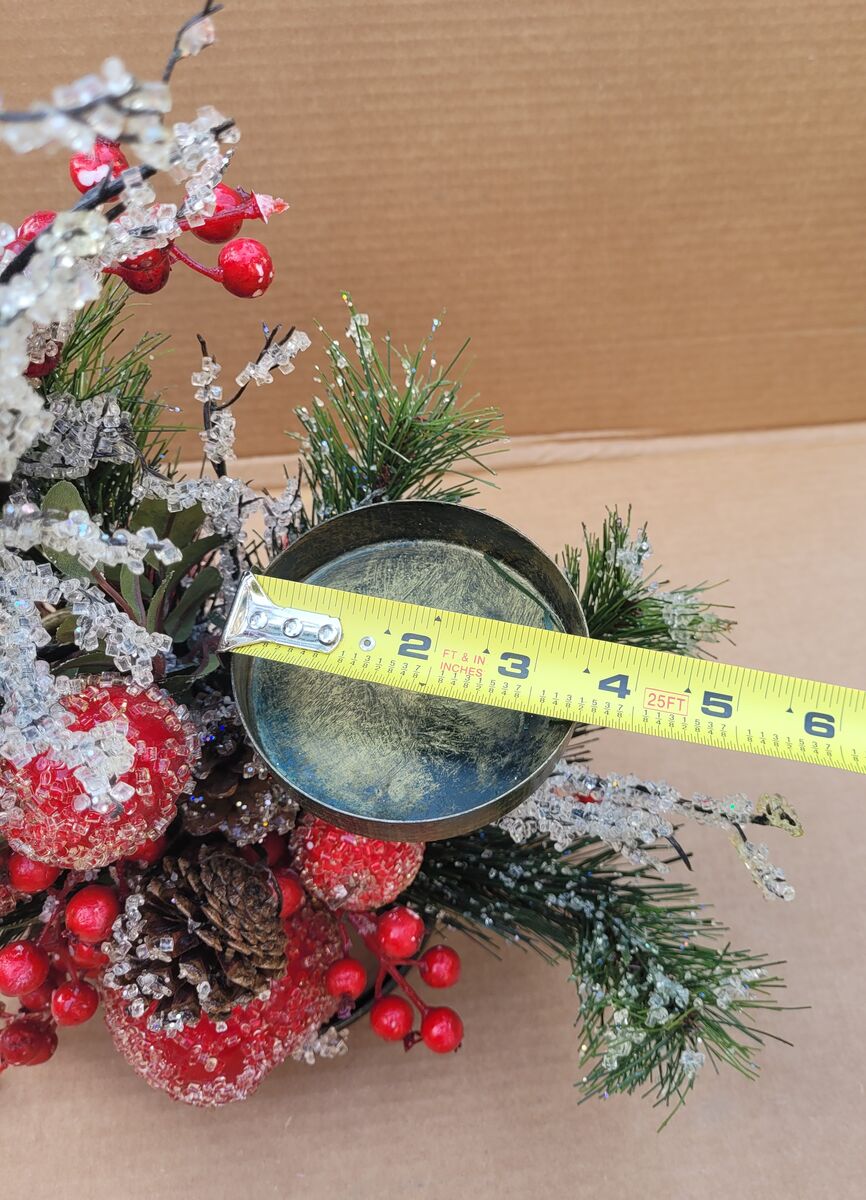This beautiful bronze colored two tiered metal candle holder has it all. Fruit and berries, pine cones and branches, some sugar frosted, some glittered, some both. Decorated all around it could make a great center piece for your holiday table, put it on your mantle or side table. See photos for measurements. Use it with real candles or battery operated ones with a timer or remote.
