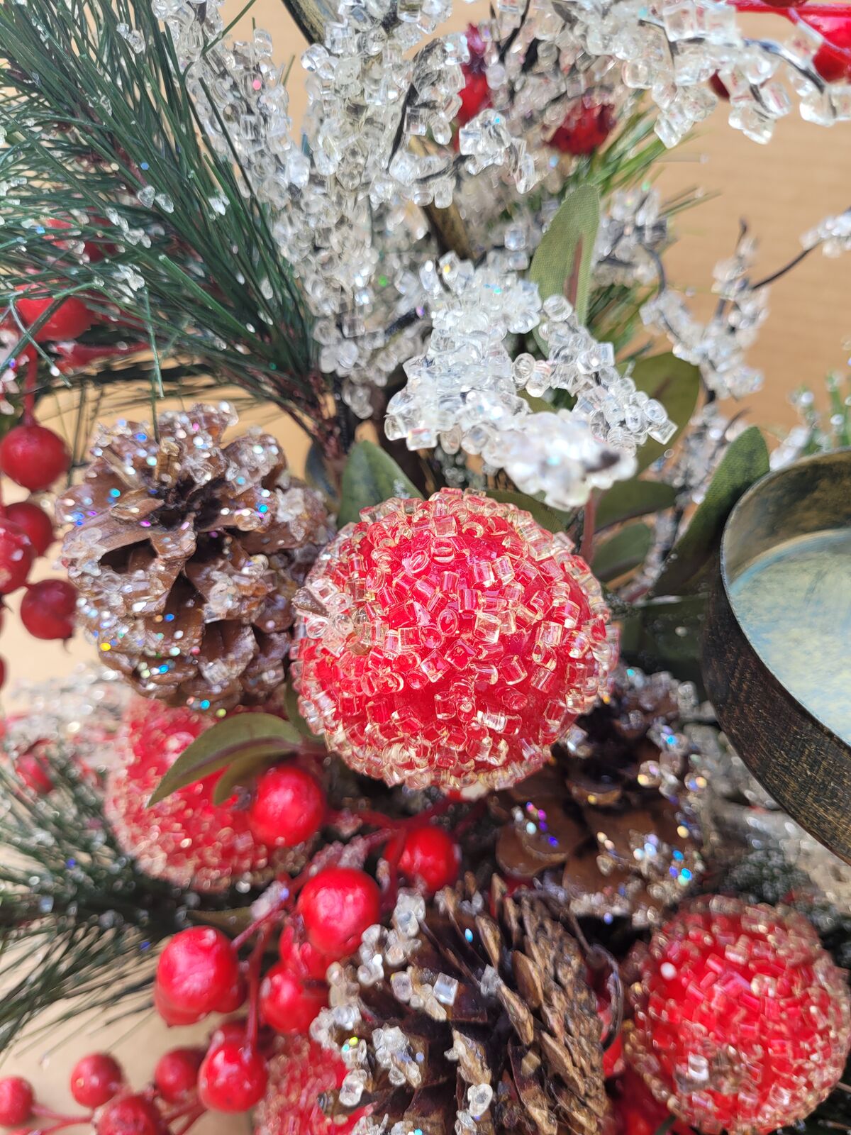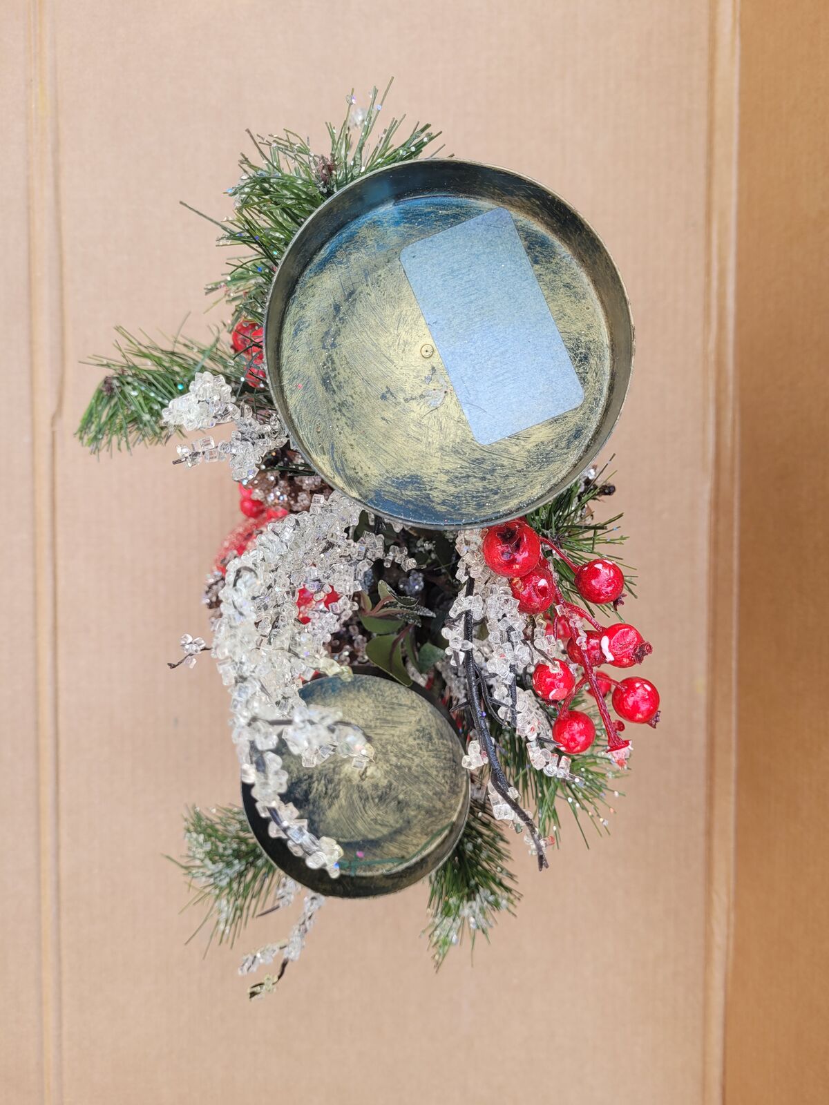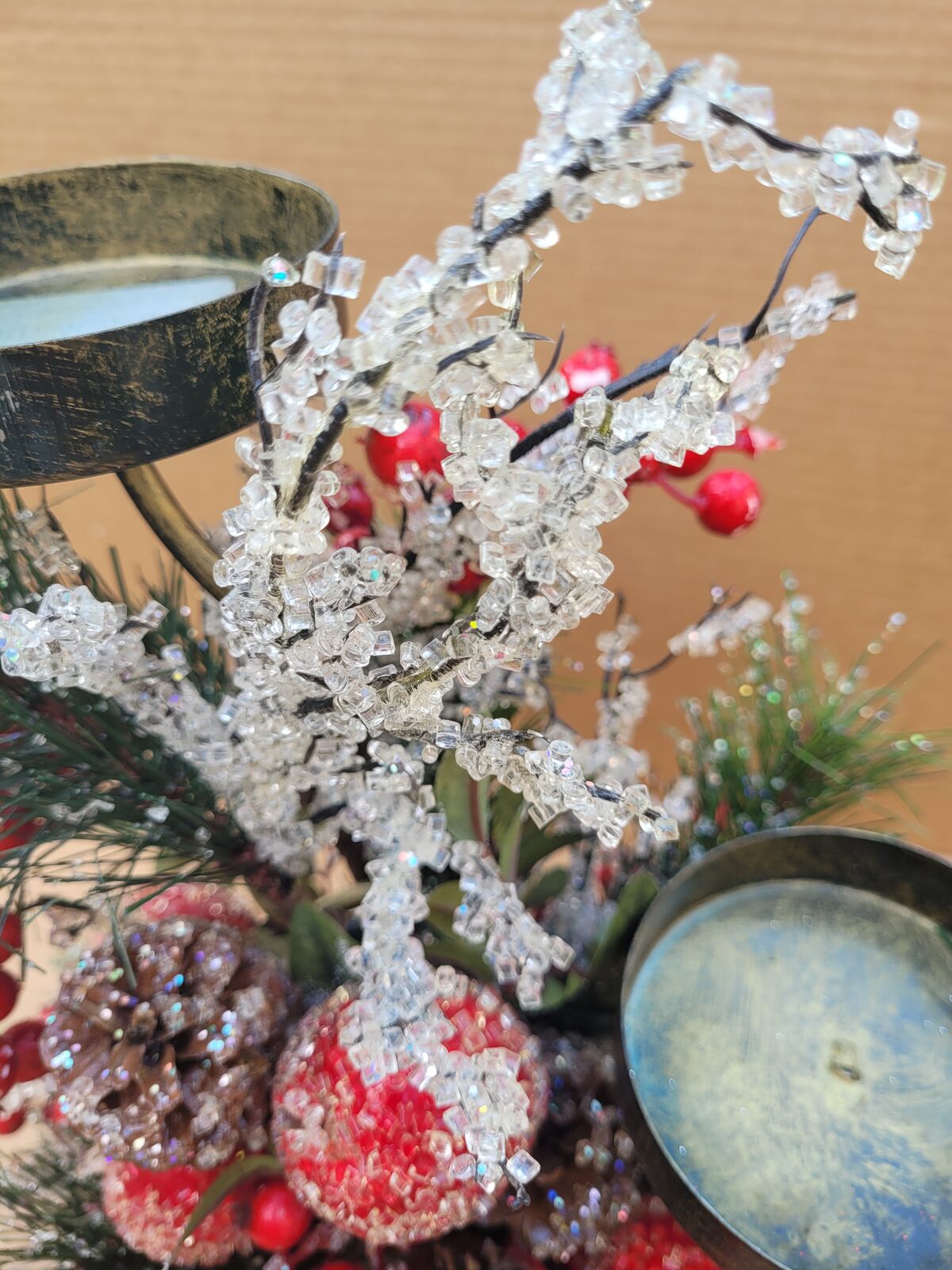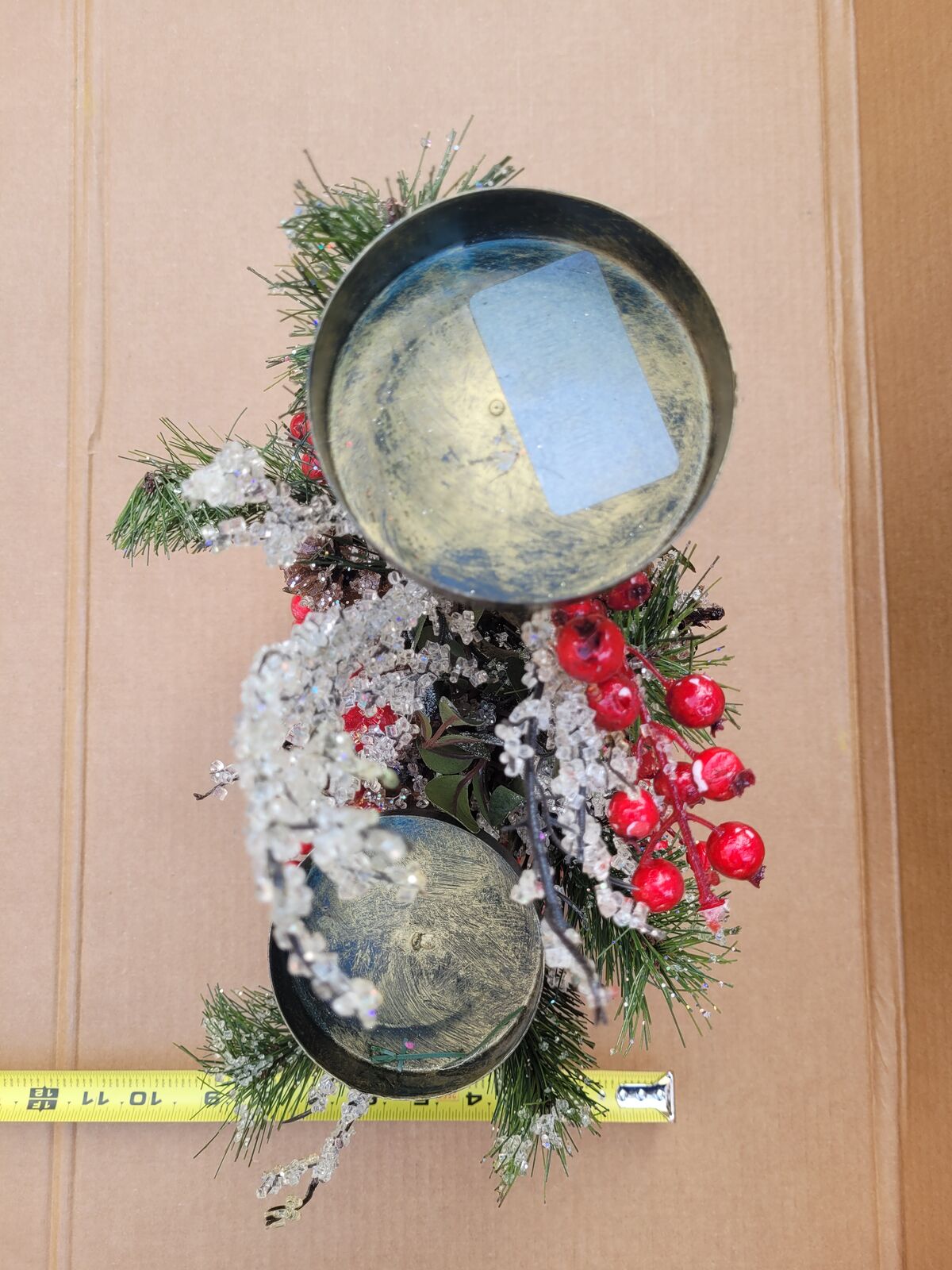 This beautiful bronze colored two tiered metal candle holder has it all. Fruit and berries, pine cones and branches, some sugar frosted, some glittered, some both. Decorated all around it could make a great center piece for your holiday table, put it on your mantle or side table. See photos for measurements. Use it with real candles or battery operated ones with a timer or remote.