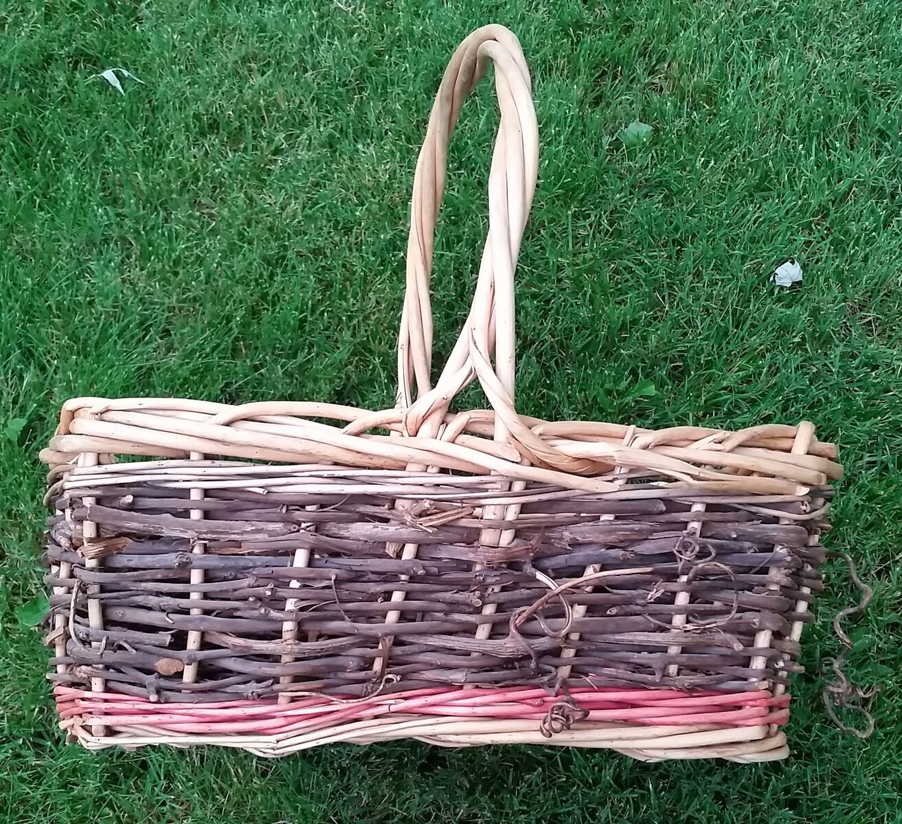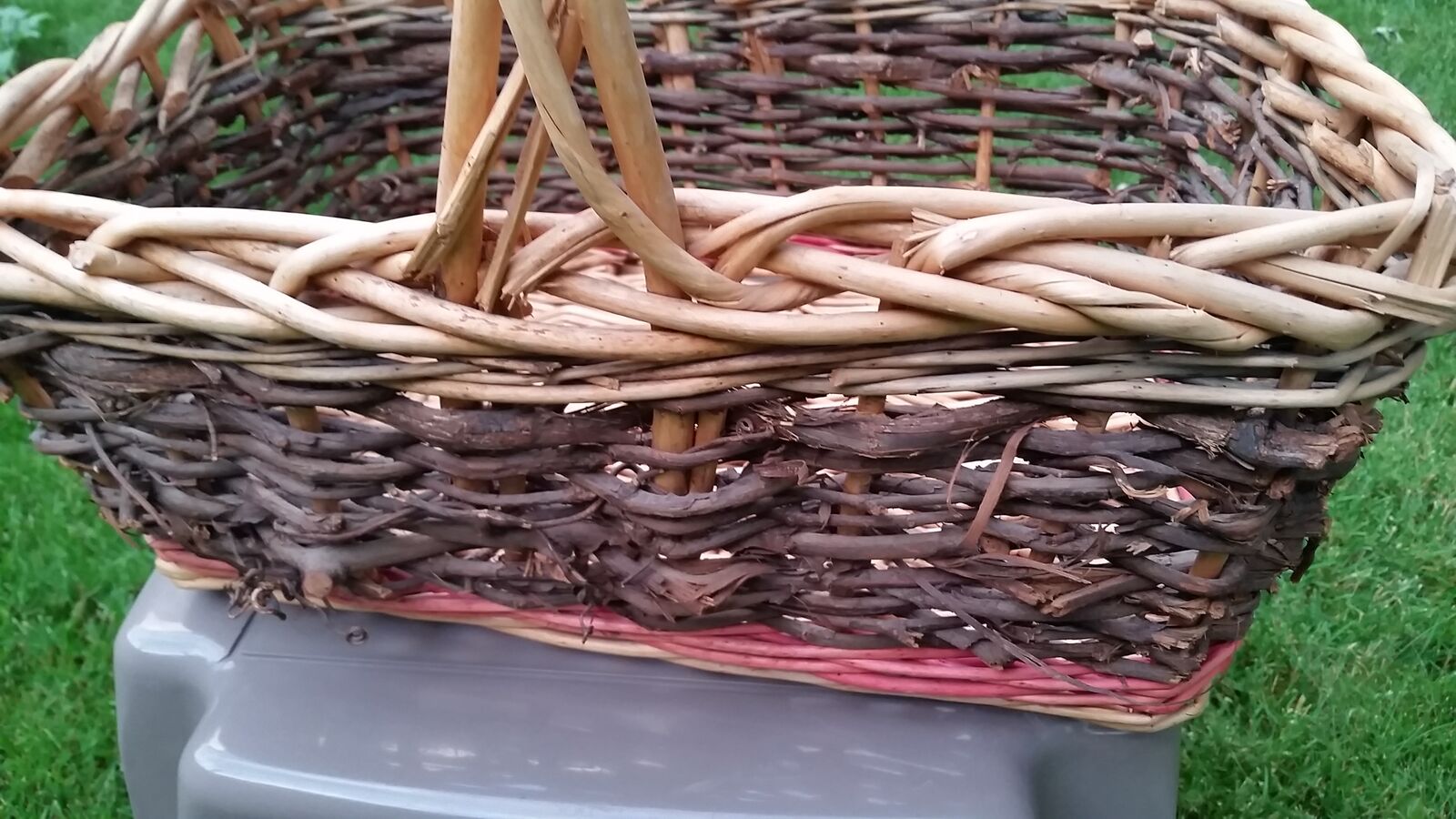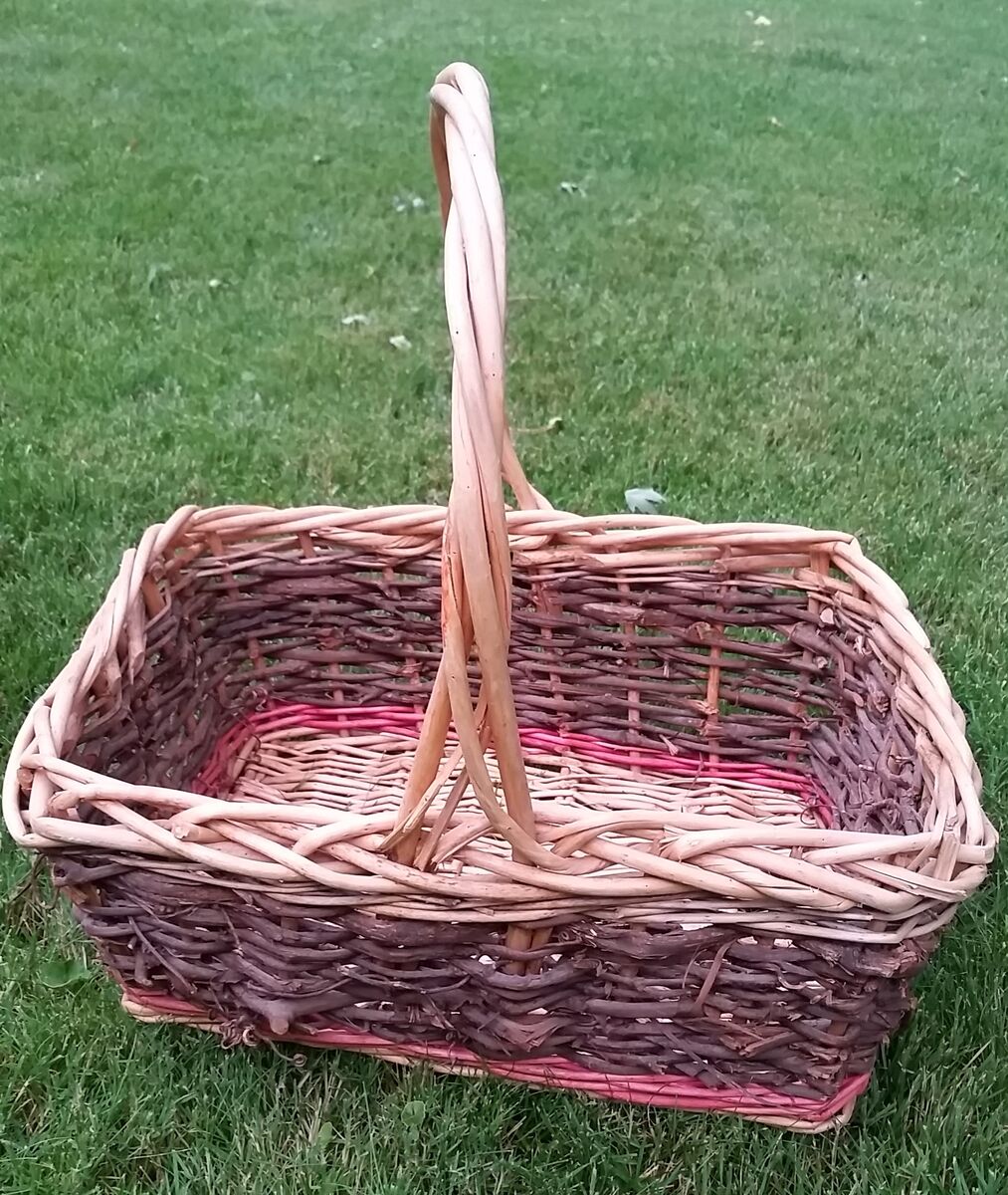 Large wicker and natural grapevine basket complete with grapevine curlicues. Also has a light red dyed accent color.