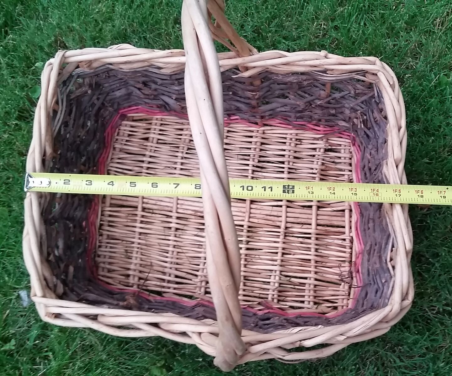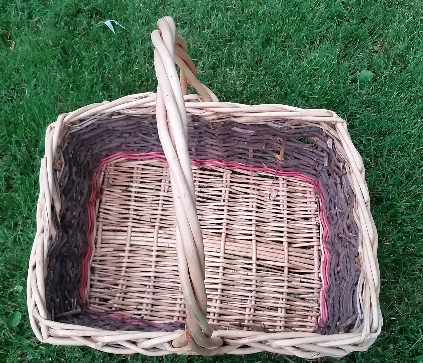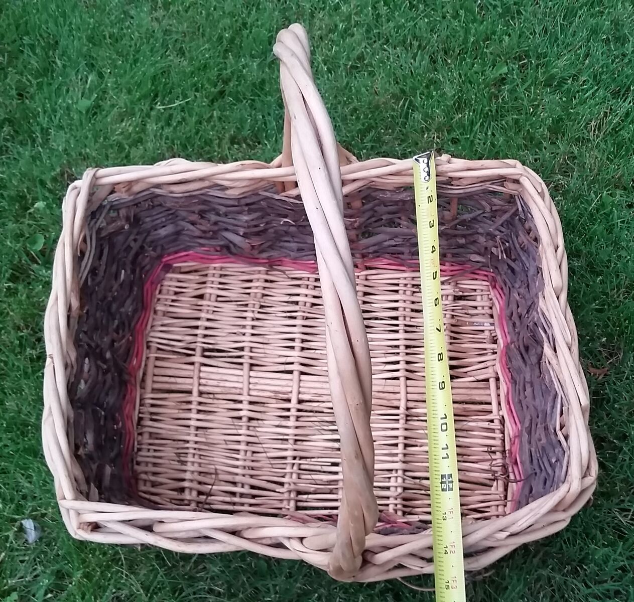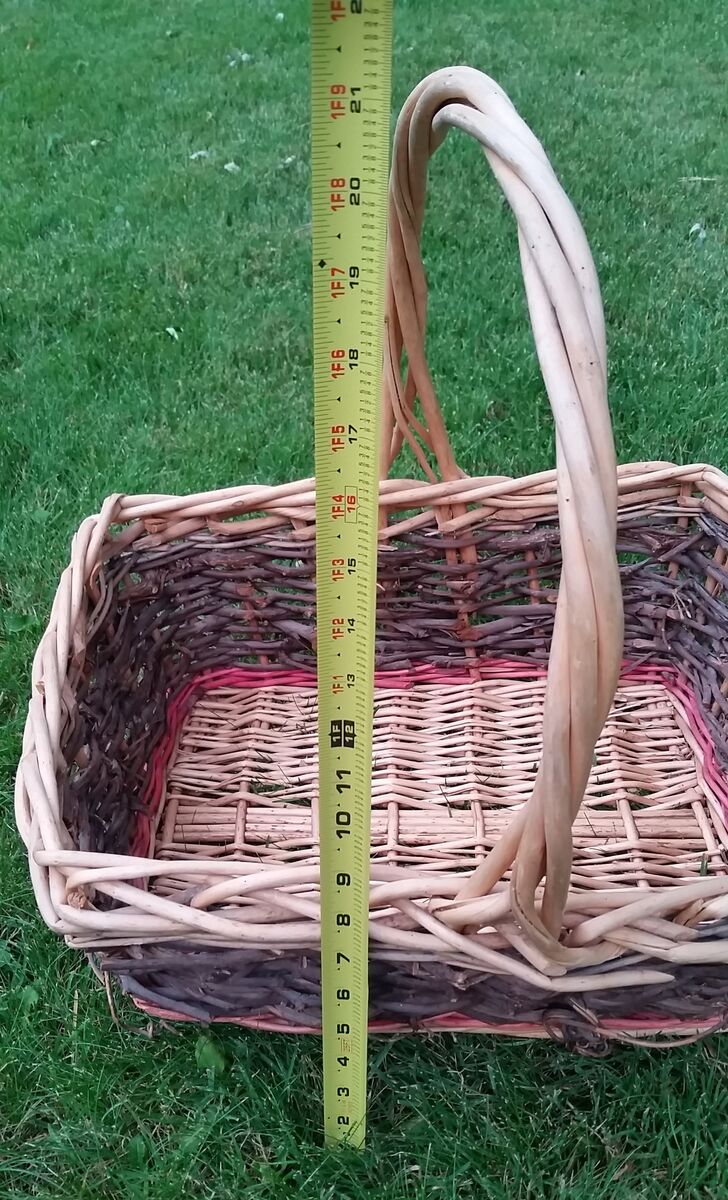 Large wicker and natural grapevine basket complete with grapevine curlicues. Also has a light red dyed accent color.