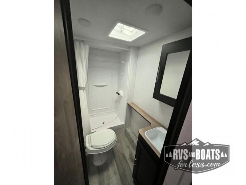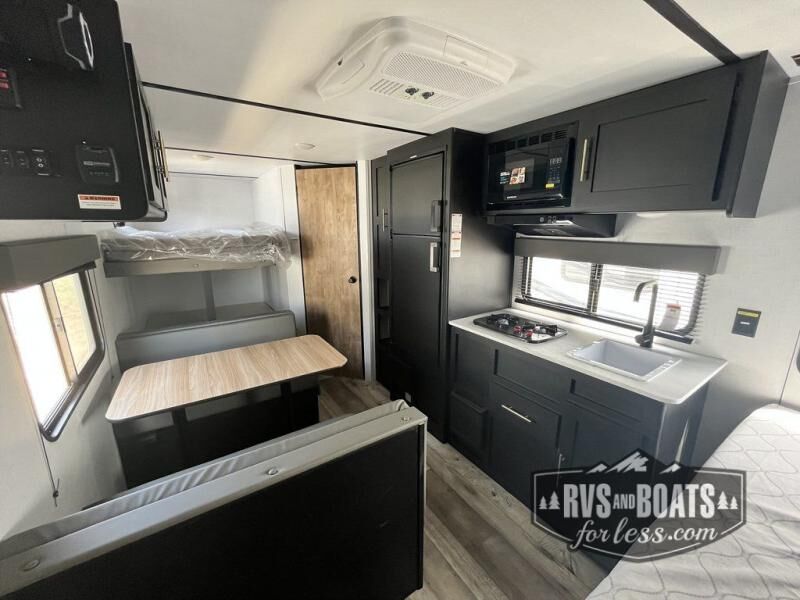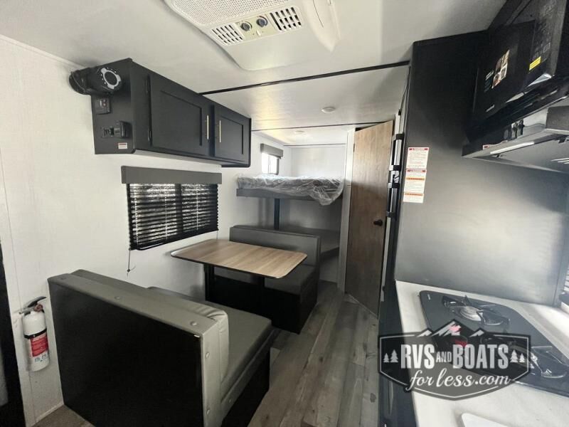 This double axle trailer offers lots of sleeping space for your family and friends with the double-size bunk beds, the queen bed and the booth dinette. Once everyone selects their sleeping space, you can take turns getting cleaned up in the full bathroom with extra counter space for everyone's toiletries. The cook can whip up a snack before bedtime on the two burner cooktop or grab something from the 6 cu. ft. refrigerator and the pantry. There is a closet up front, overhead storage throughout, and inside storage under the bunk for everyone's things. And the exterior provides a pass-through compartment for more items and the outdoor gear like fishing poles and camping chairs.