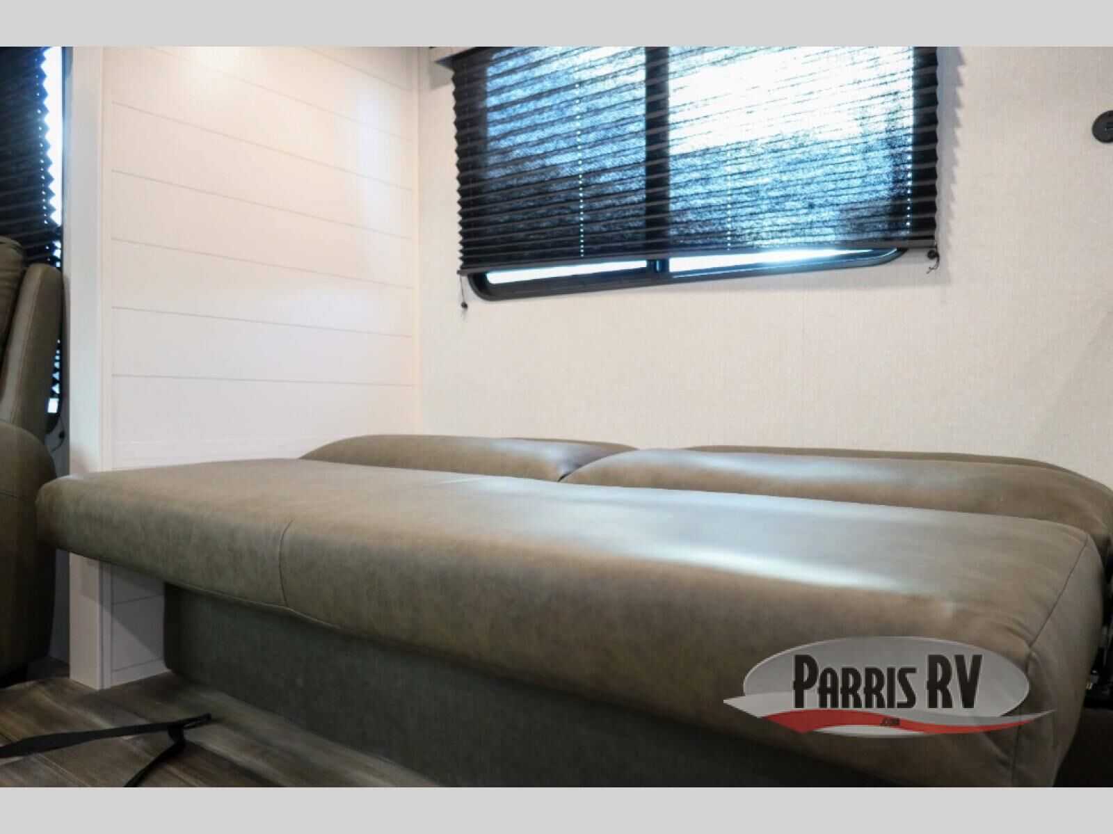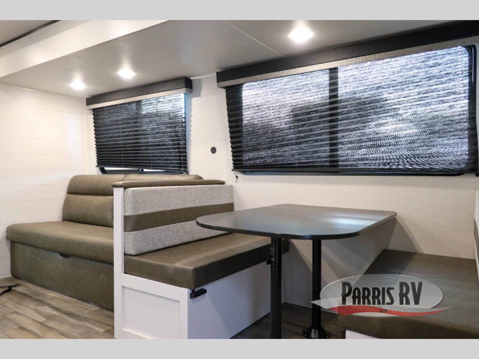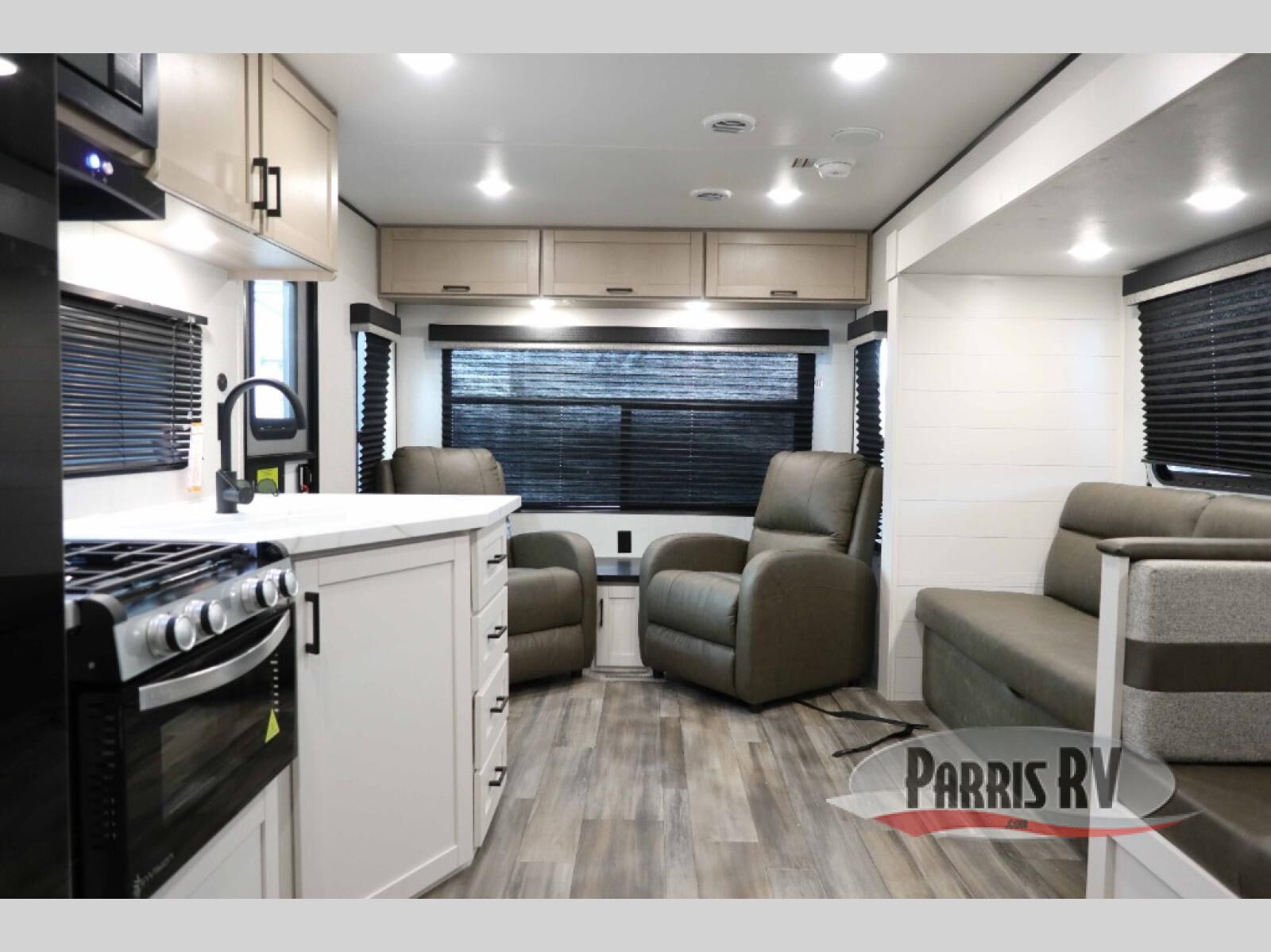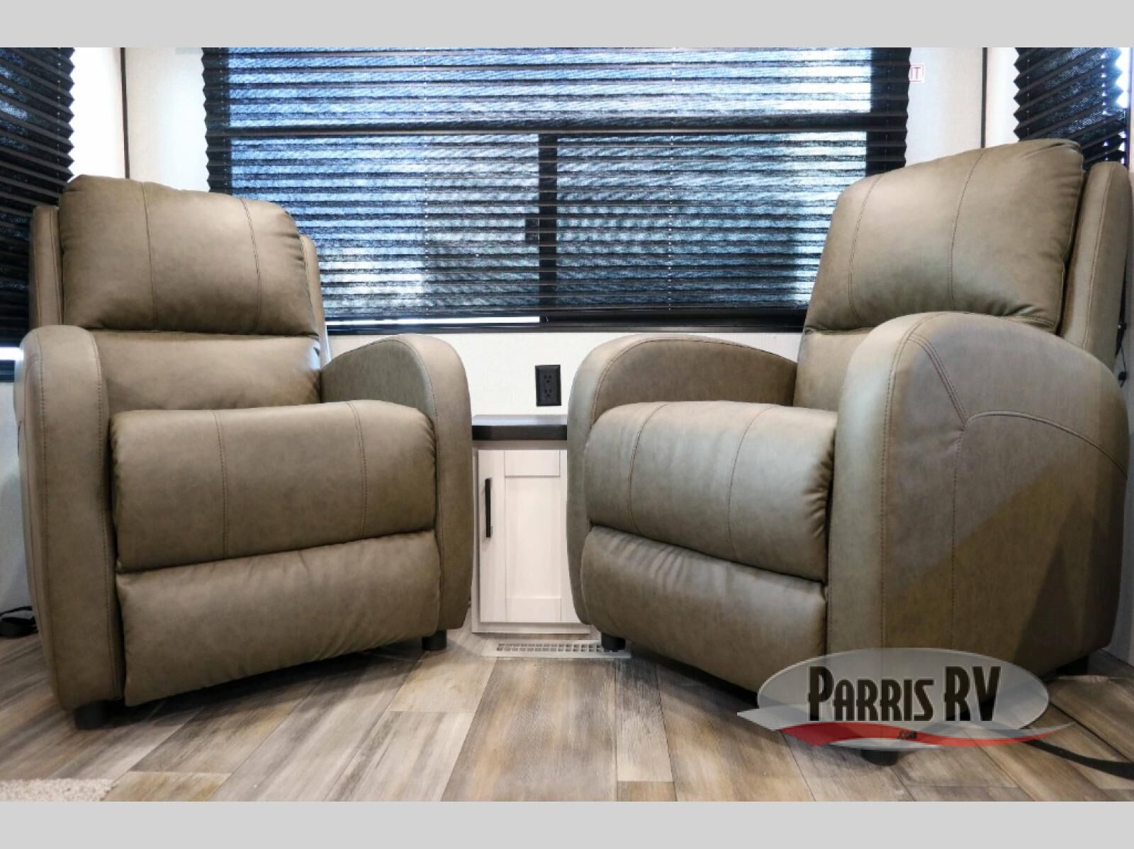 With dual entry doors in this unit, you can enter in through the front master bedroom or the rear living room! The dual lounge chairs in the back will let you relax with a book and your coffee, and there is a large slide out with a jack-knife sofa and booth dinette for additional seating spaces. The chef of your group can make meals on the three-burner cooktop or in the microwave oven, and there is a pantry for dry goods or snacks. The walk-thru bath is easily accessible for everyone to use, and the front master bedroom with a 60" x 74" RV queen bed will make you feel right at home!