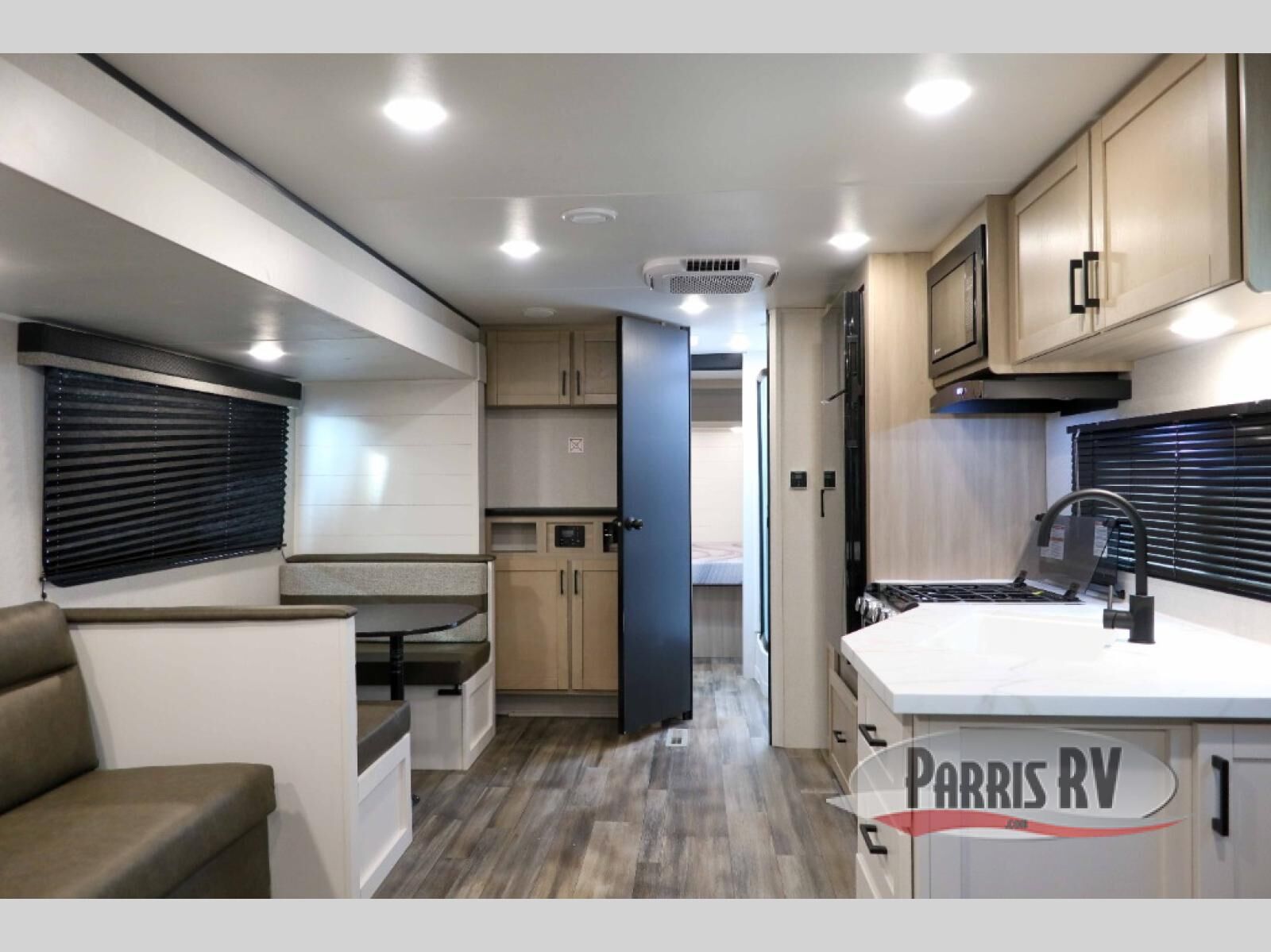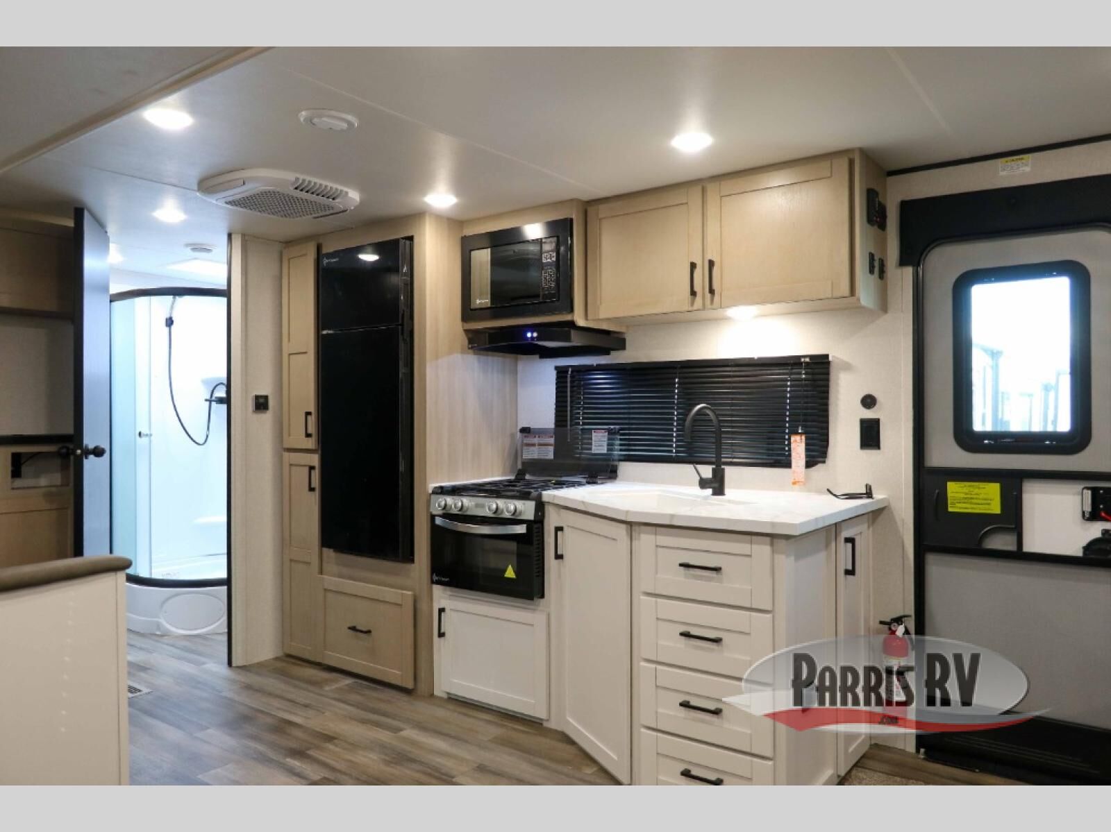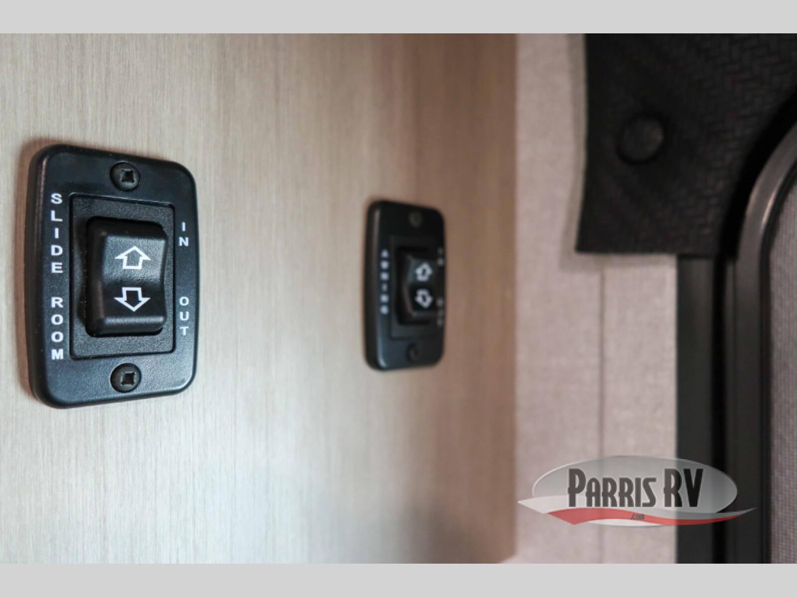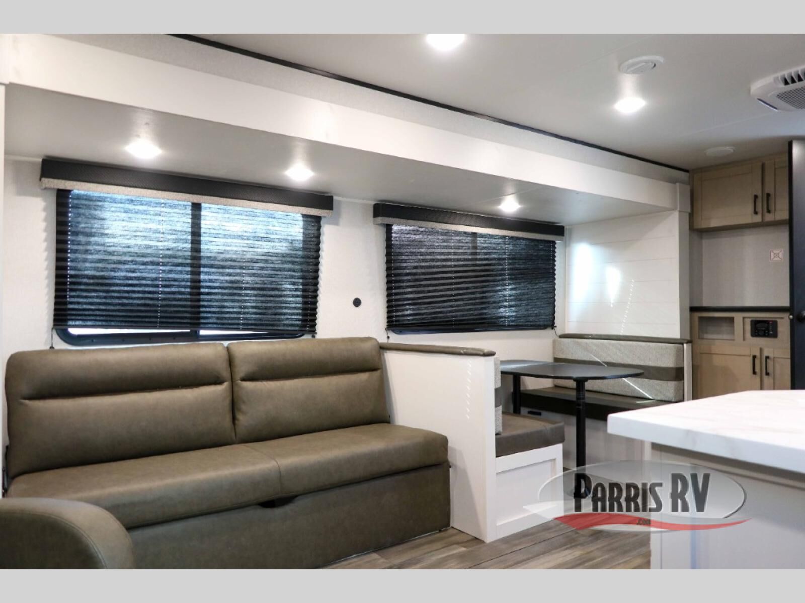 With dual entry doors in this unit, you can enter in through the front master bedroom or the rear living room! The dual lounge chairs in the back will let you relax with a book and your coffee, and there is a large slide out with a jack-knife sofa and booth dinette for additional seating spaces. The chef of your group can make meals on the three-burner cooktop or in the microwave oven, and there is a pantry for dry goods or snacks. The walk-thru bath is easily accessible for everyone to use, and the front master bedroom with a 60" x 74" RV queen bed will make you feel right at home!
