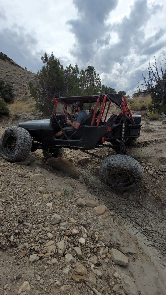 1994 jeep partial body Ford full size Dana 60 equivalent axles. 4:10 gears. warn hubs on 32 spline chromoly stub shafts spool in the front and Detroit locker in the rear. front is the ball joint Dana 60 and the rear is the sterling 9.25 4.3L vortec chevy engine. painless wiring harness sm465 4 speed standard transmission Dana 24 twin stick transfer case. 42x14.5R20 sticky BFG tires. 20" dirty life wheels full hydraulic steering 16" travel FOA coilovers 12000lb fron winch set up as suck down and pull winch 116" Wheelbase