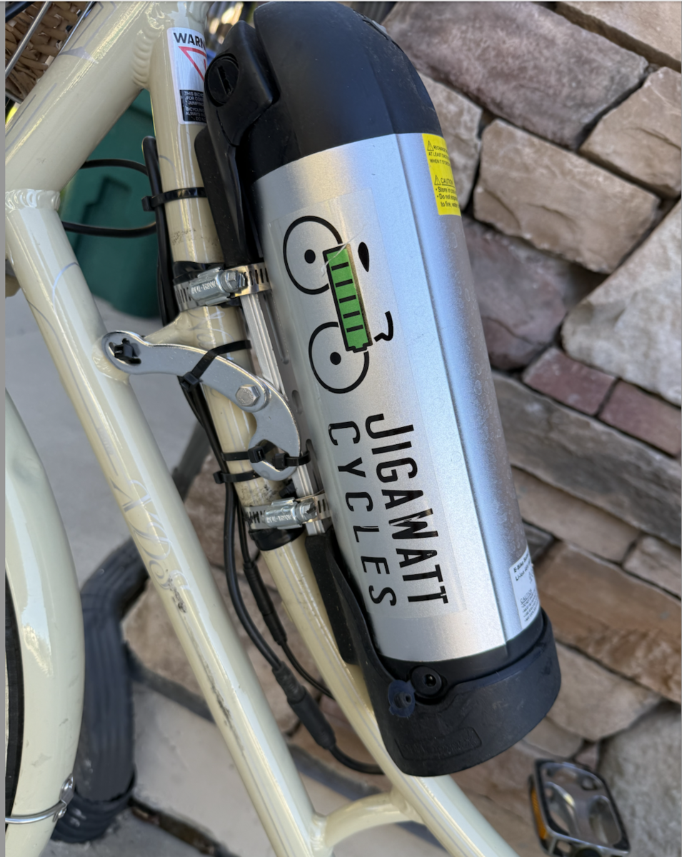 VenmoHigh power (48V) XDS Women’s Nadine dutch E-bike. Classic European styling, leather saddle, removable wicker basket, and rear rack. 7 speeds. The motor is mounted in the front hub, and the battery is mounted on the down tube. Kickstand needs to be tightened, but otherwise is in good shape.