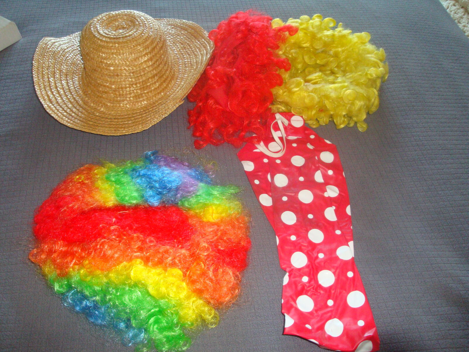 adult size clown costumes. 1 new - still in package $5, others $3 ea. wigs - $3 ea; tie and hat - $1 ea. hat with sunflower - $3; witch's broom - $3. Susan 801-875-2200