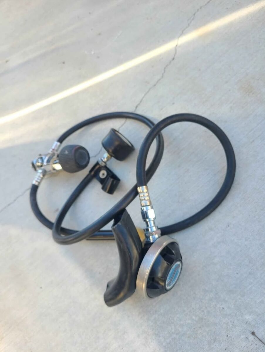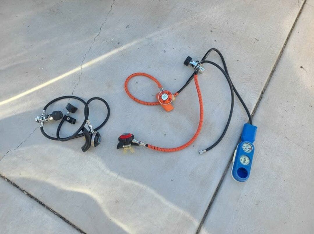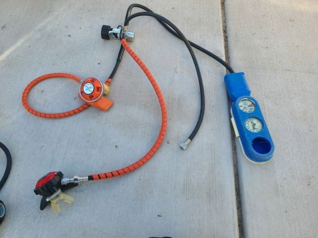 set with 2 sherwood mouth pieces, a 3 way splitter, regulator and gages, the console is missing the hr/min if you want to replace that I will just throw the whole console in the set for free, does have the psig and depth guages. $150