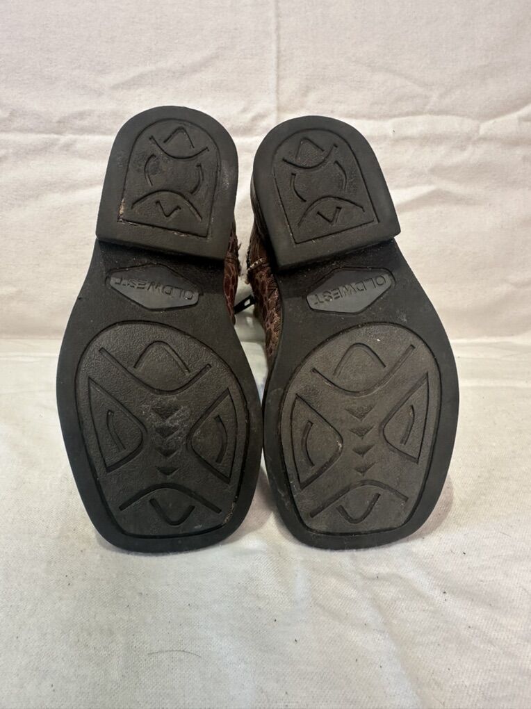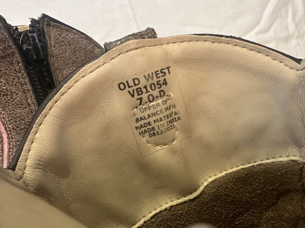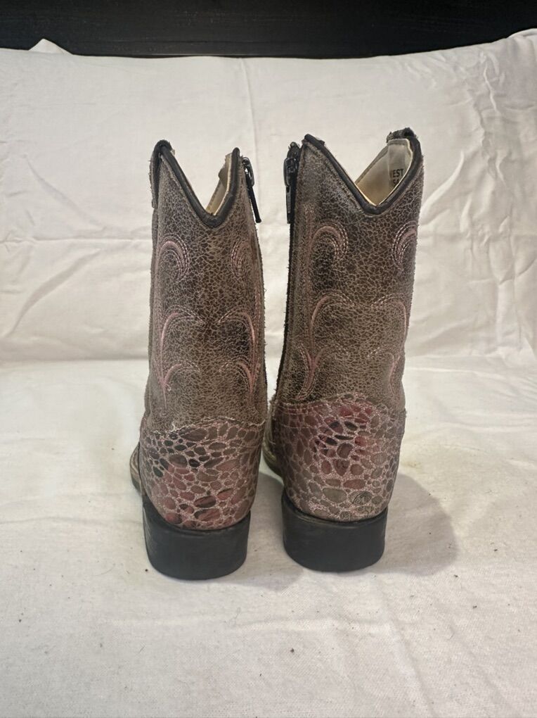 Old west toddler, size 7 brown and pink with glitter on the foot bed and inside zippers for easy on off. These are in good condition, see photos for details. I take cash or Venmo, but cash is preferred. Text is best. 801-201-4446. Check out my other ads for additional sizes and styles.