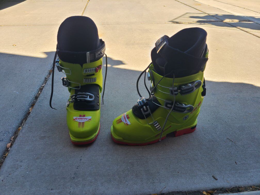 Nordica TR 12 light touring ski boots, 26-26.5 with vibram sole.