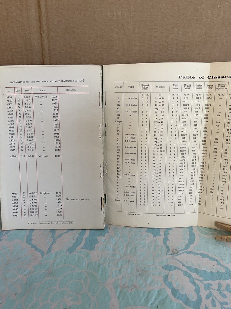 Locomotives of the Southern Railway (Eastern Section) 1929, (second edition), for British Railways. This survivor from pre-war is very detailed in text and images of many different locomotives. This softbound text is an excellent documentation of the period for any collector interested in early British railways. The physical condition is far from ideal but fortunately the text and photographs are intact.