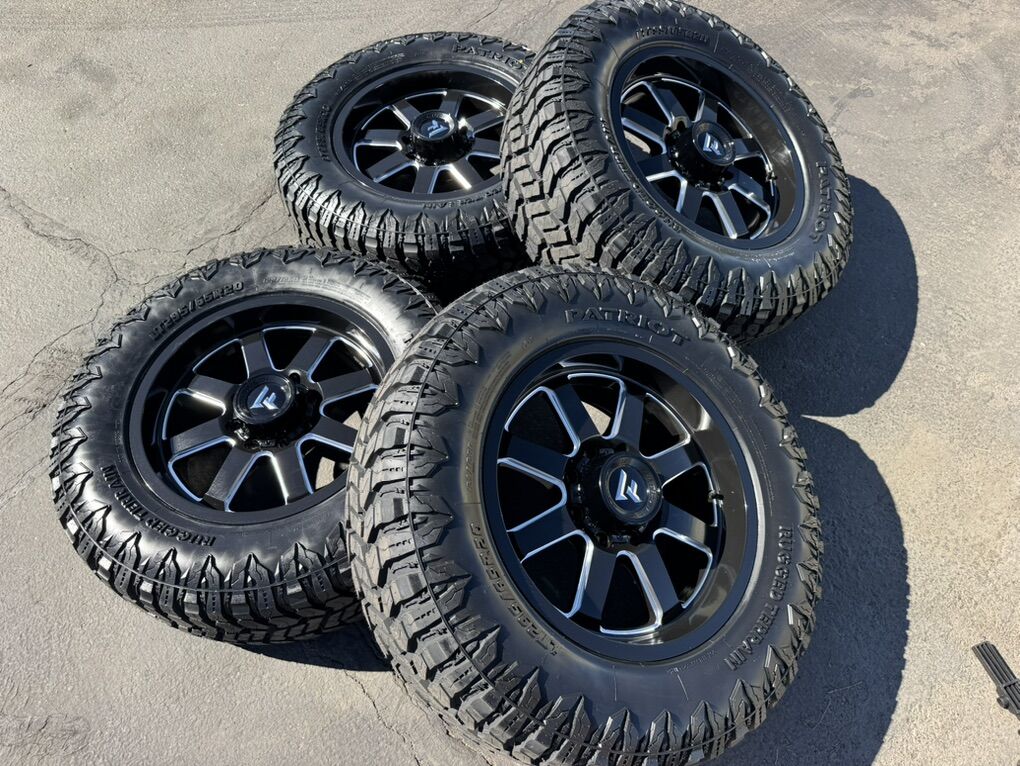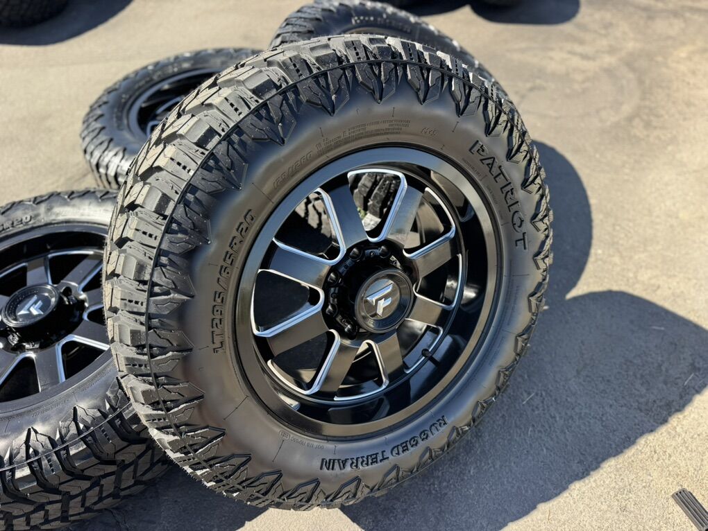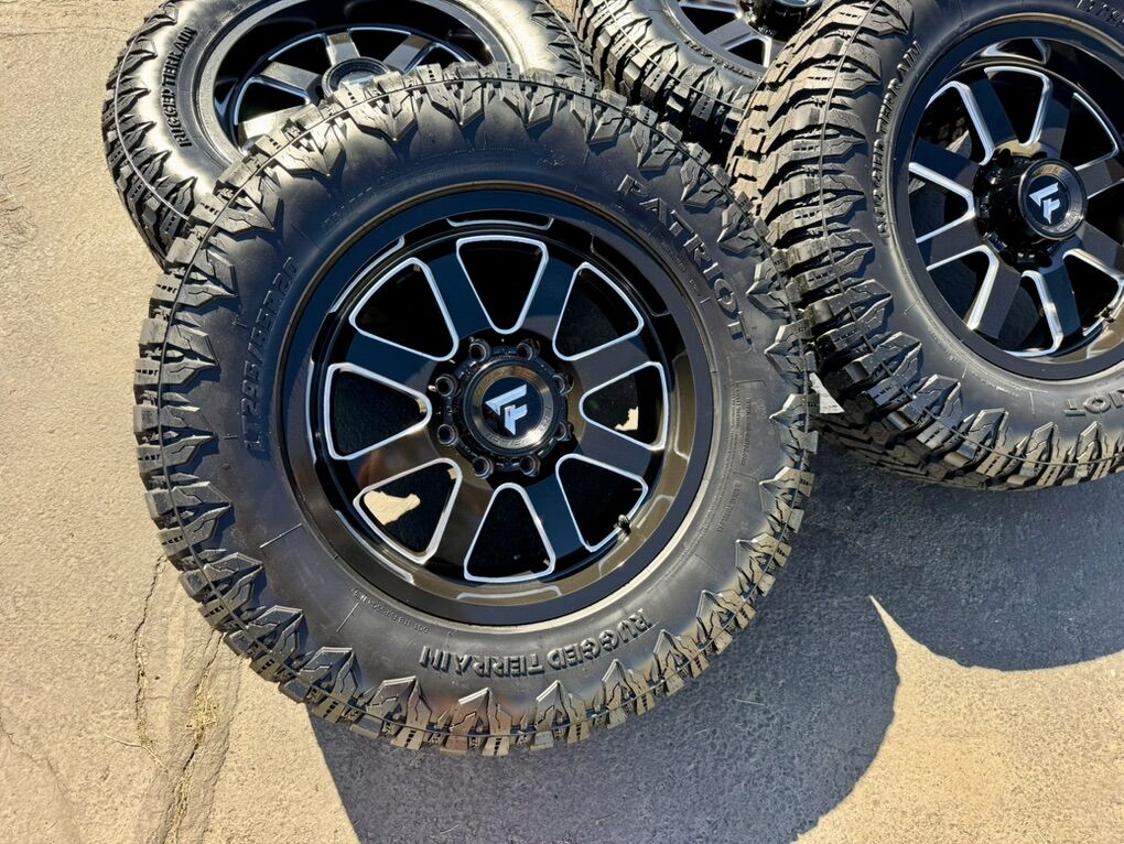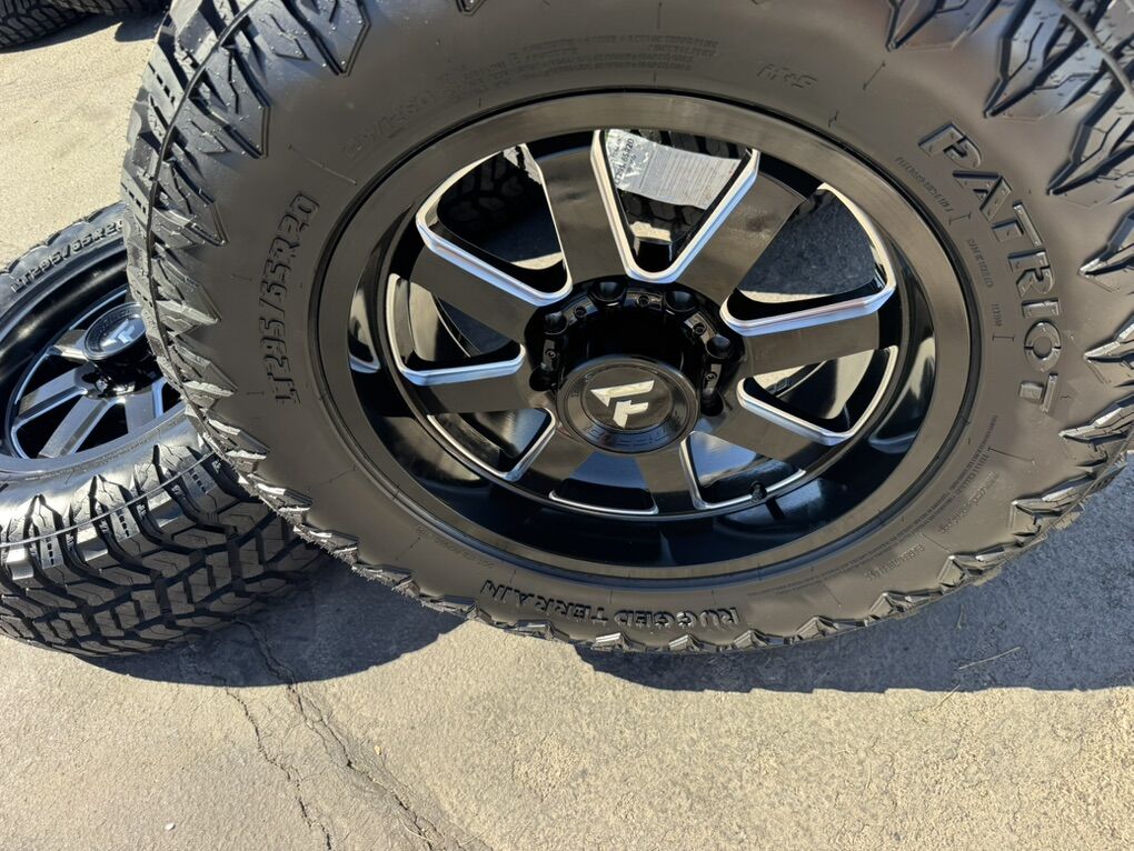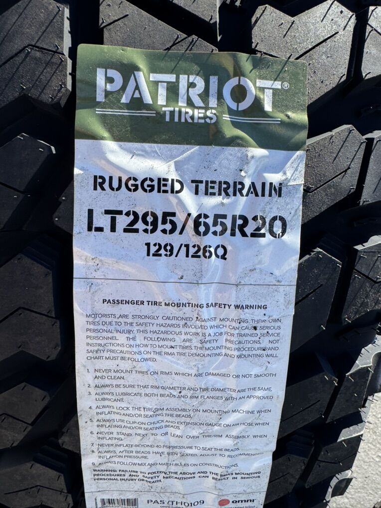 Brand new wheels and tires. Stickers still on everything, never mounted to a truck. Tires are Patriot R/T 295/65R20 which is roughly 35x11.50x20 10 ply Load Range E 80psi rated 129 load rating