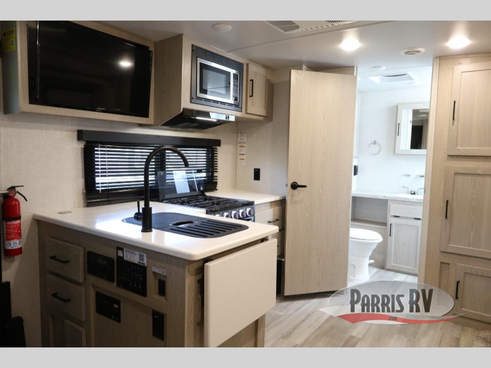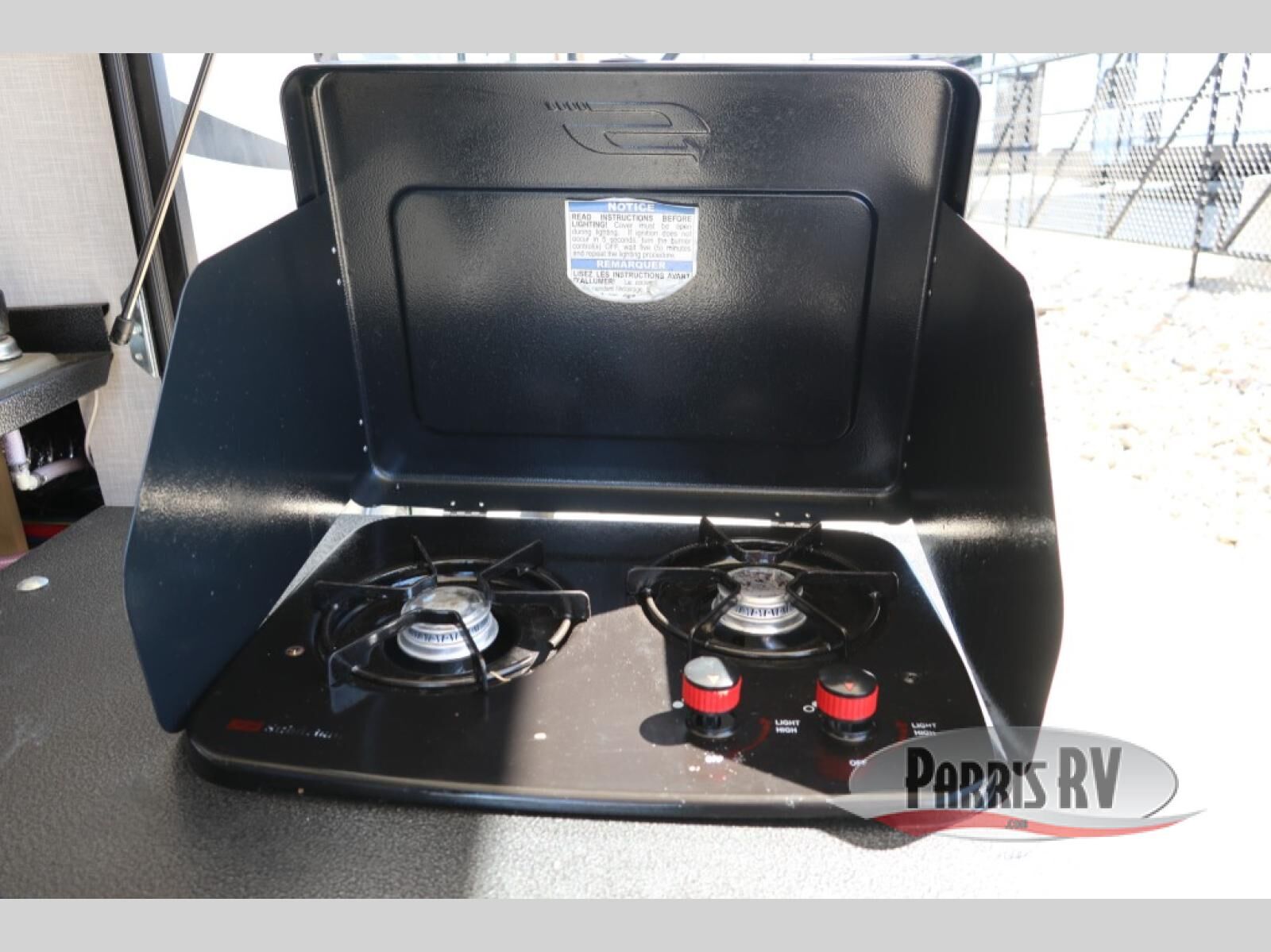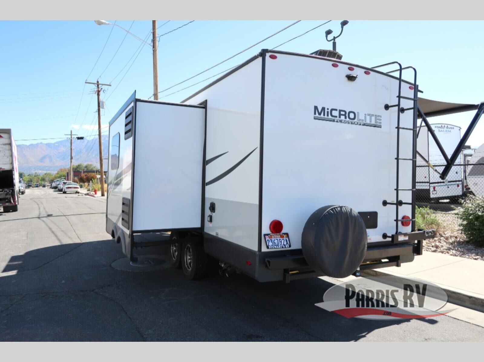 This excellent Flagstaff Micro Lite travel trailer has just what you want! There is a private bedroom with an RV queen bed and wardrobe slide, and the kitchen provides you with a three-burner range, gas oven, double-bowl sink, and countertop extension. The 67" theater seating is perfectly placed to enjoy the warmth of the fireplace, and there are also two pantries so that you can grab a snack before sitting down to relax. The rear bathroom is full of all of the essentials, and there is also an outdoor kitchen on this model so that you can stay outside even while you are preparing dinner.