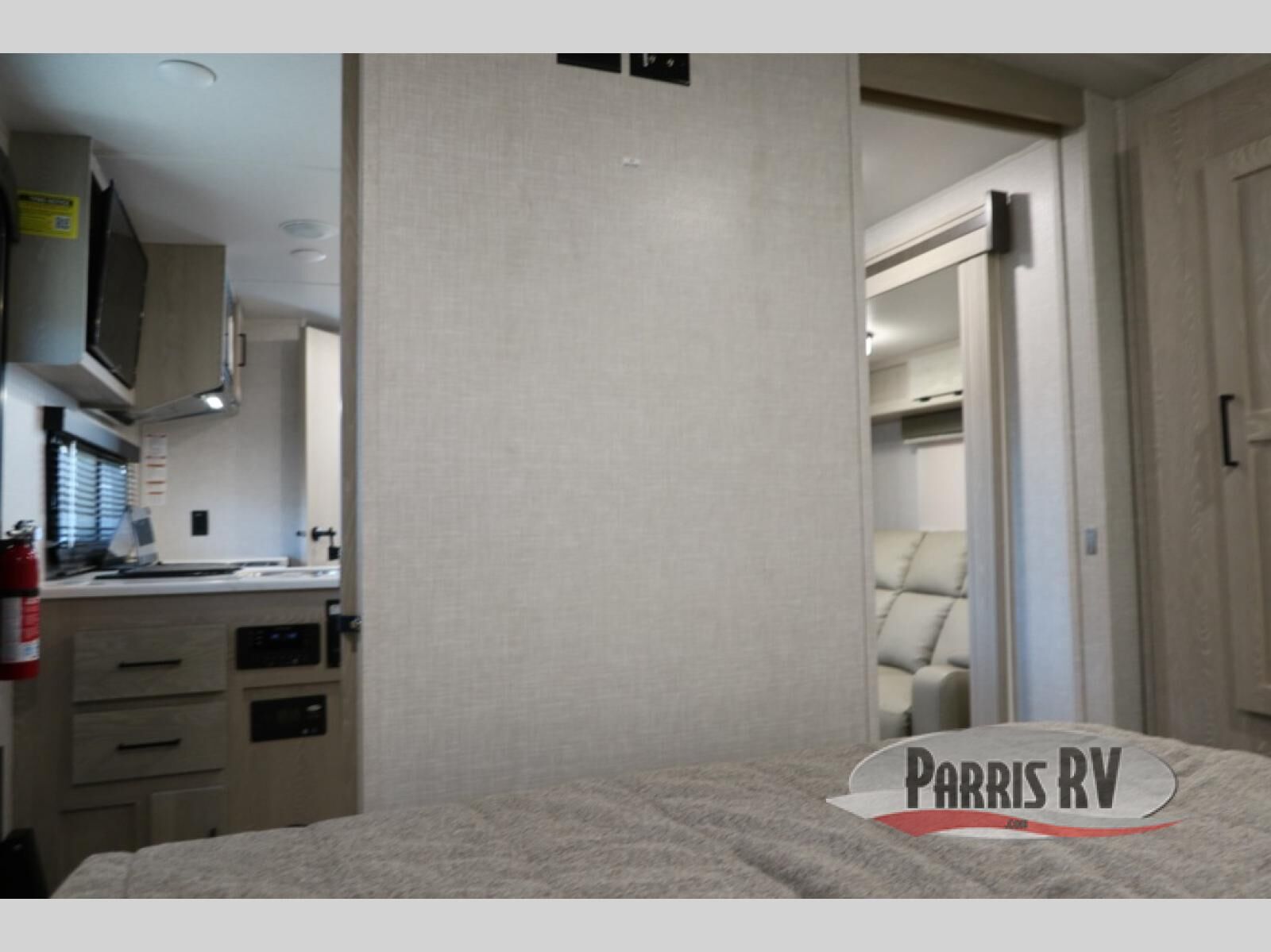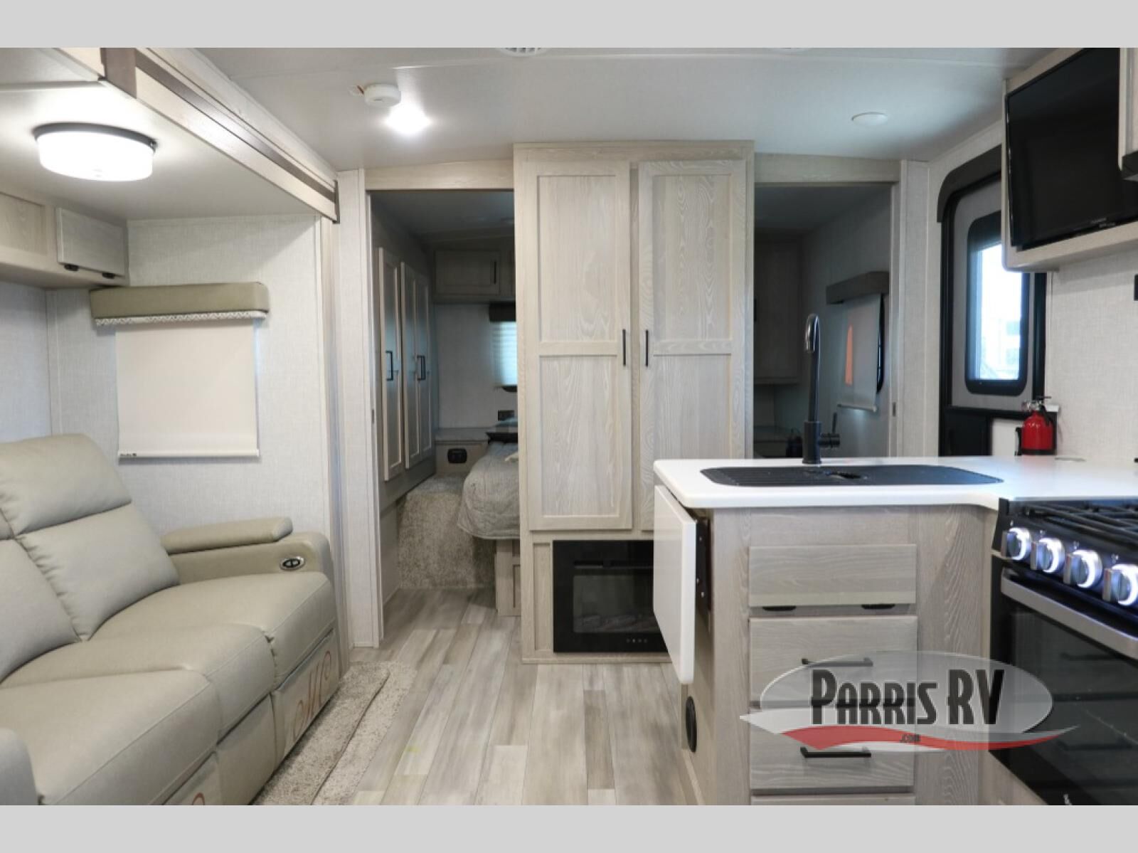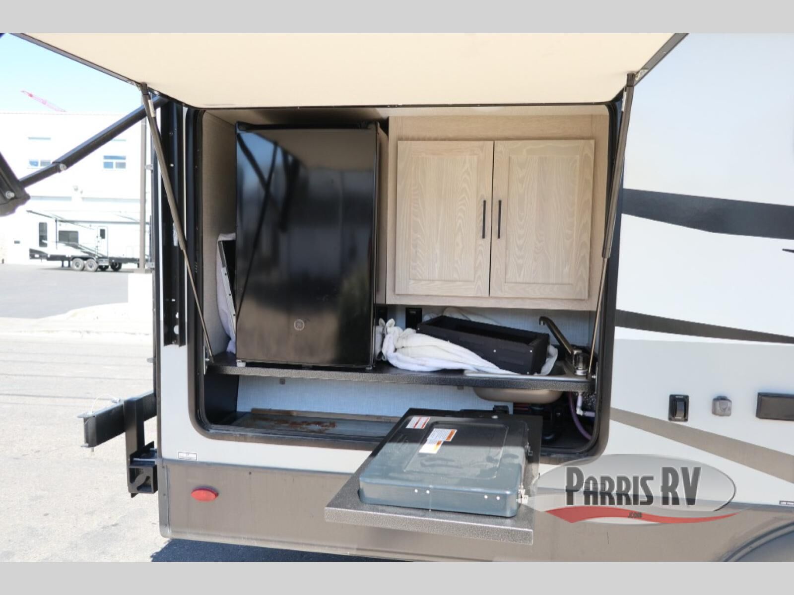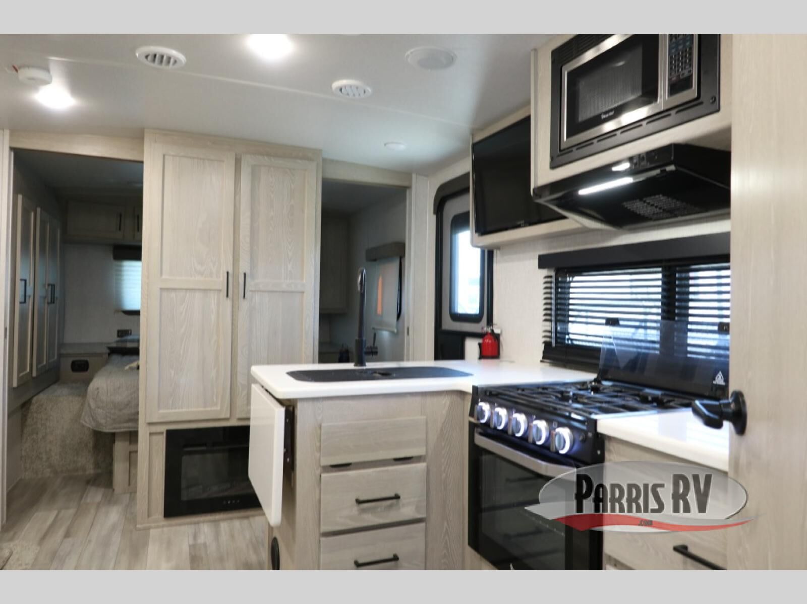 This excellent Flagstaff Micro Lite travel trailer has just what you want! There is a private bedroom with an RV queen bed and wardrobe slide, and the kitchen provides you with a three-burner range, gas oven, double-bowl sink, and countertop extension. The 67" theater seating is perfectly placed to enjoy the warmth of the fireplace, and there are also two pantries so that you can grab a snack before sitting down to relax. The rear bathroom is full of all of the essentials, and there is also an outdoor kitchen on this model so that you can stay outside even while you are preparing dinner.