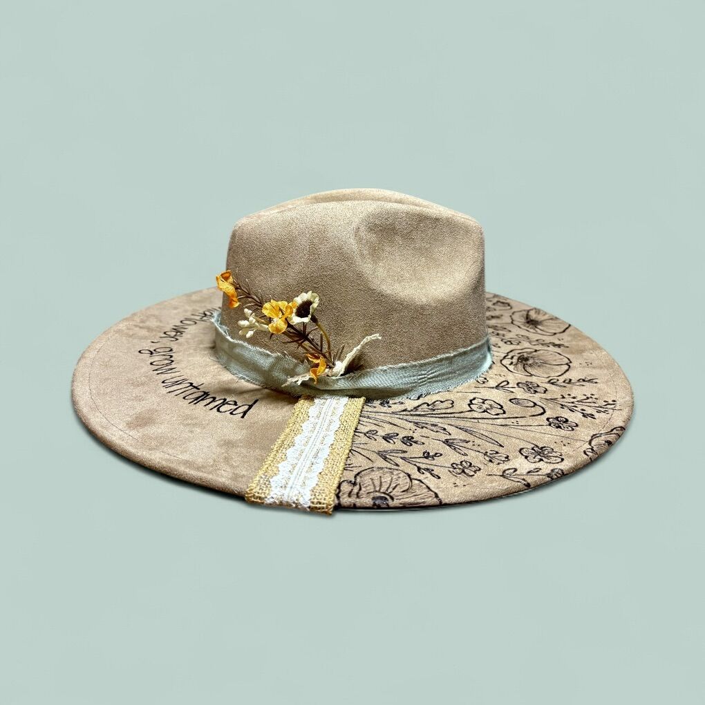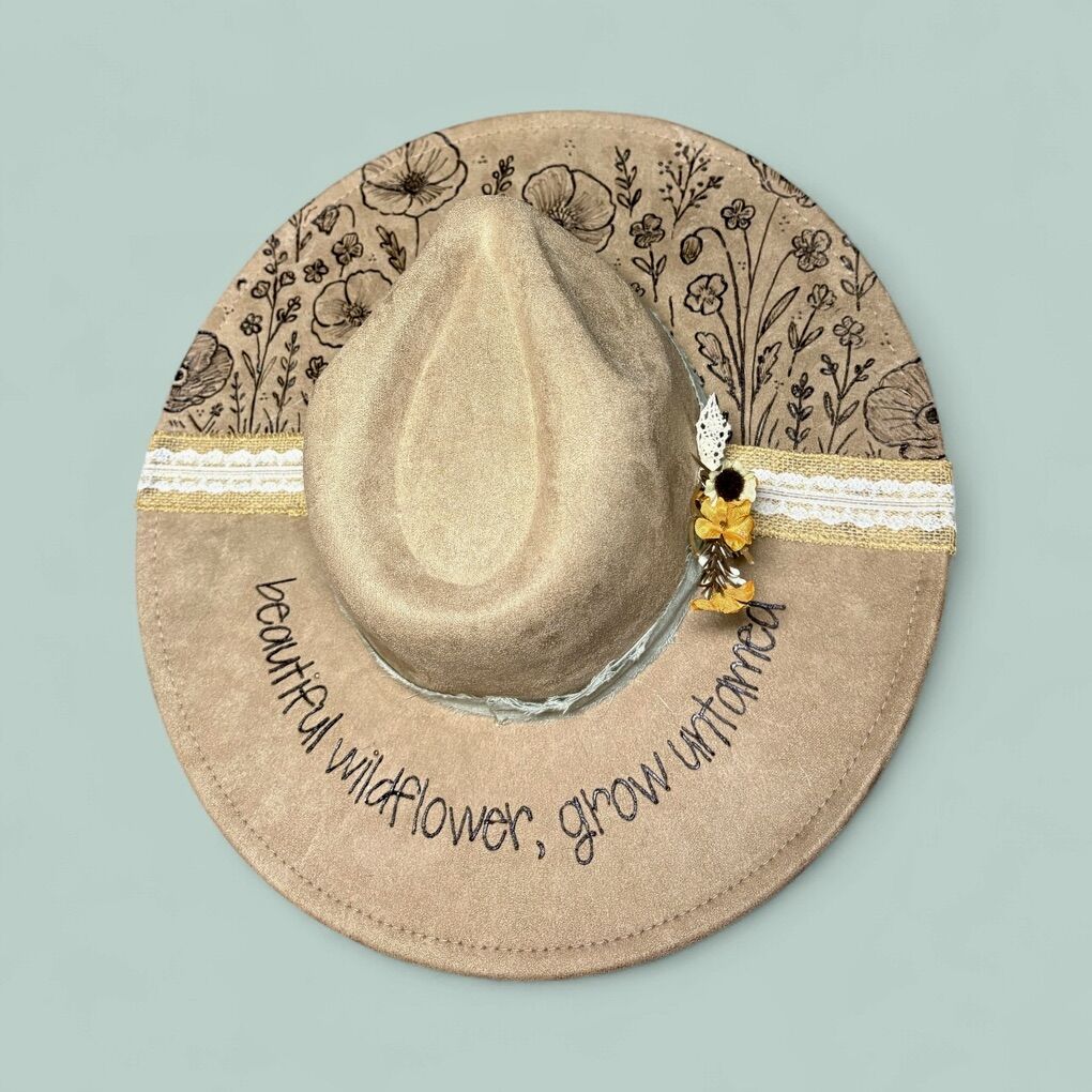 VenmoDecorated with an array of wildflowers and the quite “beautiful wildflower, grow untamed”, this is a one of a kind hand-burned, custom designed wide brim rancher hat. Complete with a colorful fabric brim and accentuated with lace and faux wildflowers, this is a perfect hat for any season!
