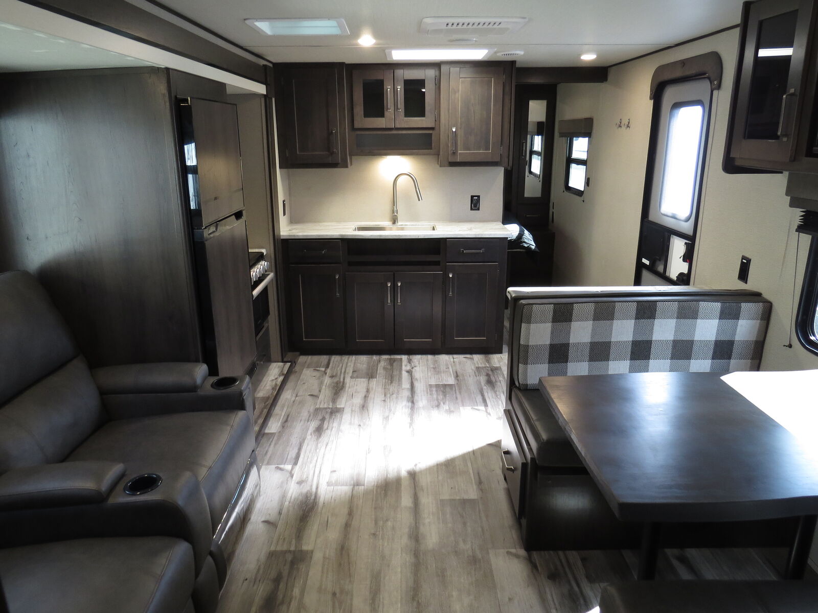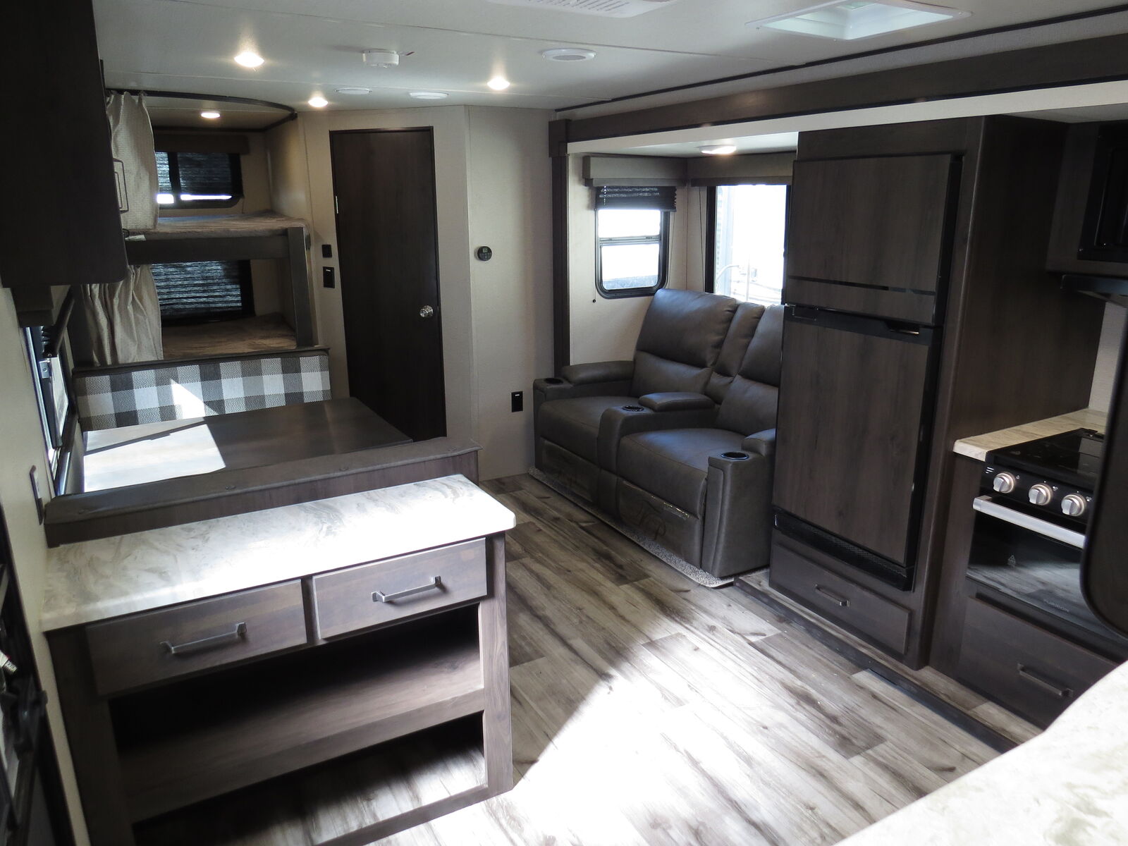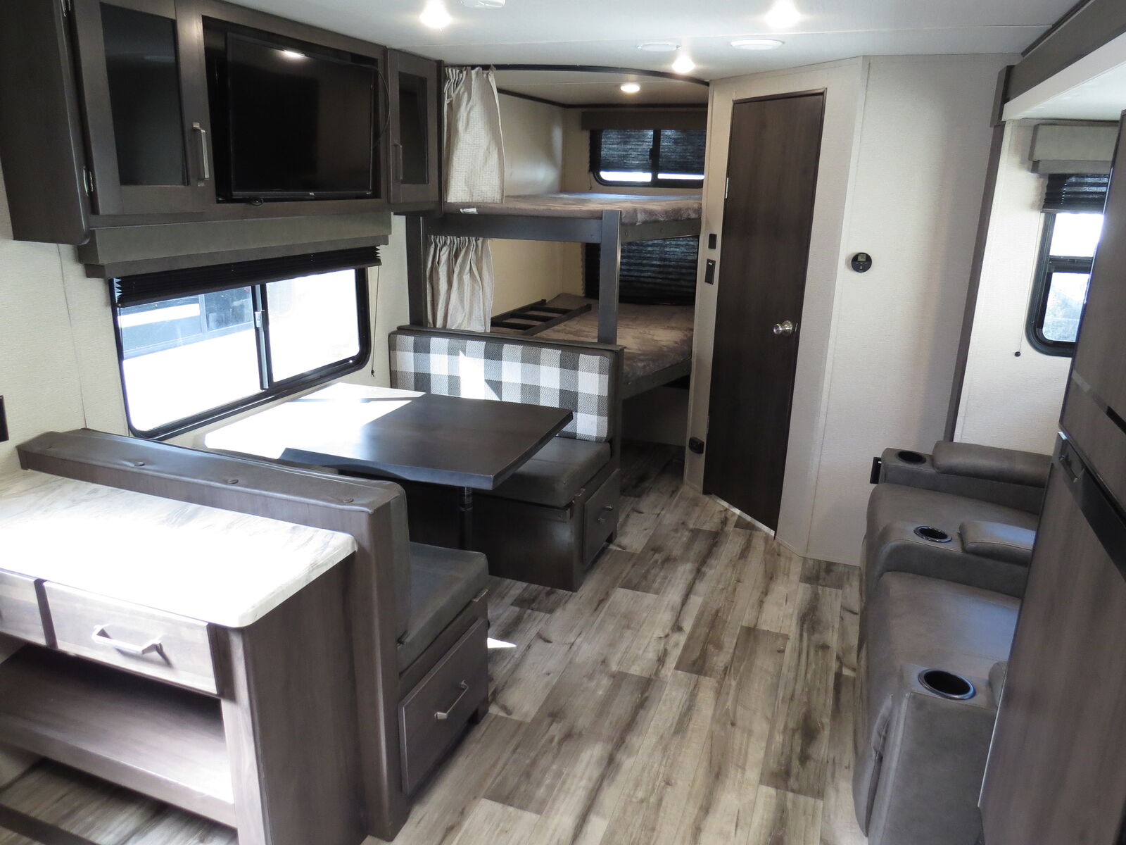 2 Big Rear Bunks, Solar, Arctic Package, Booth Dinette & Kitchen Slide, Front Queen bed!, Lots of storage! Side Kitchen, Corner Bathroom, Booth Dinette Makes down to bed, A/C unit and Heat.