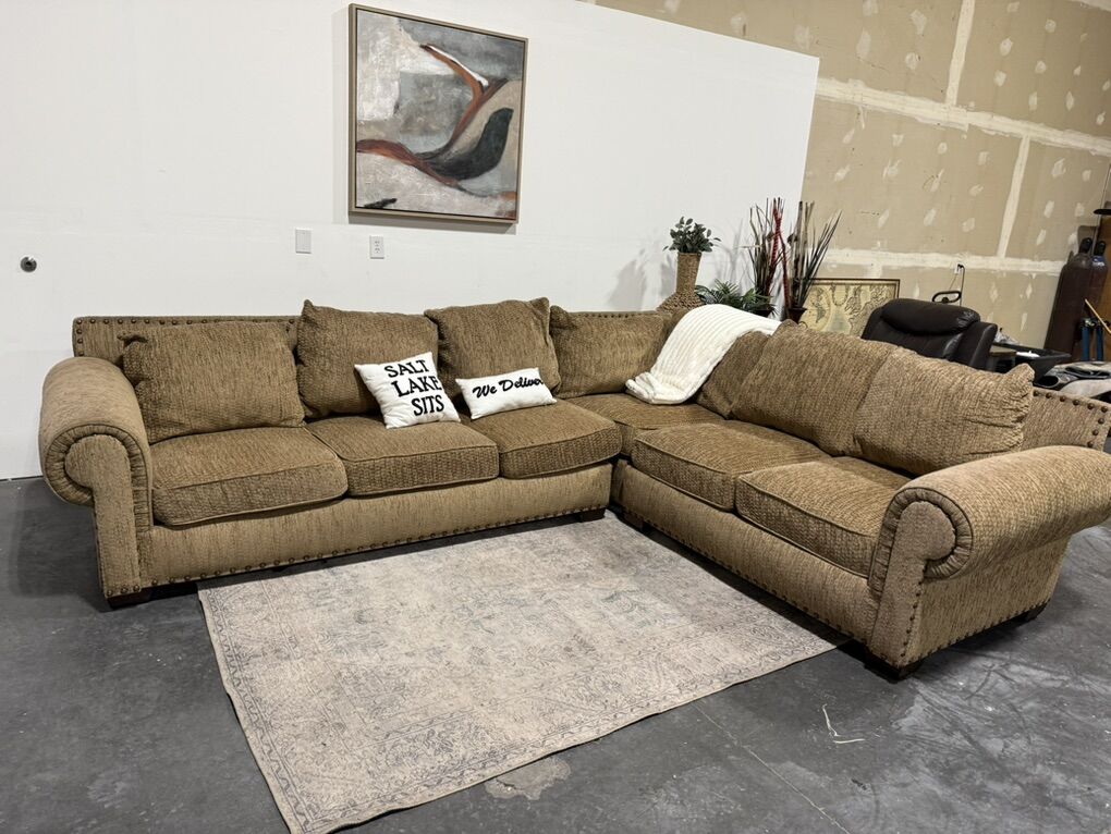 Follow Us On Instagram: SaltLakeSits Retail Price: $3000 Your Price: $699 ️ Large brown sectional with textured fabric and rolled arms. Features nailhead trim along the arms and back for a classic touch. Deep, supportive cushions make it a comfortable and inviting piece for a living room or family space. 🫧 Expertly Cleaned 🫧 Dimensions: 122” x 101”