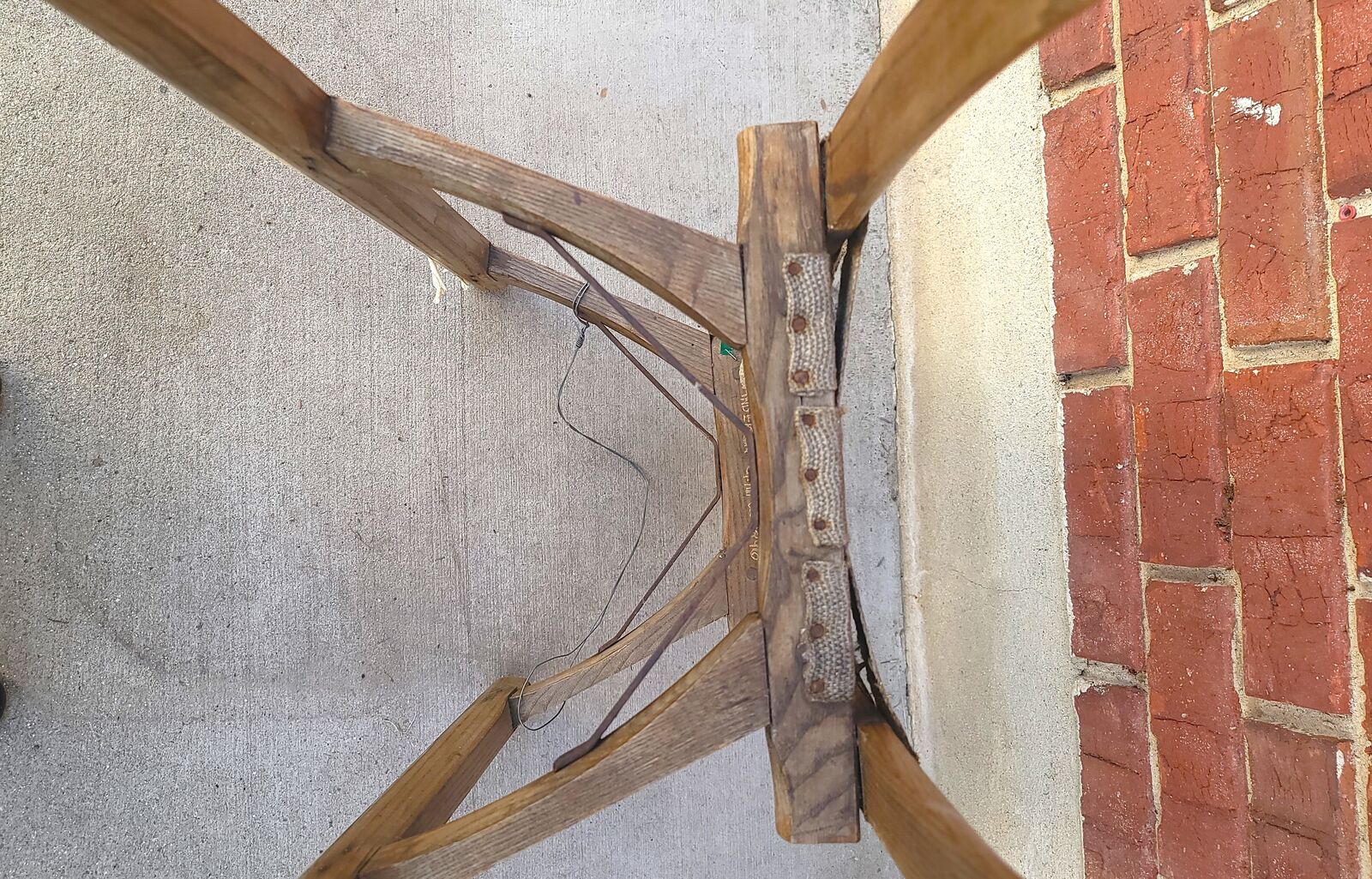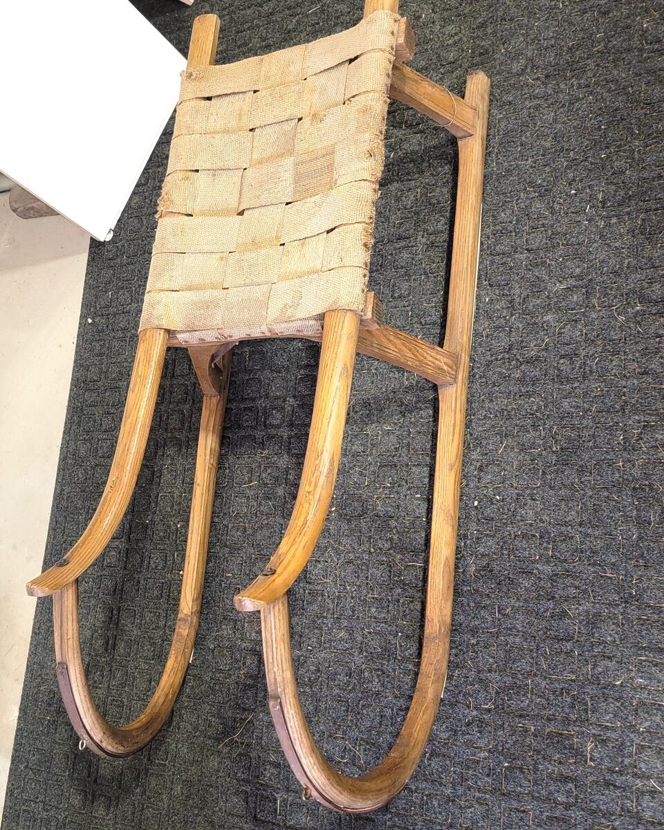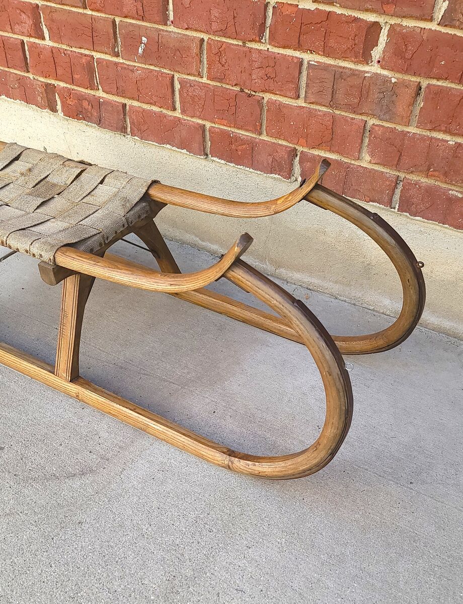 Antique Wooden sled form Austria with curled oak runners and steel treads. 40" long x 15.5" wide x 16.5" high. Crafted of sturdy oak. The sled has been used for display. Could be a beautiful coffee table or wall decor. Mesh webbing is very old. We used with a large basket on top to hold items. The basket is also for sale separately. See the listing for it.