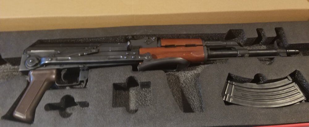 E&L brand AKMS, every metal part on the gun is steel, real wood furniture, aluminum mags. comes with the rifle in box, 3 standard 140 round capacity mid cap mags, 2000 round capacity electric winding hi cap drum mag, 2 AK style lipo batteries. In great condition, only used about 4 times. has 14mm threaded barrel with a muzzle break already installed. Shoots great with .25 bb's at 370-400 Fps. Pretty firm on price.