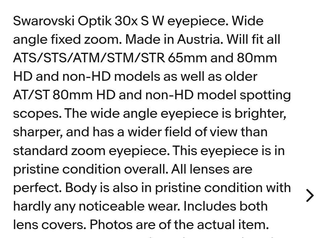 Swarovski 30x wide eye piece. Fits Vortex spotting scope too. See full description in pictures.