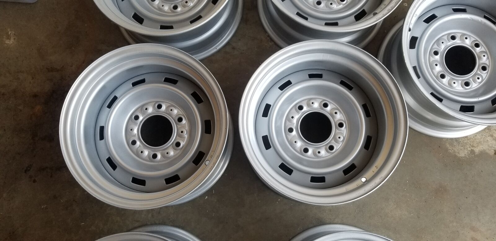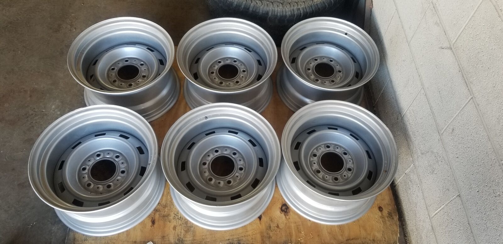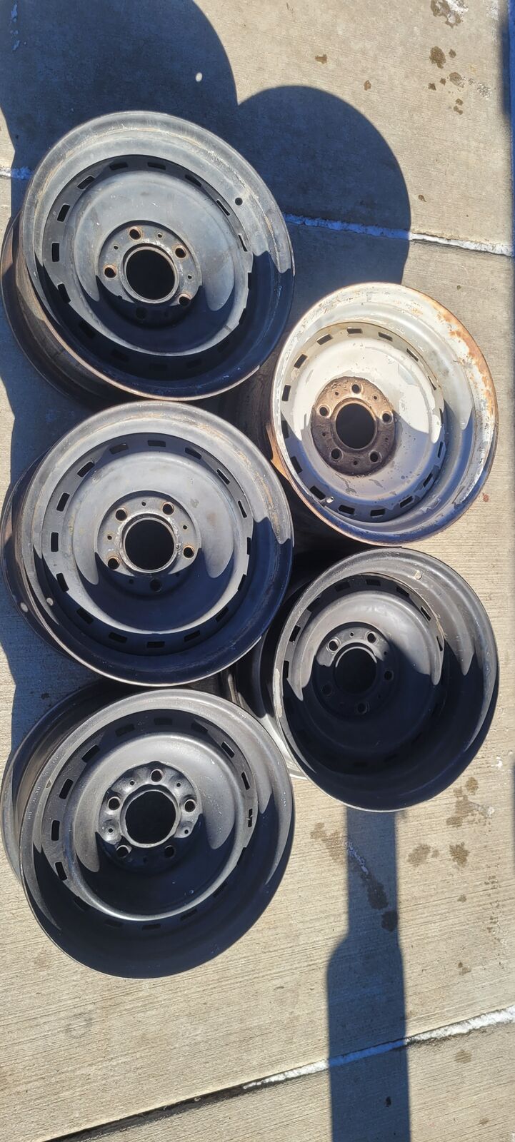 I also have (3) 5 on 5 x 15" x 6.5" Wide lug Factory Steel Rally wheels for vans, small trucks, unrestored, $65 Each or $175 for all 3 wheels
