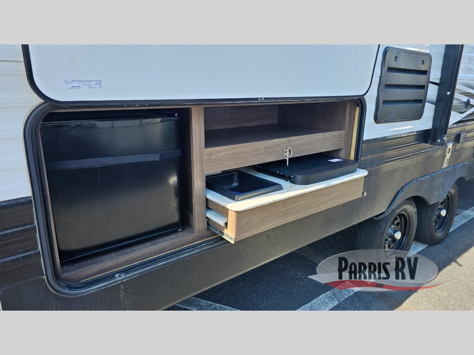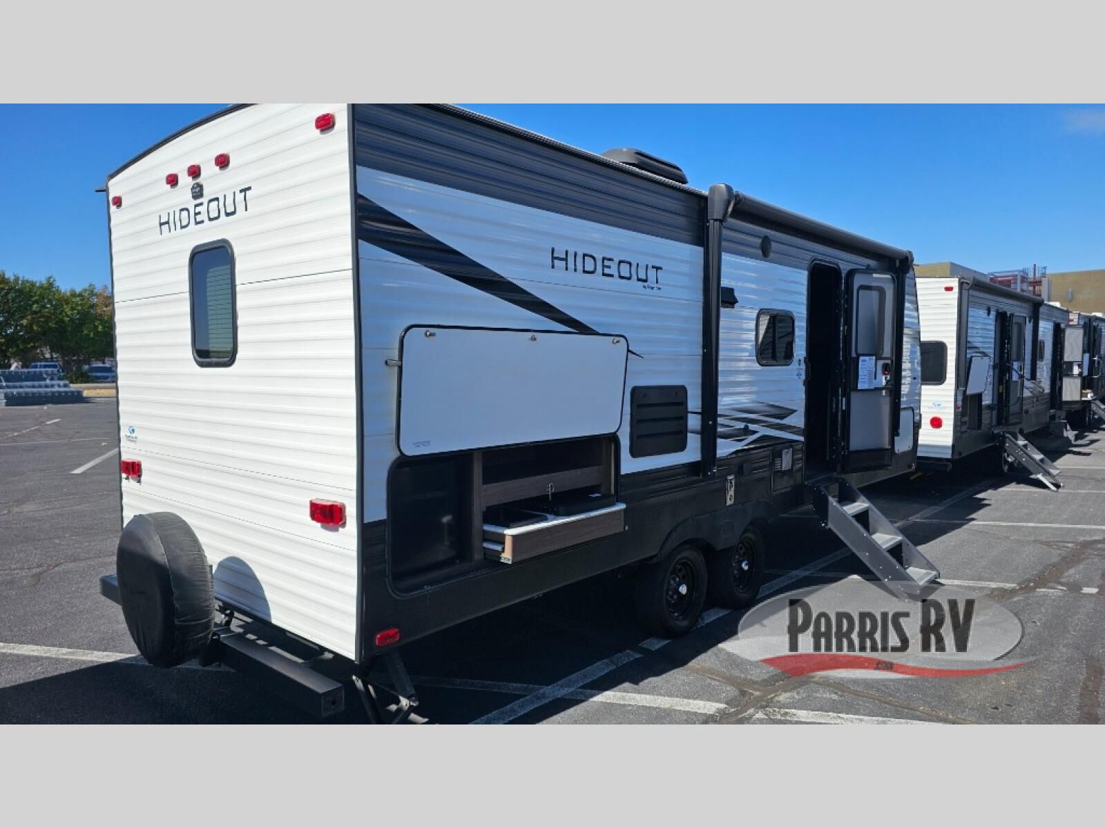 This Keystone Hideout travel trailer offers a spacious interior with a single slide, a large bathroom, and an outdoor kitchen for the chef in the family to enjoy! You can easily accommodate up to four people in this unit with the help of the U-shaped dinette that easily converts from a dining area into extra sleeping space at night. In the front of this trailer is a bedroom with a queen-size bed and accordion doors that close off the space and provide privacy for you while you sleep. When the weather is nice, you will want to take full advantage by spending your evenings snuggled up next to the campfire underneath the lighted adjustable power awning.