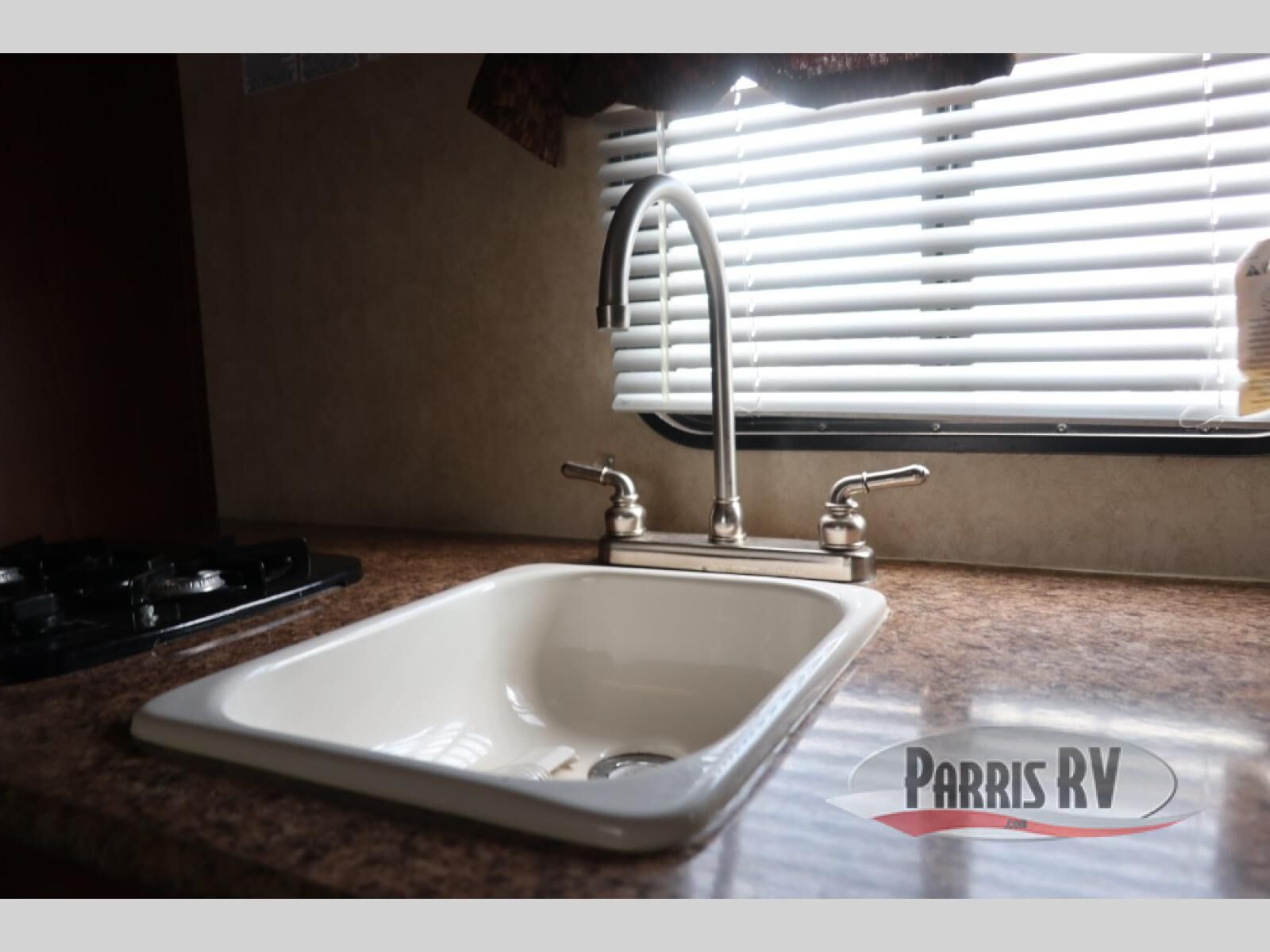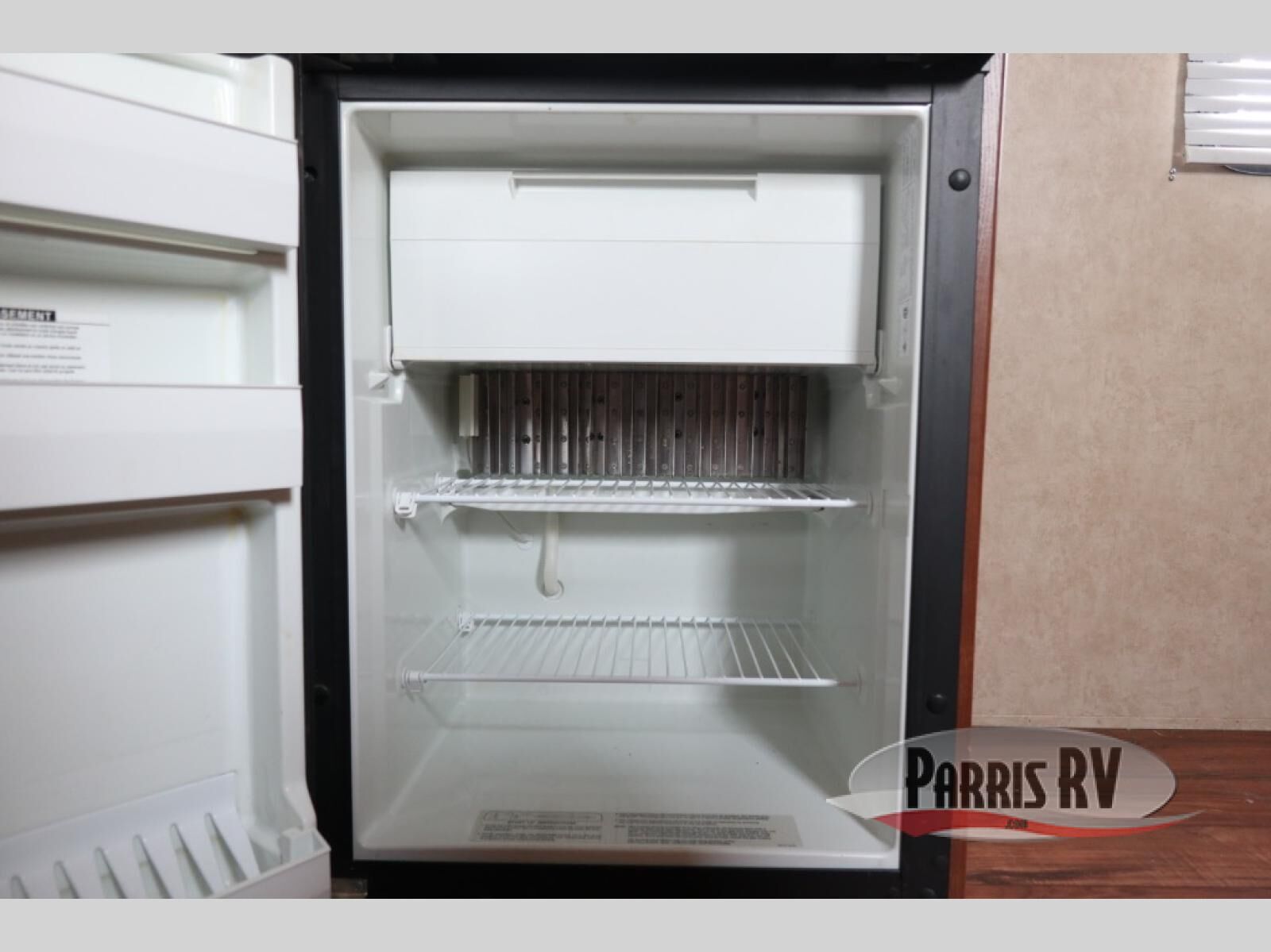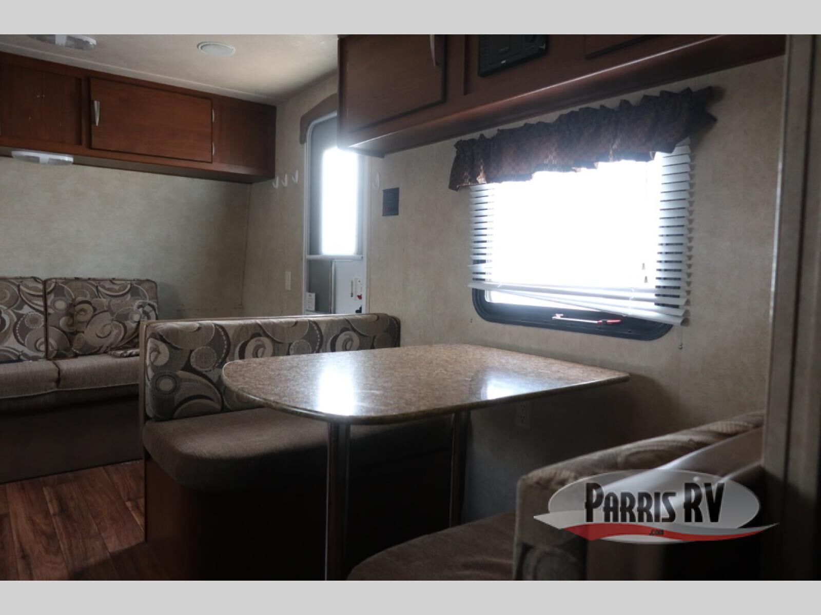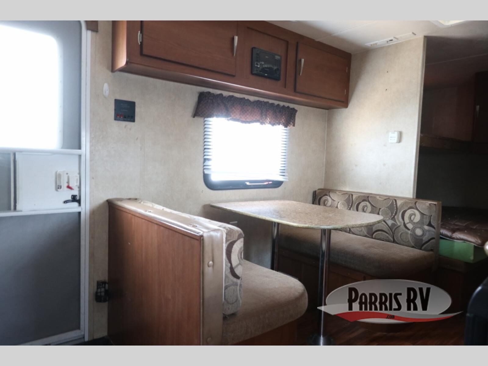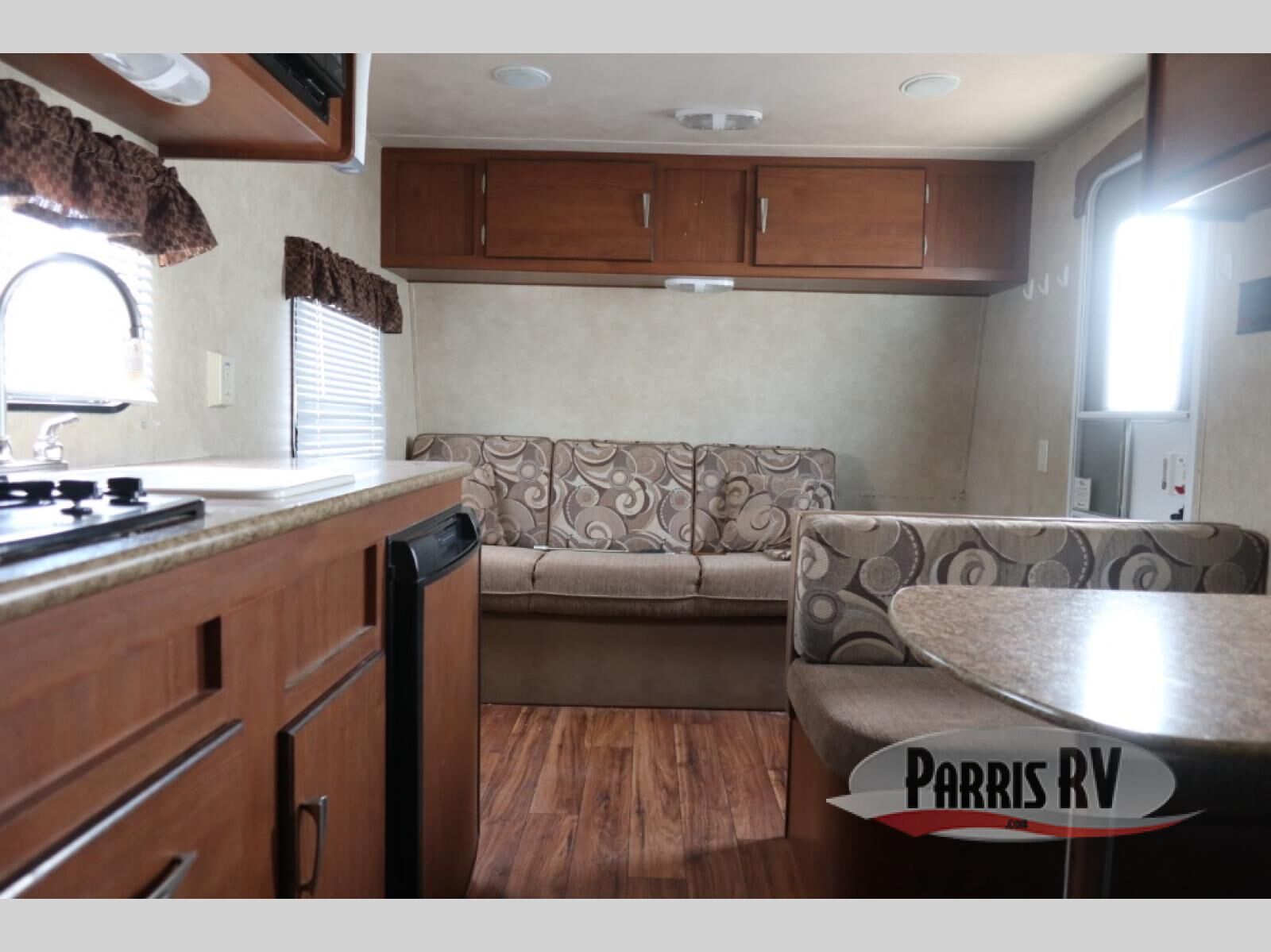 As you enter the travel trailer, there is a front sofa and an end table. One side of the trailer offers a dinette, and the other side has a refrigerator, microwave, sink, two burner range, and pantry.