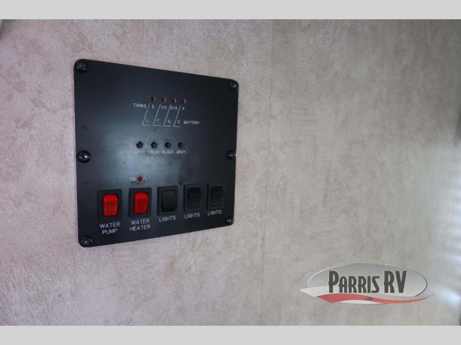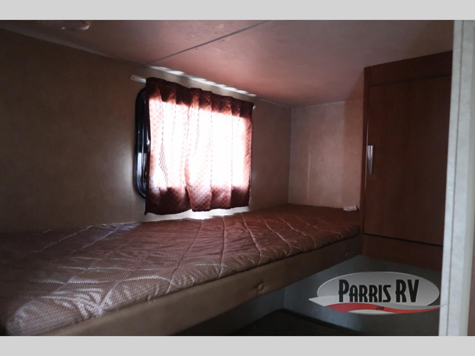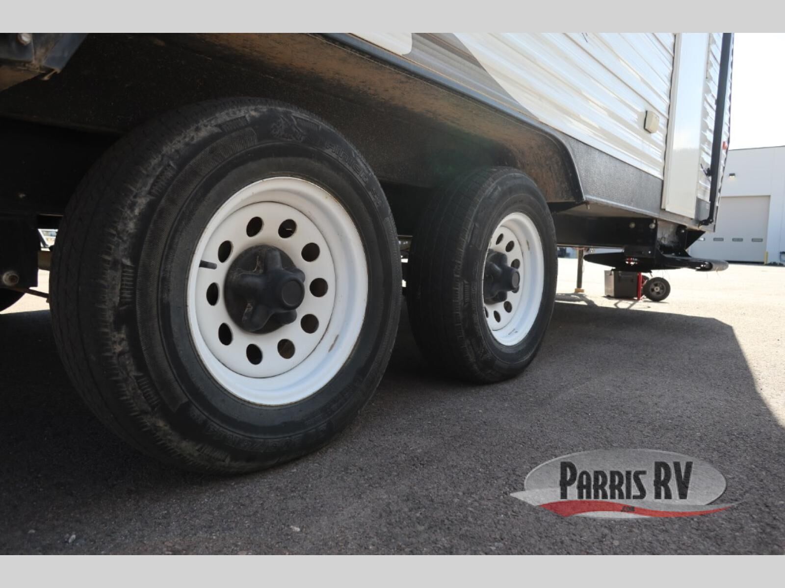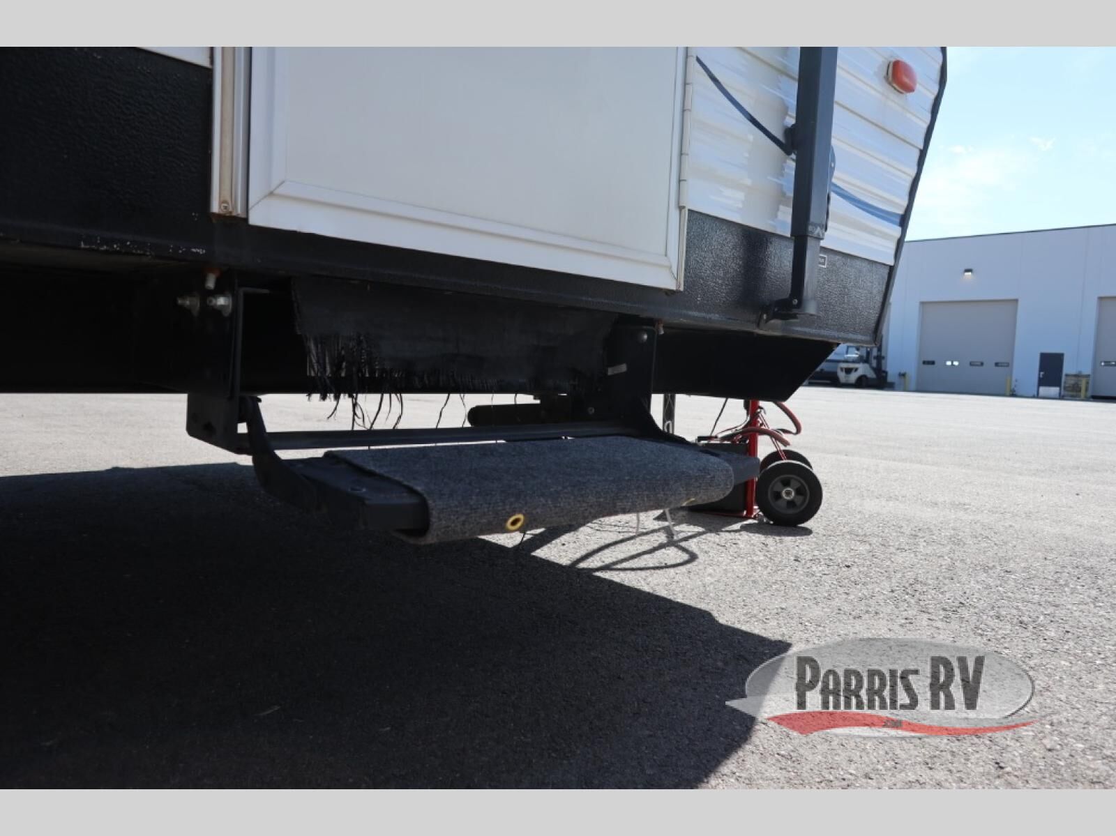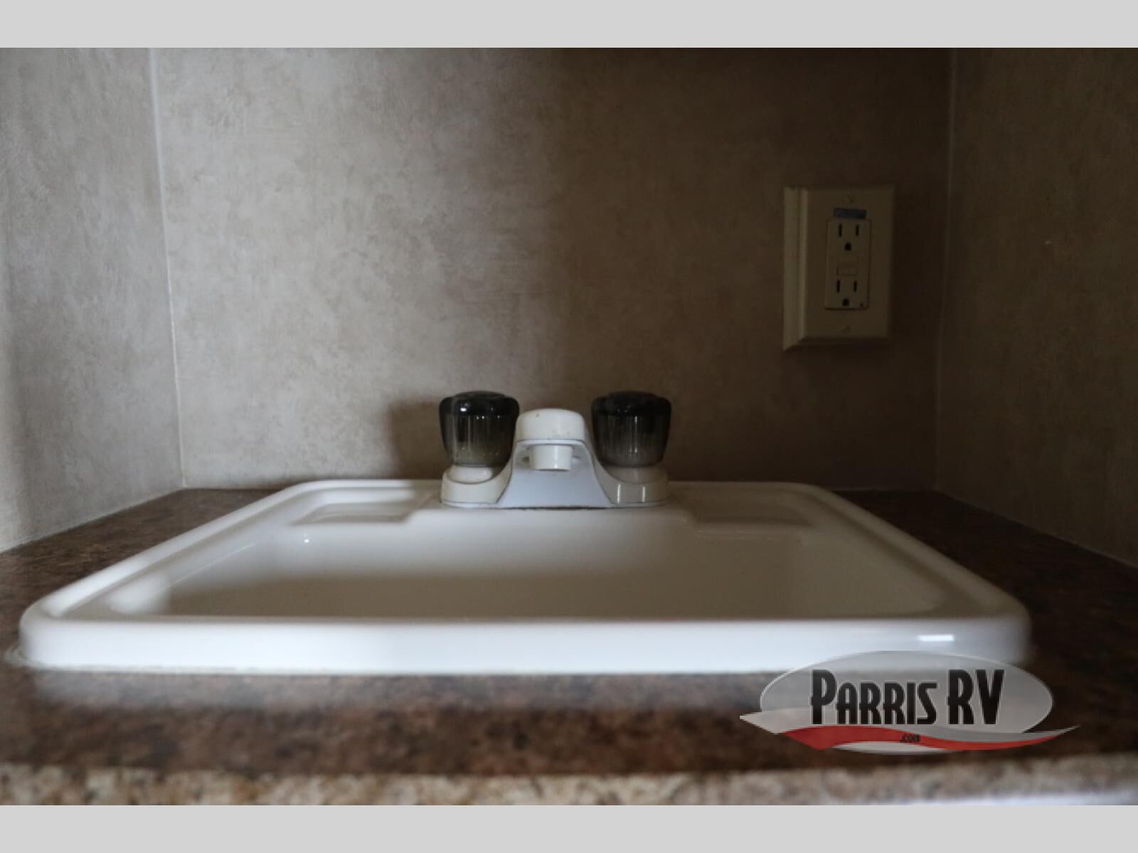 As you enter the travel trailer, there is a front sofa and an end table. One side of the trailer offers a dinette, and the other side has a refrigerator, microwave, sink, two burner range, and pantry.