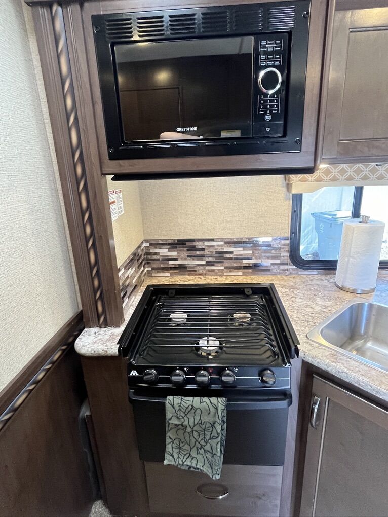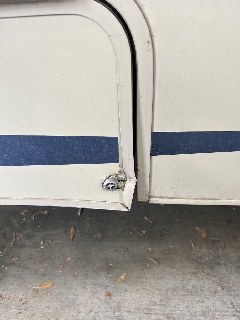 Wear and tear: Harv has typical wear and tear of some scuffs on the wall, etc. but no huge eye sores. The door to open the black and grey water pipes has a dent and only one side will lock (see in pictures above), but it doesn’t effect the pipes at all and the door stays closed with only one side latched. The awning has never worked as long as we’ve had it, it needs a new motor, we just never cared to use it so we didn’t get it fixed.